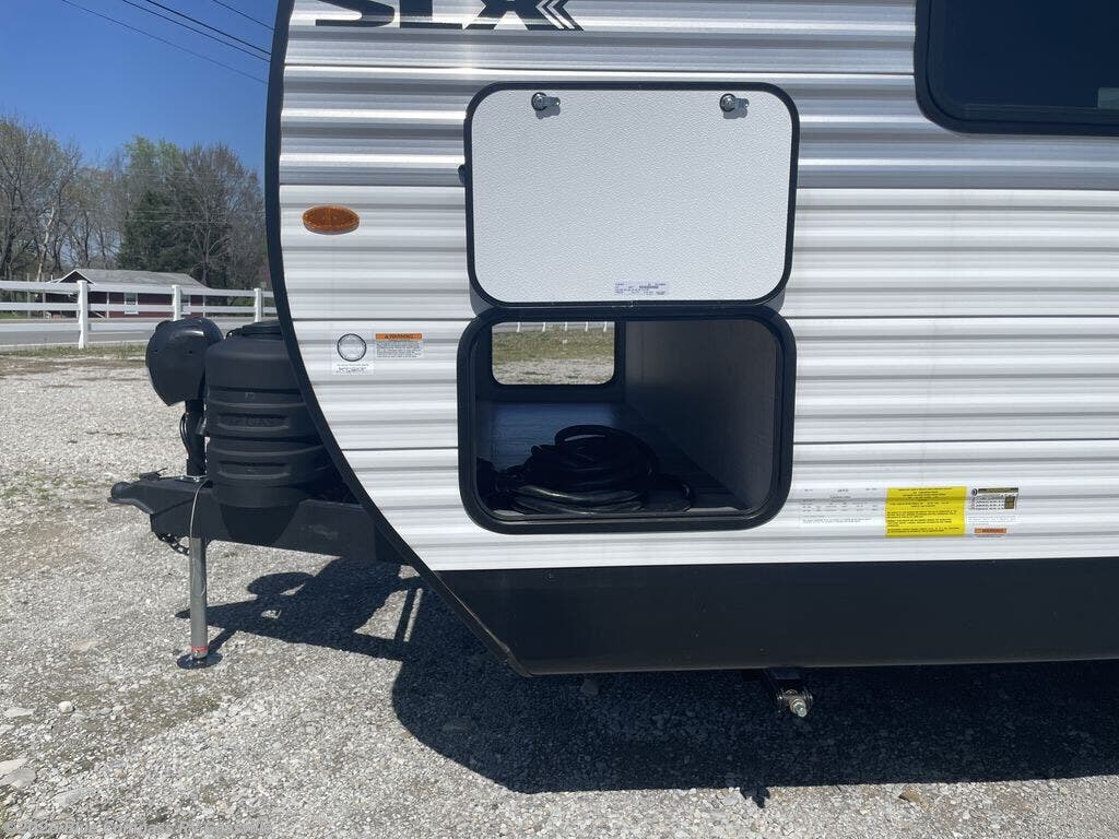 The Jayco Jay Flight SLX travel trailer is quite easy to own because it is lightweight for an easier towing experience. Built on a fully integrated A-frame with galvanized-steel, impact-resistant wheel wells, the Jay Flight SLX has quality at its very foundation. That quality continues on to the electric self-adjusting brakes, easy-lube hubs, Magnum Truss roof system, and LP quick connect. Some of what the mandatory Customer Value Package includes is backup camera prep, Keyed-Alike entry and baggage doors, marine grade exterior speakers, and an on-demand tankless water heater.