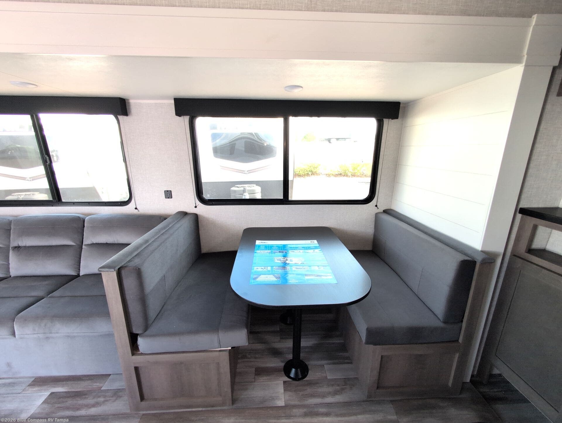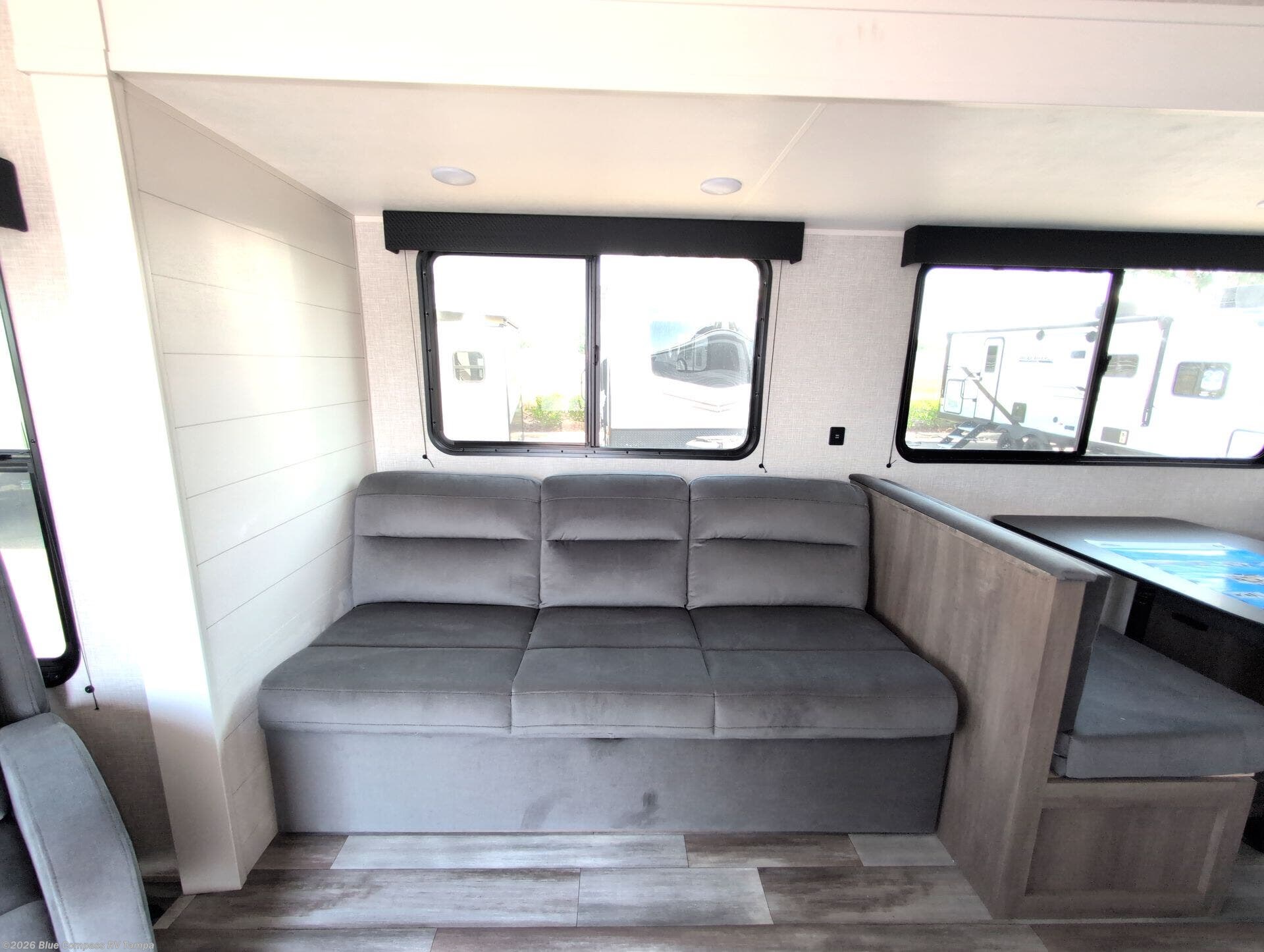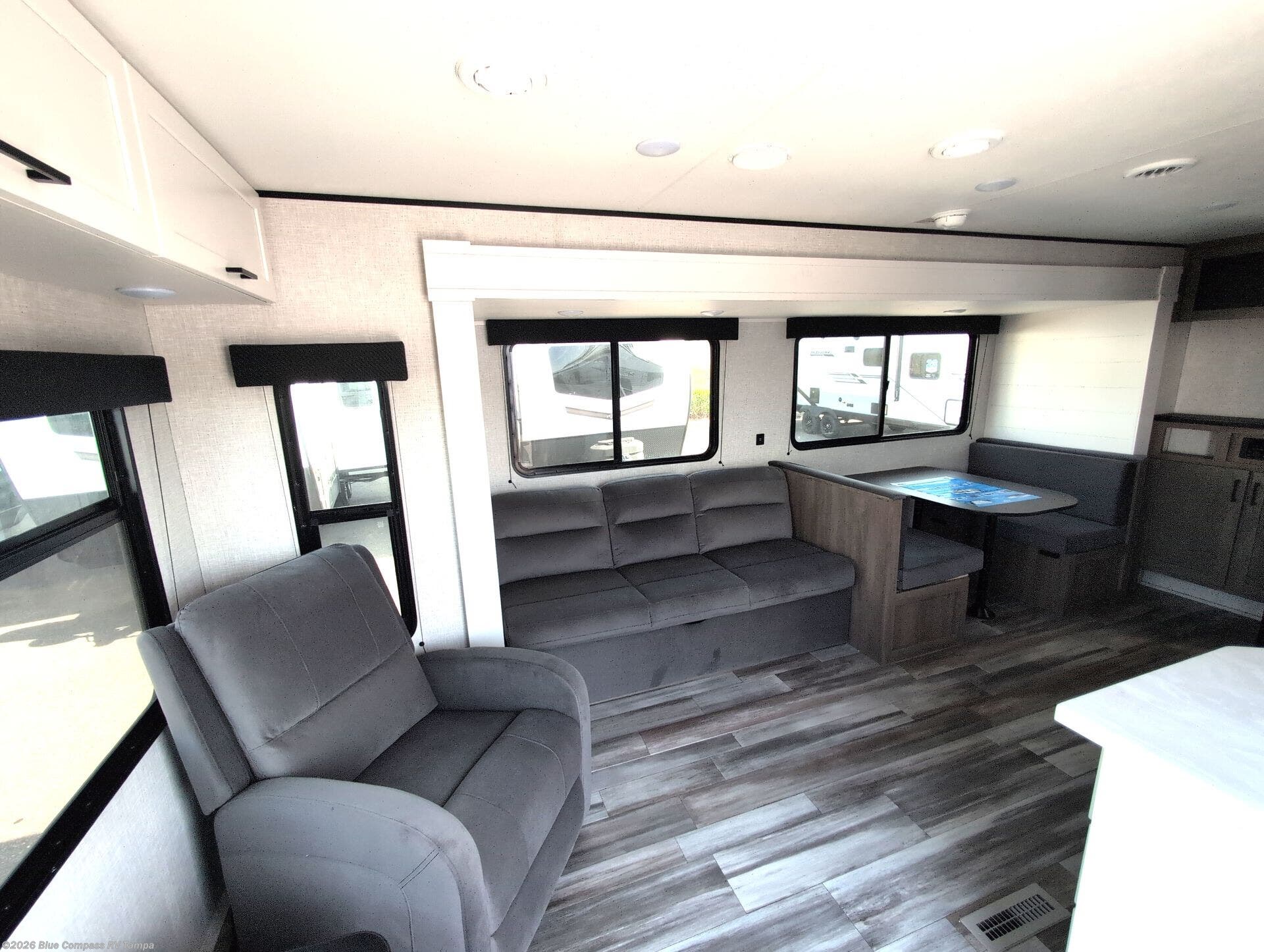 You can comfortably sleep up to six people in this trailer thanks to the RV queen bed in the front bedroom, plus the booth dinette and jack-knife sofa in the main living area! The chef of your crew will have a three burner cooktop and microwave oven to prepare meals, and everyone can store their favorite drinks in the 8 cu. ft. 12V refrigerator. The walk-through bath is spacious and includes a radius shower, toilet, a sink, and linen closet and is the full width of the unit. The outside storage will let you bring along camp chairs and games, fishing poles and more, plus the 18' 3" power awning with LED lights will create a nice place to gather in the evenings!