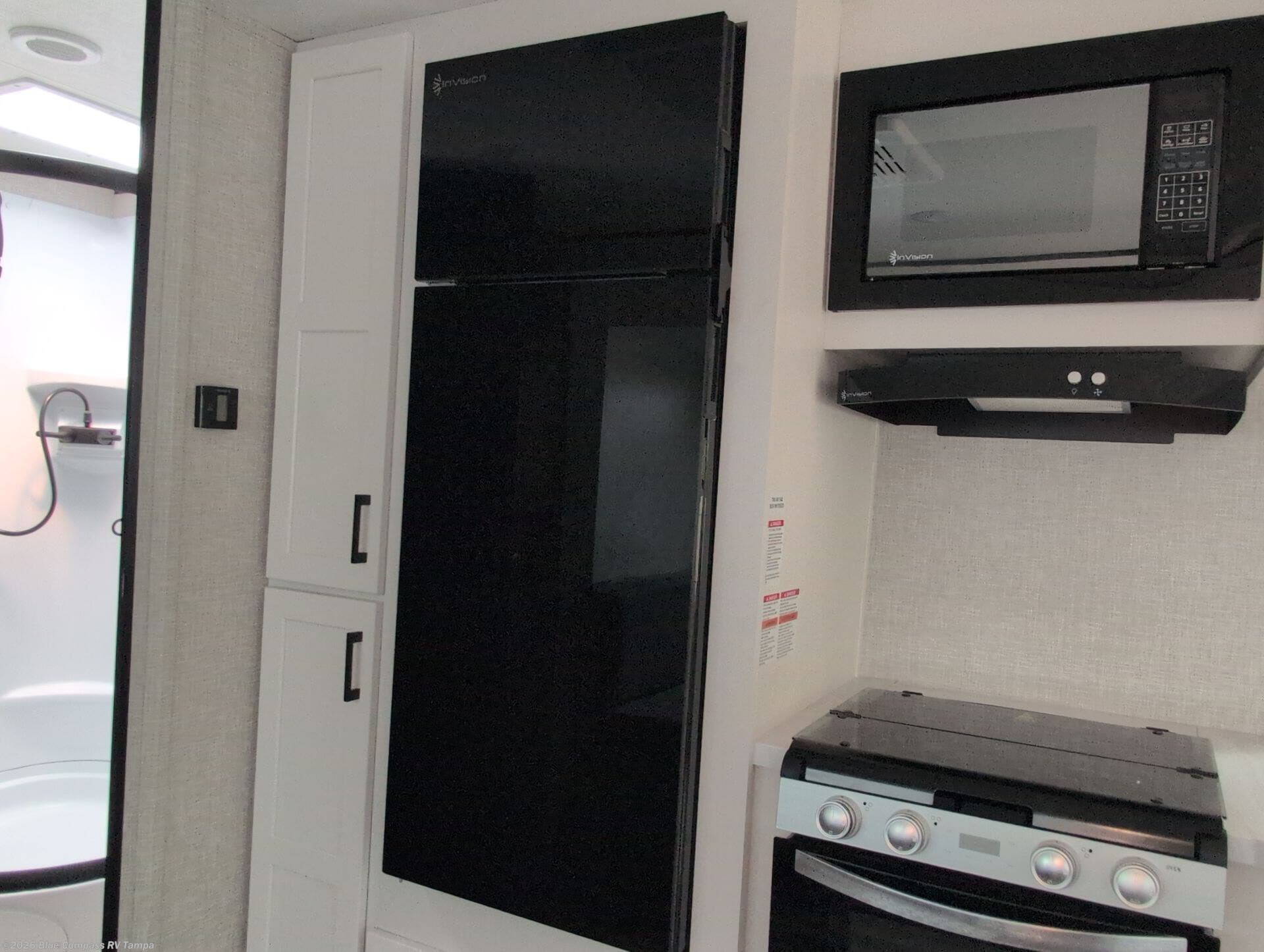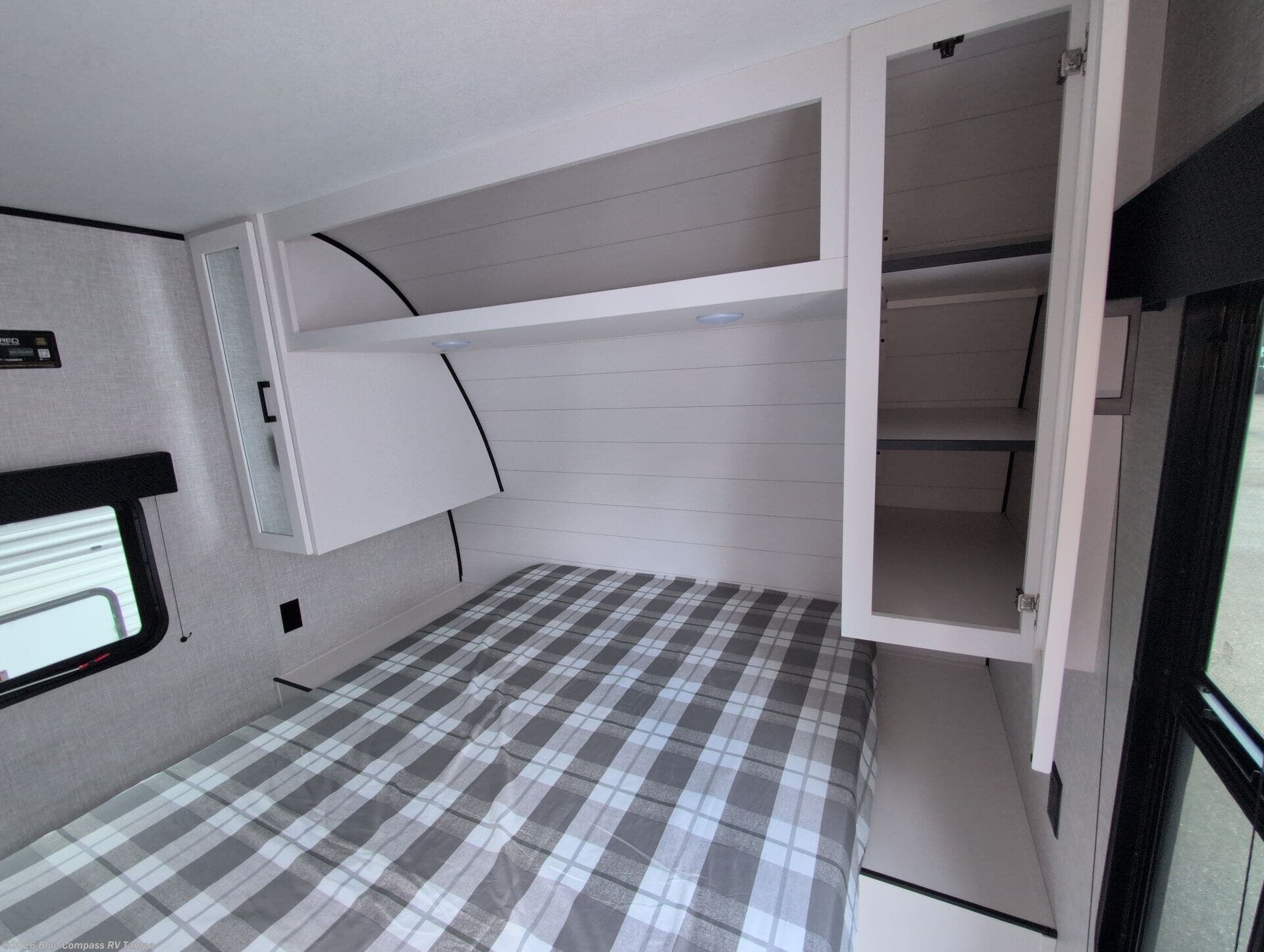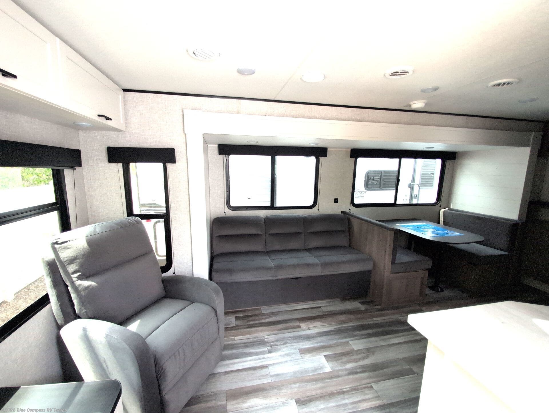 You can comfortably sleep up to six people in this trailer thanks to the RV queen bed in the front bedroom, plus the booth dinette and jack-knife sofa in the main living area! The chef of your crew will have a three burner cooktop and microwave oven to prepare meals, and everyone can store their favorite drinks in the 8 cu. ft. 12V refrigerator. The walk-through bath is spacious and includes a radius shower, toilet, a sink, and linen closet and is the full width of the unit. The outside storage will let you bring along camp chairs and games, fishing poles and more, plus the 18' 3" power awning with LED lights will create a nice place to gather in the evenings!