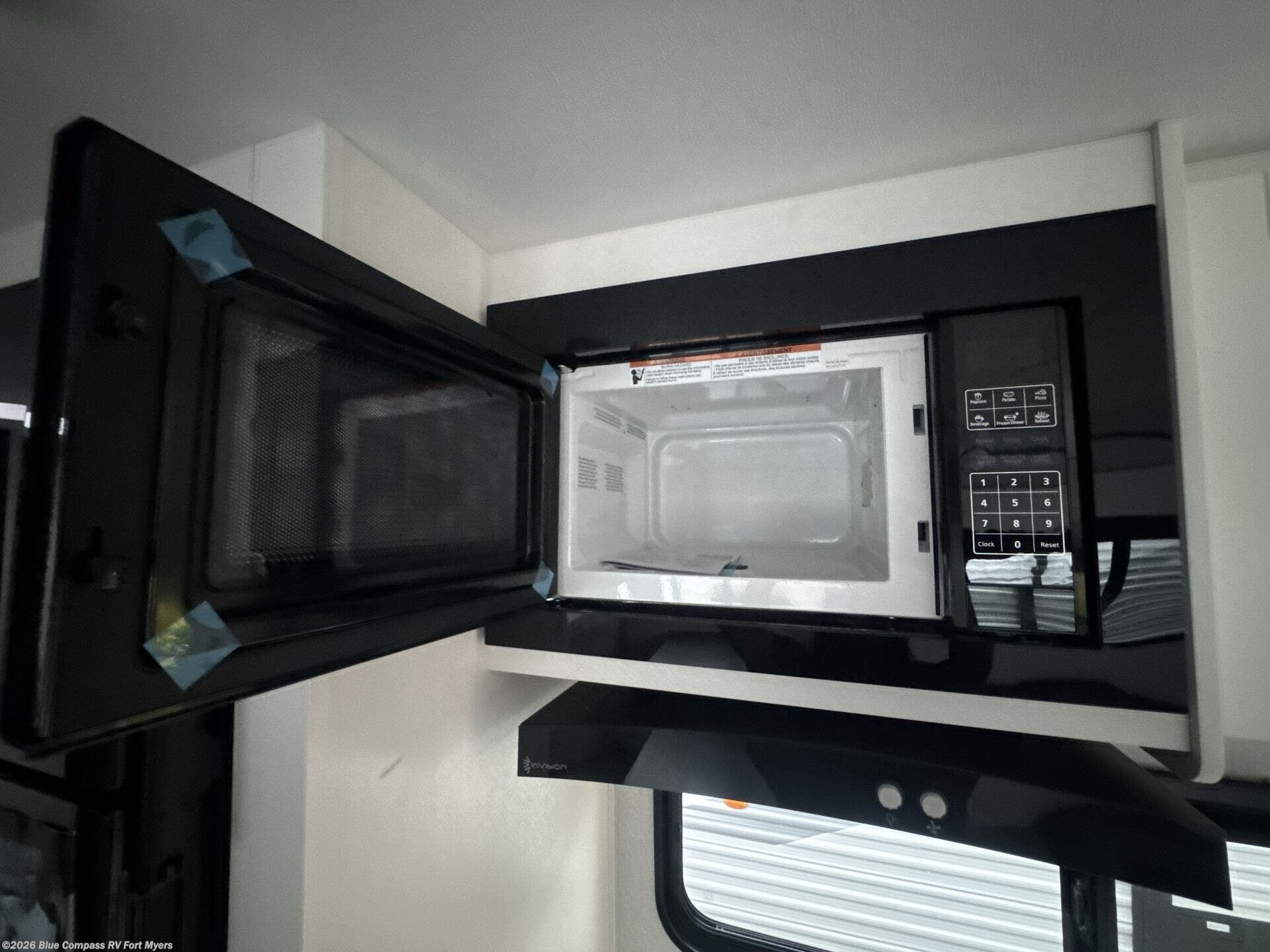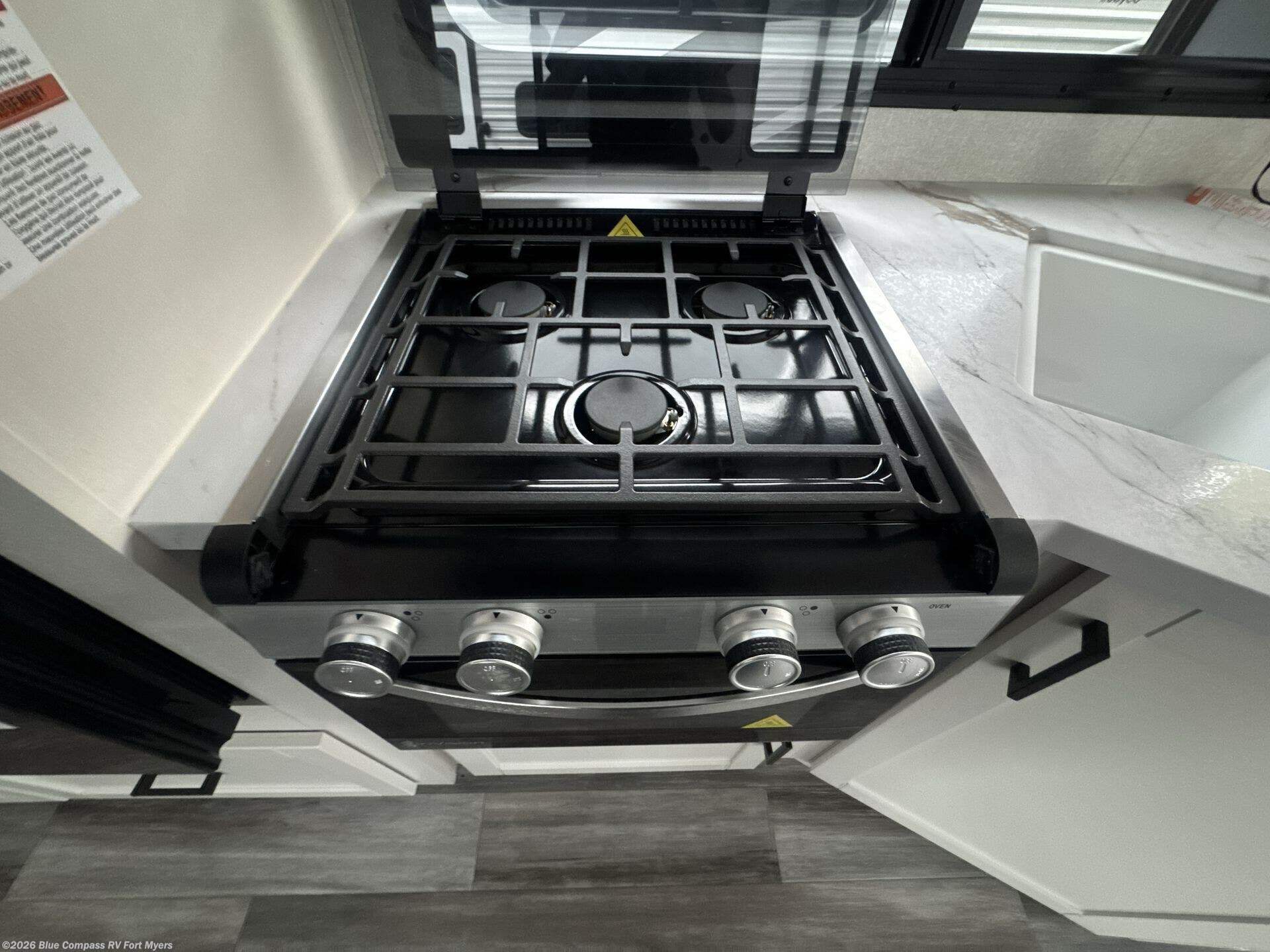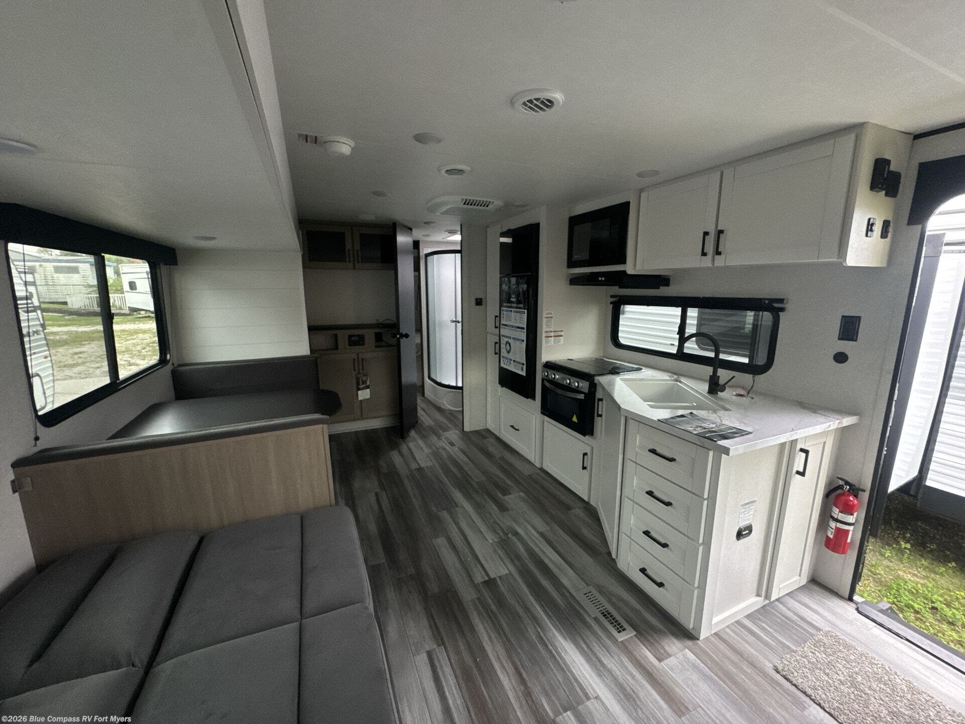 You can comfortably sleep up to six people in this trailer thanks to the RV queen bed in the front bedroom, plus the booth dinette and jack-knife sofa in the main living area! The chef of your crew will have a three burner cooktop and microwave oven to prepare meals, and everyone can store their favorite drinks in the 8 cu. ft. 12V refrigerator. The walk-through bath is spacious and includes a radius shower, toilet, a sink, and linen closet and is the full width of the unit. The outside storage will let you bring along camp chairs and games, fishing poles and more, plus the 18' 3" power awning with LED lights will create a nice place to gather in the evenings!
