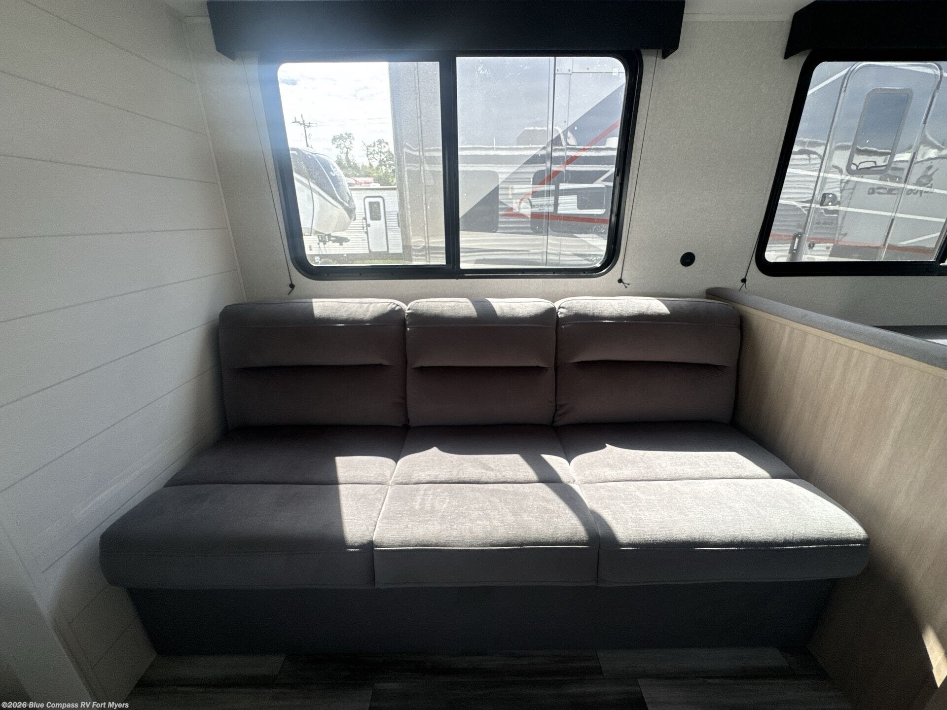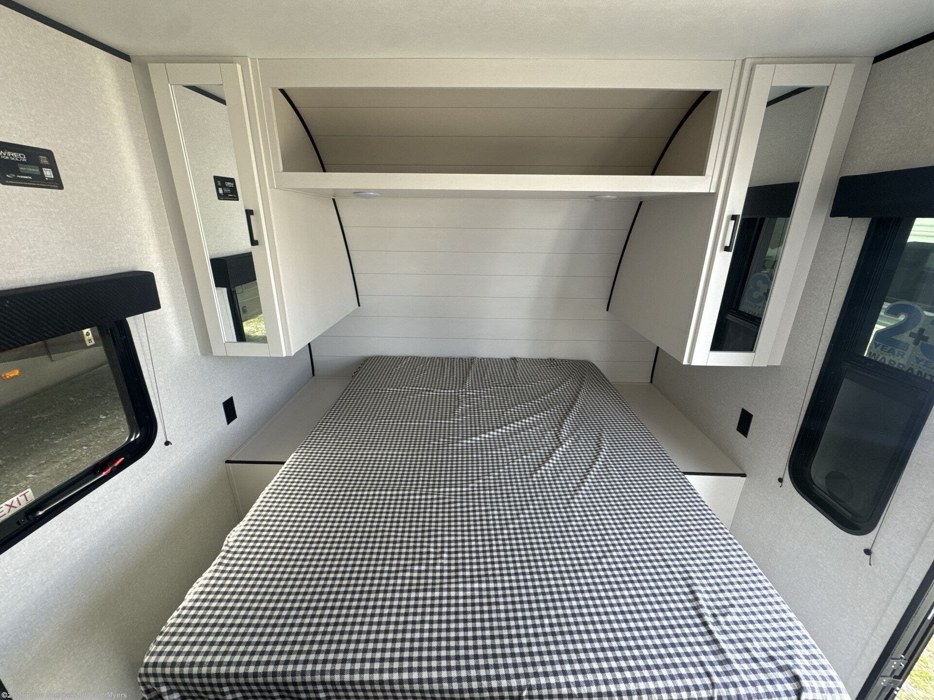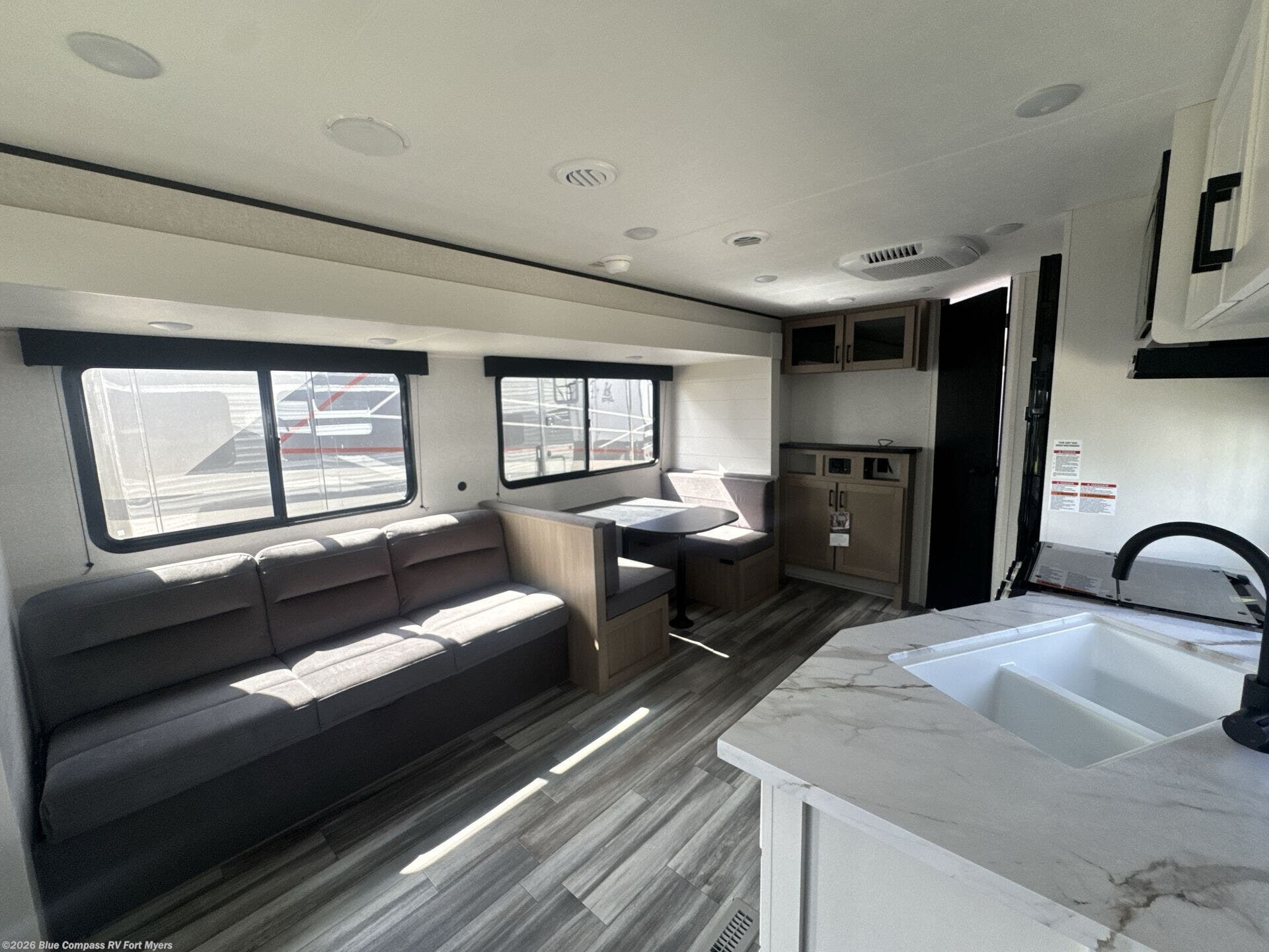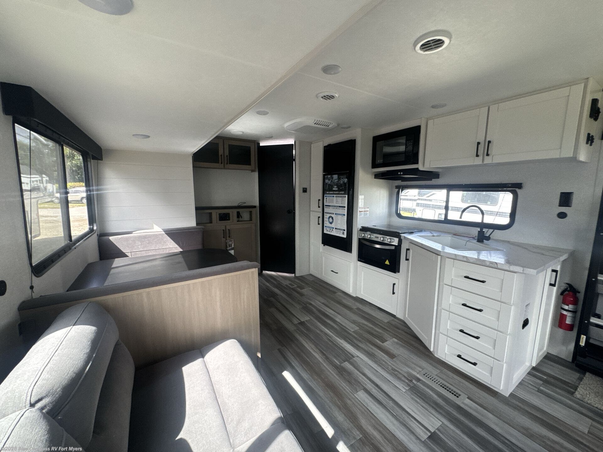 You can comfortably sleep up to six people in this trailer thanks to the RV queen bed in the front bedroom, plus the booth dinette and jack-knife sofa in the main living area! The chef of your crew will have a three burner cooktop and microwave oven to prepare meals, and everyone can store their favorite drinks in the 8 cu. ft. 12V refrigerator. The walk-through bath is spacious and includes a radius shower, toilet, a sink, and linen closet and is the full width of the unit. The outside storage will let you bring along camp chairs and games, fishing poles and more, plus the 18' 3" power awning with LED lights will create a nice place to gather in the evenings!