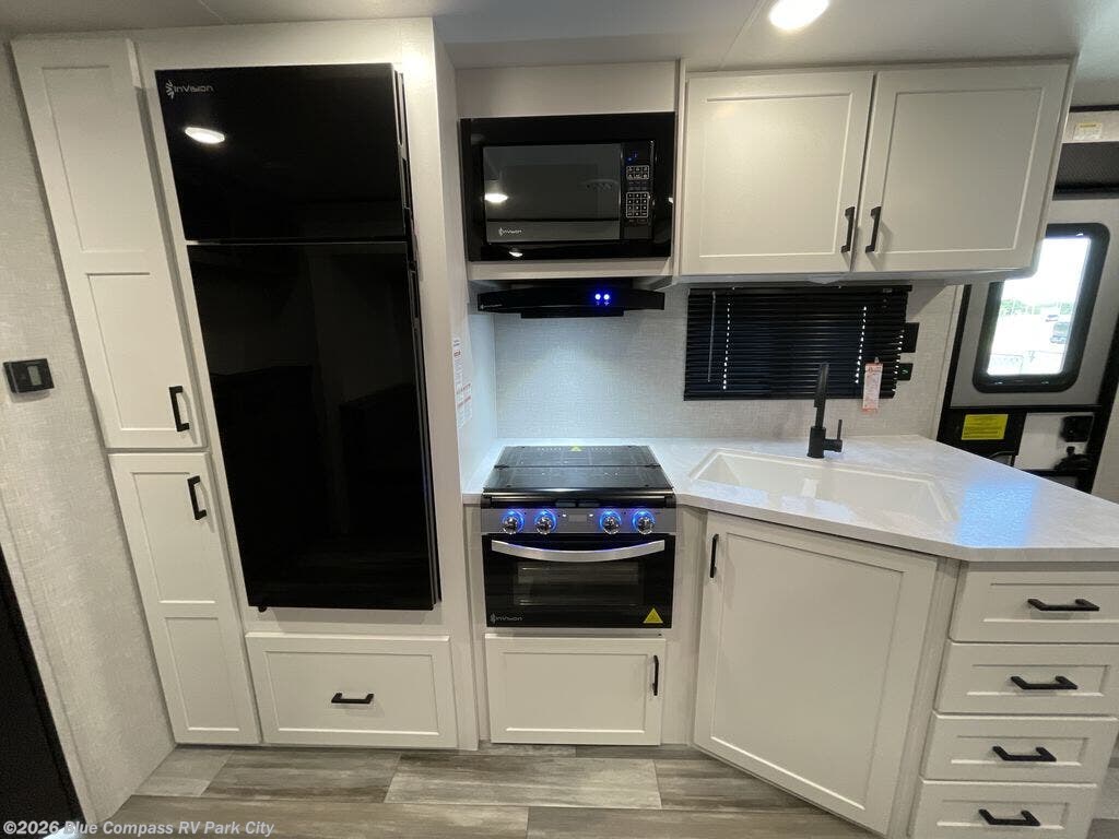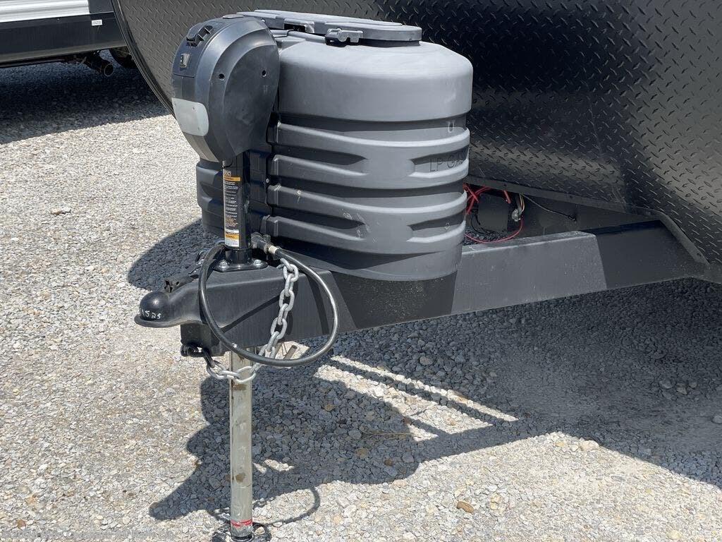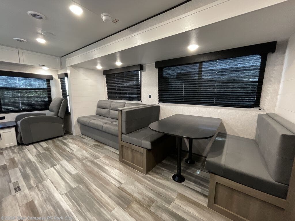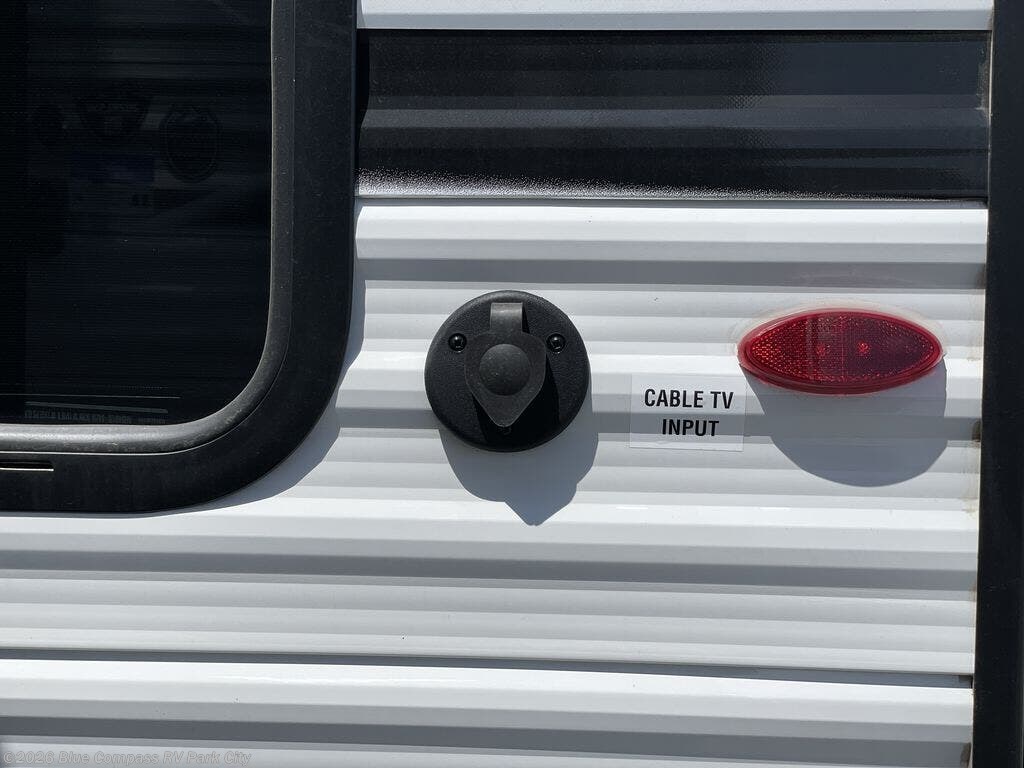 You can comfortably sleep up to six people in this trailer thanks to the RV queen bed in the front bedroom, plus the booth dinette and jack-knife sofa in the main living area! The chef of your crew will have a three burner cooktop and microwave oven to prepare meals, and everyone can store their favorite drinks in the 8 cu. ft. 12V refrigerator. The walk-through bath is spacious and includes a radius shower, toilet, a sink, and linen closet and is the full width of the unit. The outside storage will let you bring along camp chairs and games, fishing poles and more, plus the 18' 3" power awning with LED lights will create a nice place to gather in the evenings!