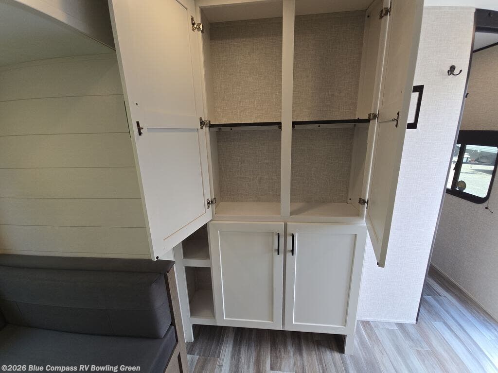 Loads of fun like hiking, fishing, and playing outdoor camping games are waiting for you to make that reservation, hitch up and head out! This trailer allows the owners to sleep in privacy behind the space saving sliding door on a 60" x 75" queen bed. And the kids or grandkids can sleep on the double-size bunks in the rear next to the full bathroom including a tub/shower. They even have a wardrobe nearby for their things. The slide out jackknife sofa and U-shaped dinette offers more floor space, a place to relax and dine, plus you can play games at the dinette. This model also includes an exterior refrigerator so you can grab a cold drink while under the 16' power awning!