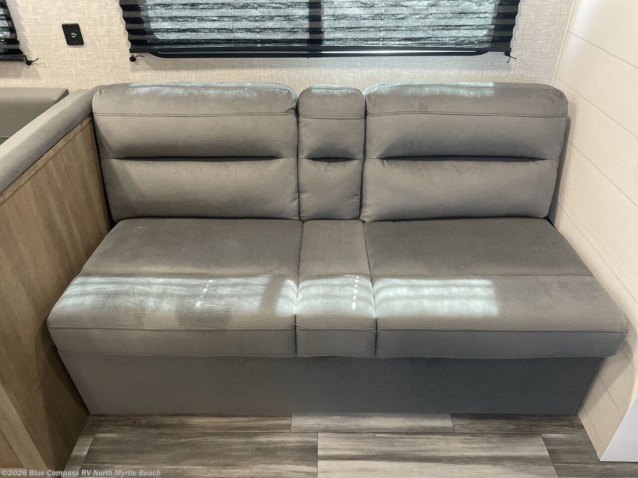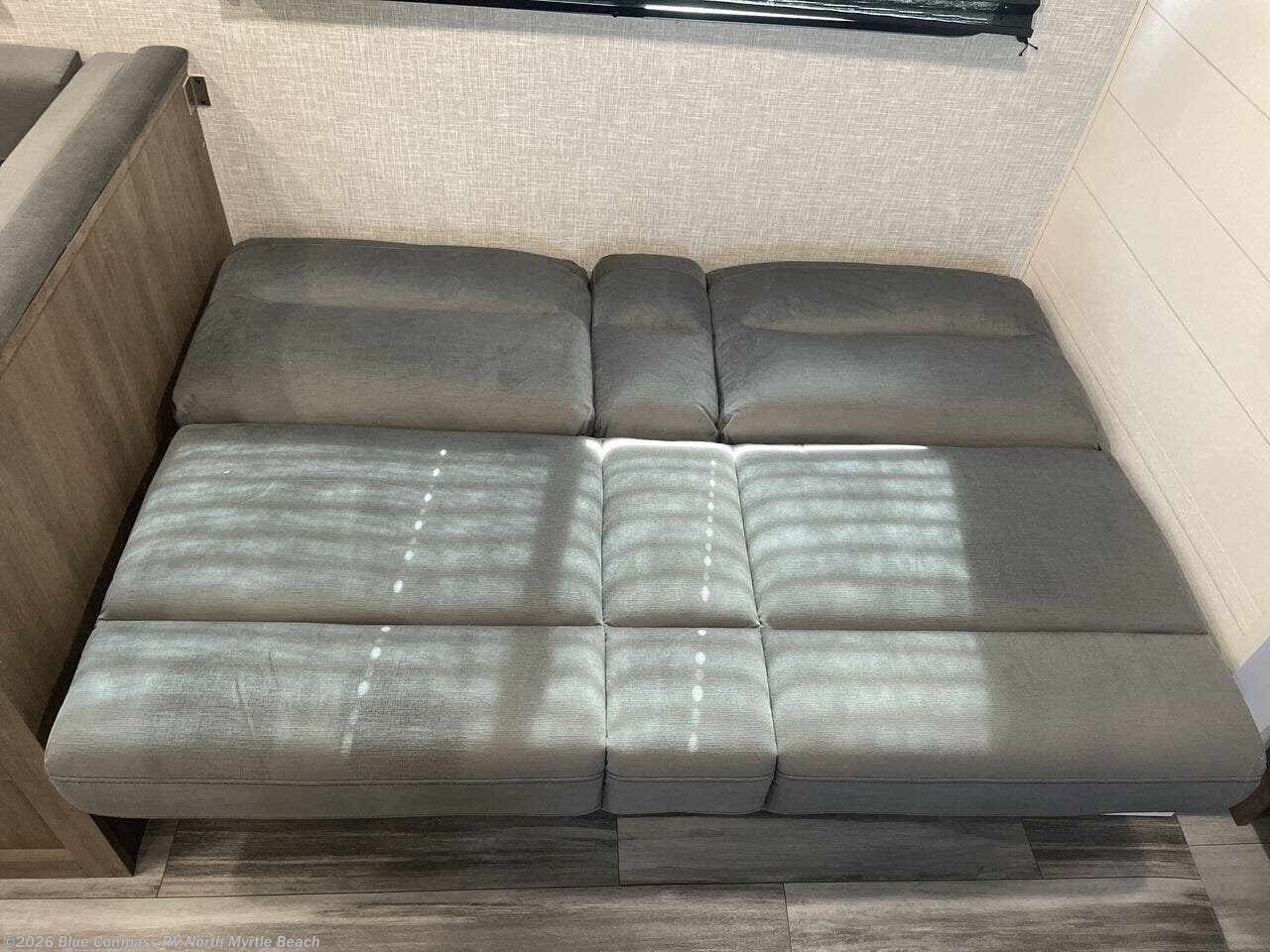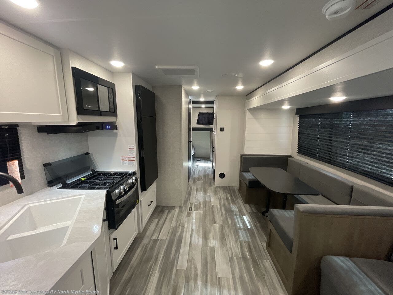 Spacious, accommodating, comfortable; start camping in this trailer that offers something for everyone! The popular bunkhouse offers two 31" x 75" bunk beds above a convertible sofa with 60" x 75" queen mattress, a wardrobe, and a cargo door for easy access. The kitchen provides full amenities to make delicious home cooked meals. The U-shaped dinette and Jack-knife sofa slide give you more floor space to stretch out and provide extra sleeping space, plus you will appreciate the bench/storage as you walk into the trailer. And the large pantry will hold all the goodies for the big group. The front bedroom gives you a 60" x 75" queen bed to sleep on, dual wardrobes and an overhead shelf to place your clothing and things, plus a space saving door to close for privacy.
