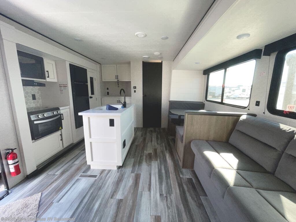The whole gang can join along on camping trips in this triple slide out travel trailer! There is a rear private bunkhouse with a bunk bed and J-cube futon sofa below plus a second bunk bed and storage below to help keep this space tidy. You'll find your own space in the front private bedroom, which also includes a queen bed and dual wardrobes. The middle kitchen and living room will be a favorite place to come together since there is a jack-knife sofa and booth dinette, a kitchen island, plus a fully-equipped kitchen to make meals each day. There is also an exterior camp kitchen when you want fresh air!