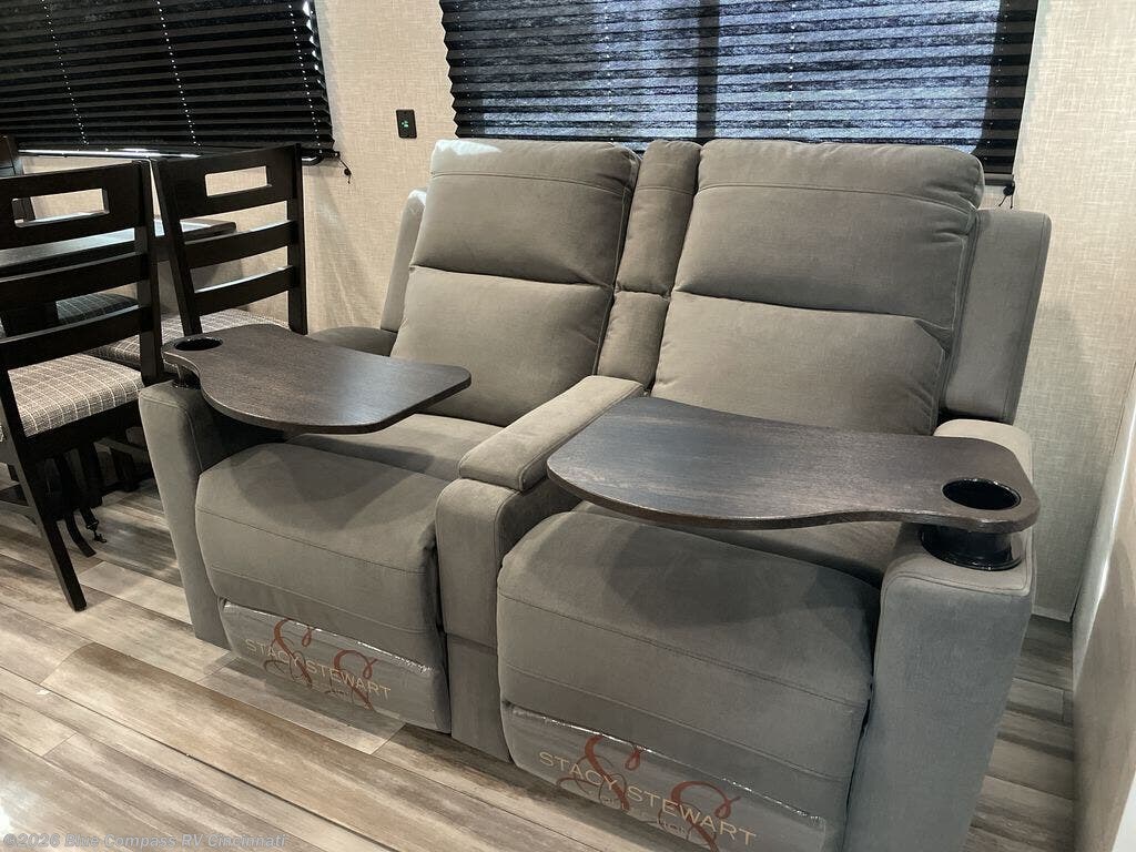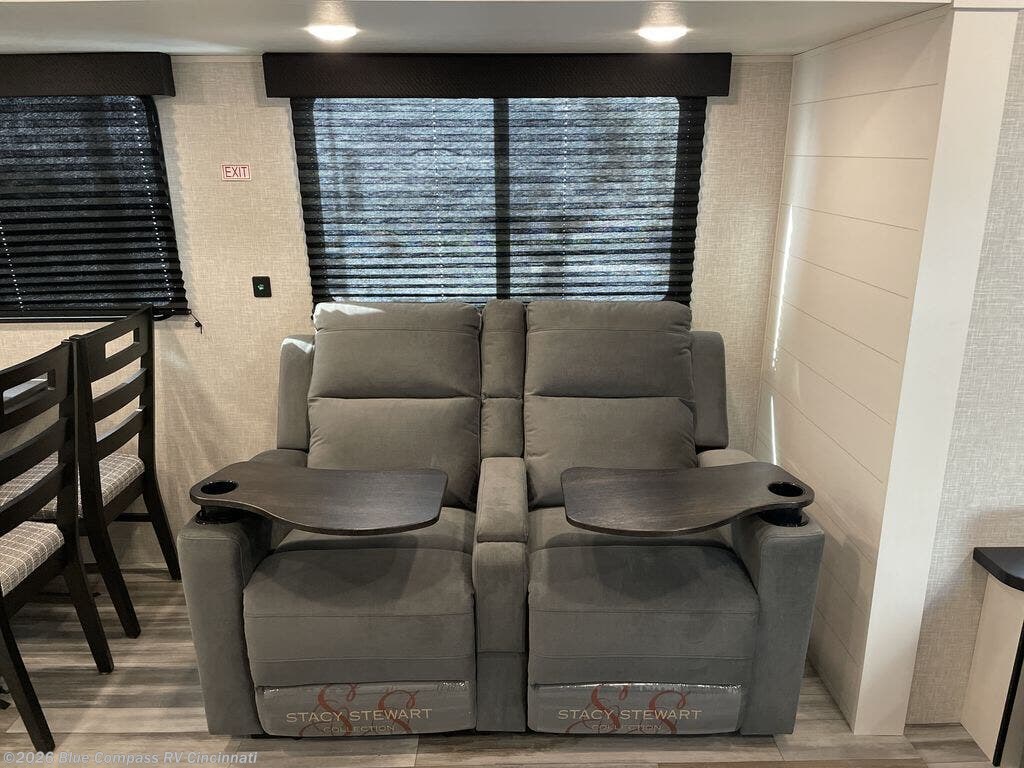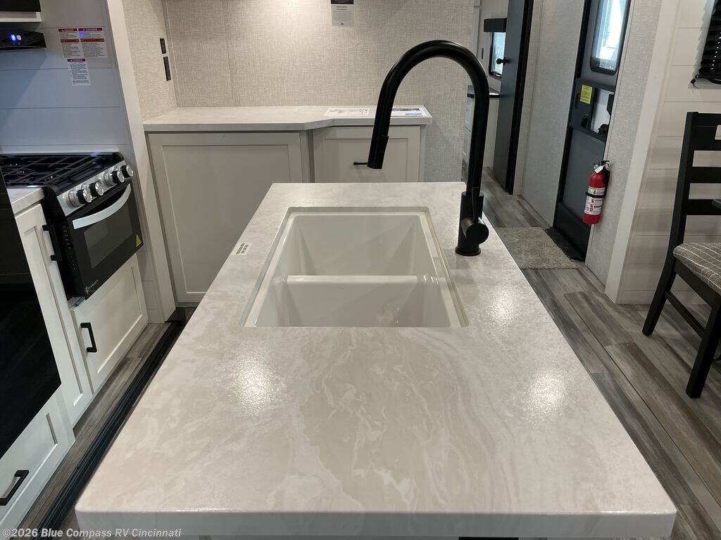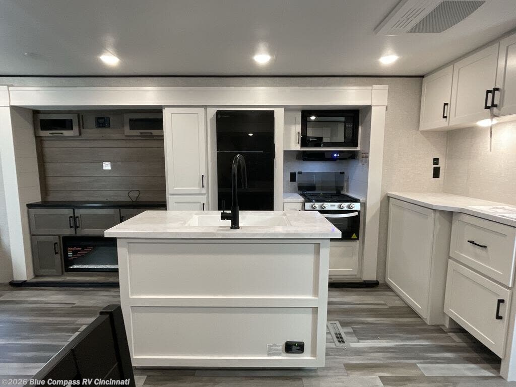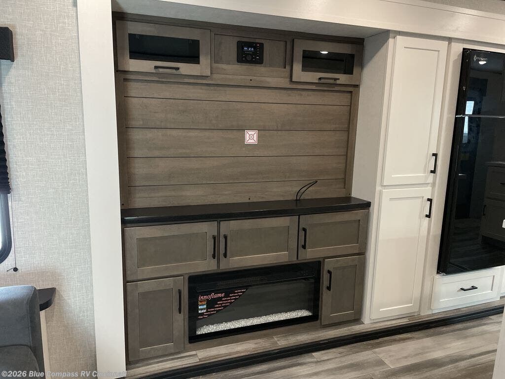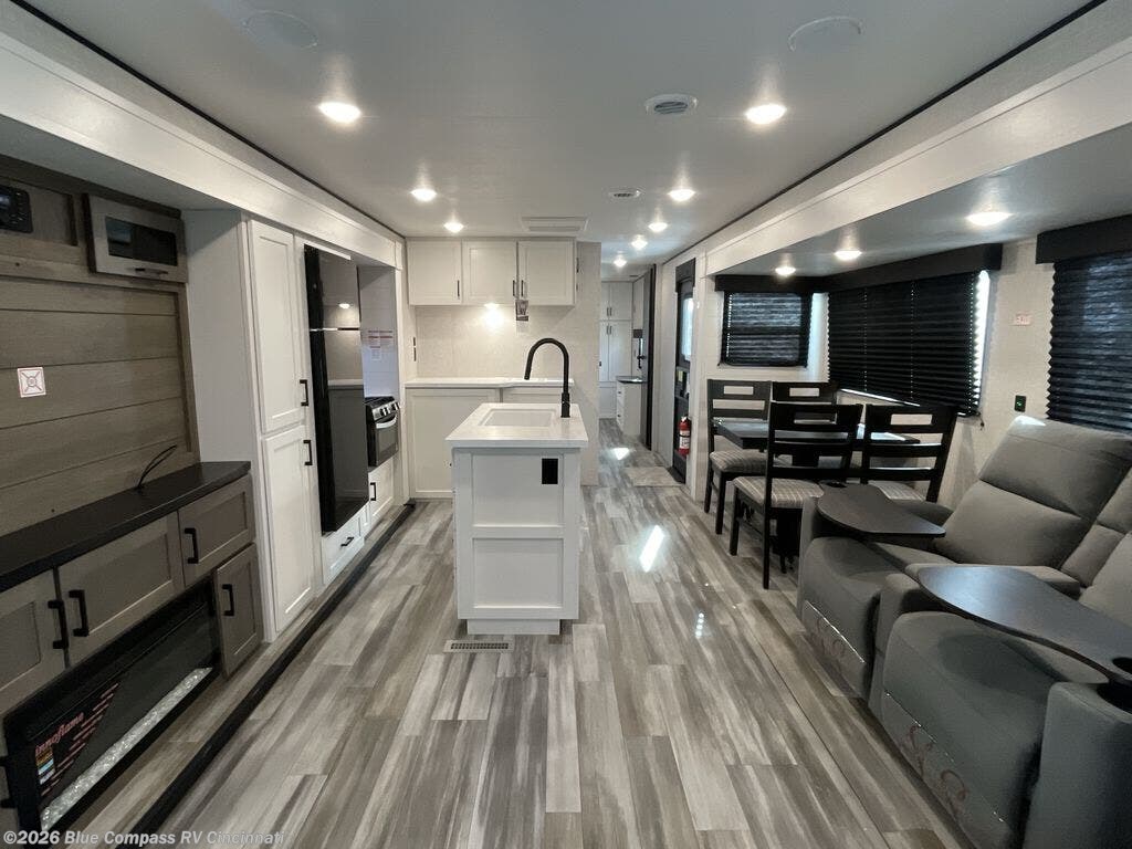 Enjoy a relaxing weekend getaway in this travel trailer! The dual entry bathroom with radius shower creates a front master suite with a queen bed slide, a dresser, and a front large wardrobe with storage space plus washer and dryer prep. The chef will have an easy time preparing their best home cooked meals with the kitchen island, hutch, three burner cooktop, and 12V refrigerator. Enjoy your meals at the booth dinette then play a card game or transform it into an extra sleeping space. The rear living area has a rear Jack-knife sofa for a quick afternoon nap and theater seating across from the entertainment center with a fireplace for the perfect spot on movie night!