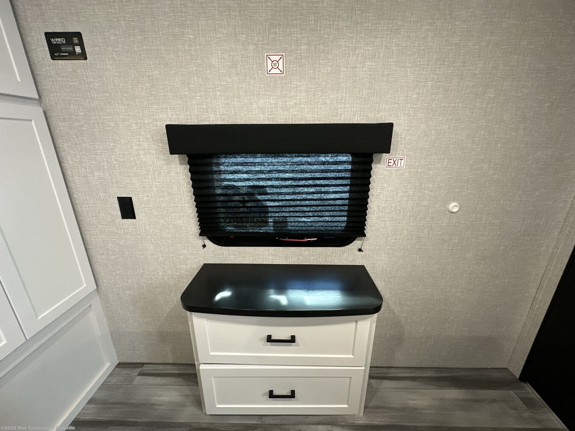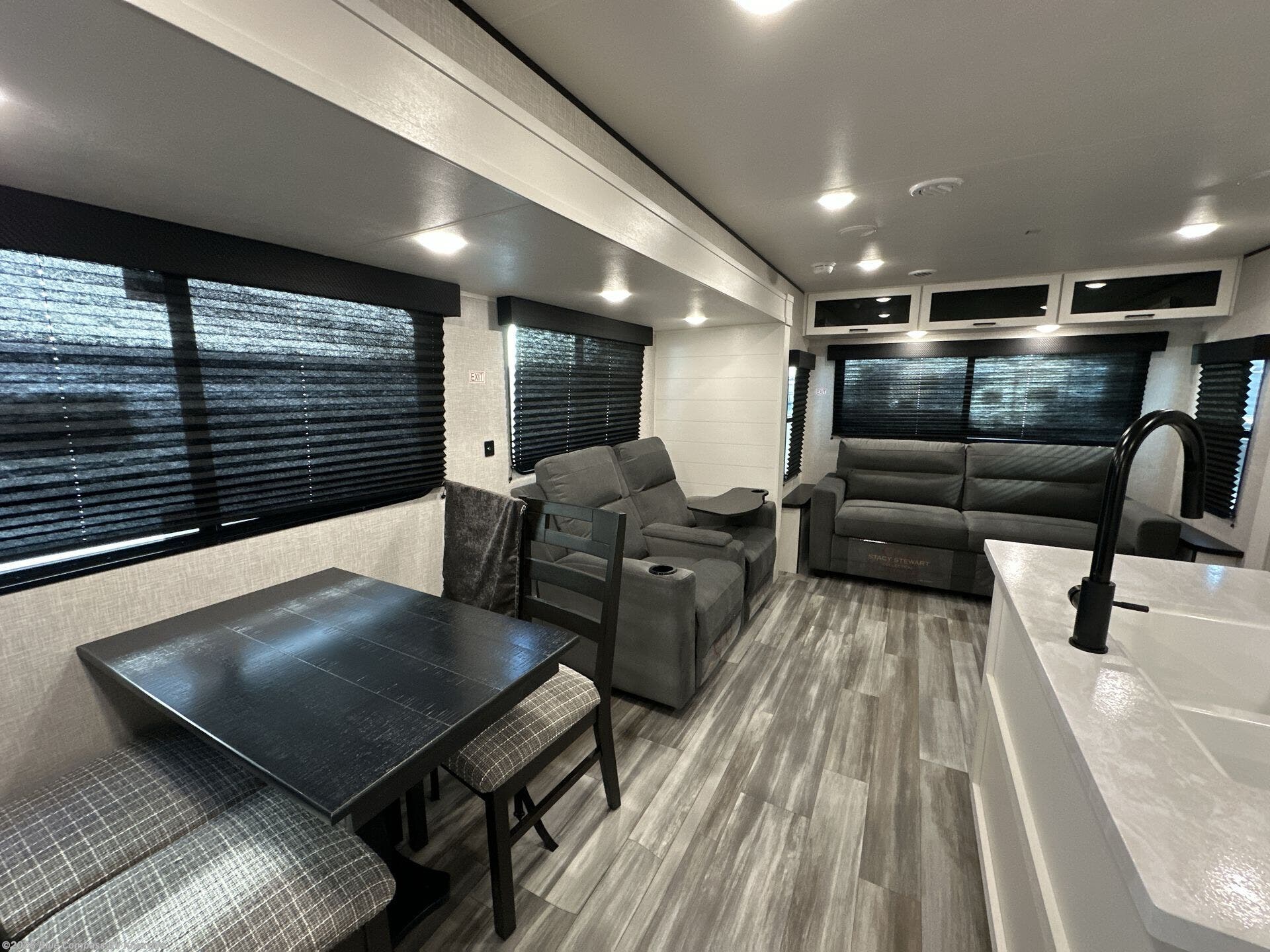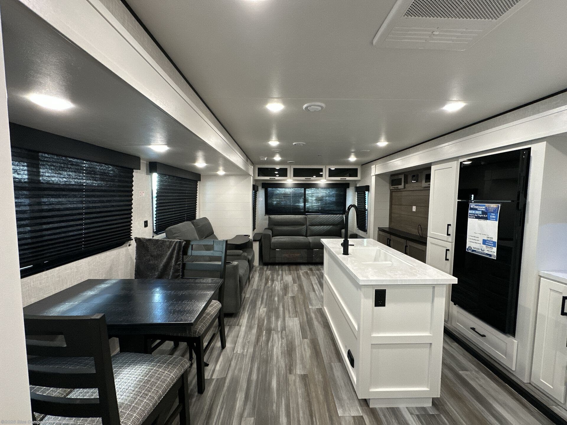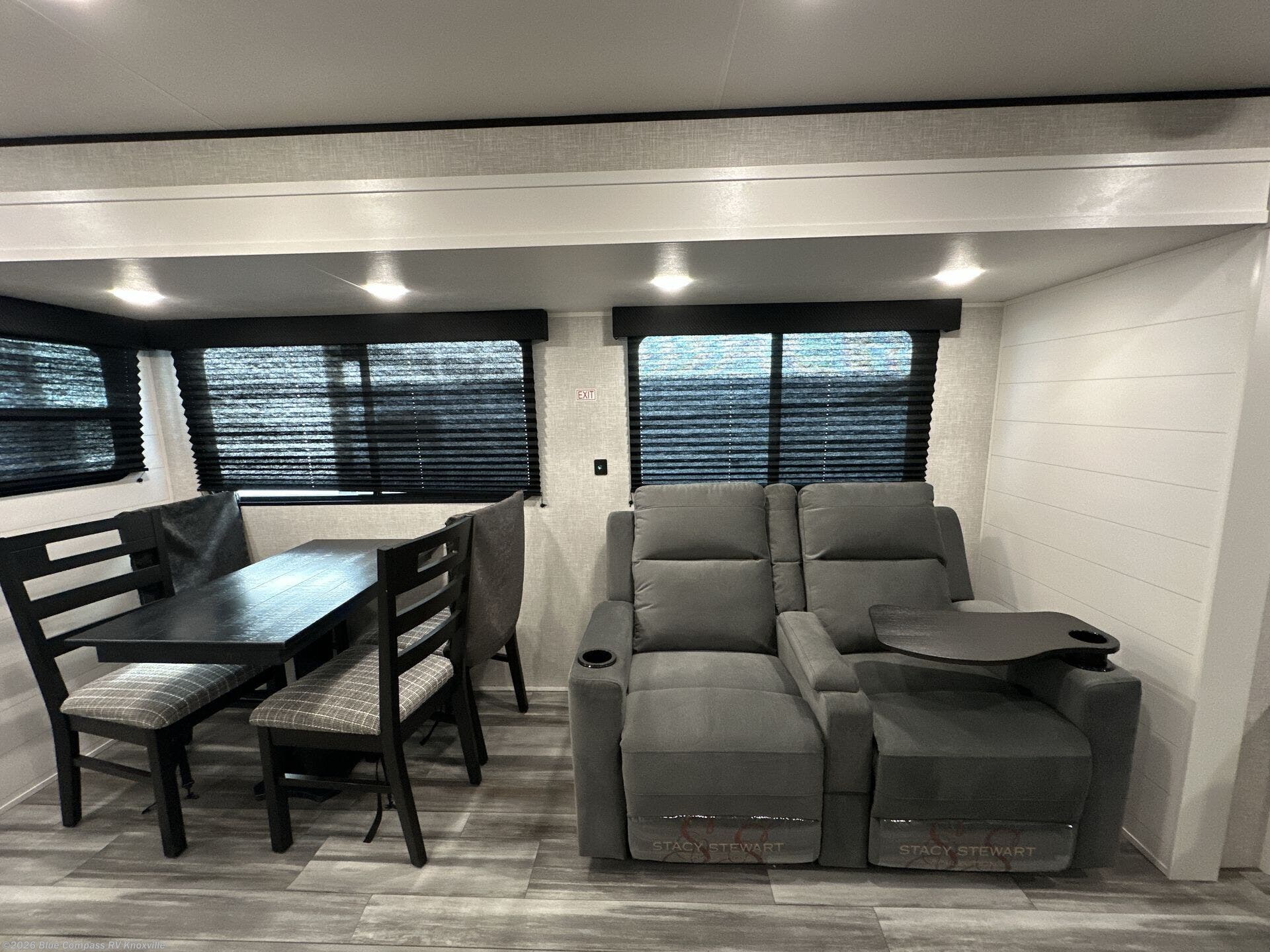 Enjoy a relaxing weekend getaway in this travel trailer! The dual entry bathroom with radius shower creates a front master suite with a queen bed slide, a dresser, and a front large wardrobe with storage space plus washer and dryer prep. The chef will have an easy time preparing their best home cooked meals with the kitchen island, hutch, three burner cooktop, and 12V refrigerator. Enjoy your meals at the booth dinette then play a card game or transform it into an extra sleeping space. The rear living area has a rear Jack-knife sofa for a quick afternoon nap and theater seating across from the entertainment center with a fireplace for the perfect spot on movie night!