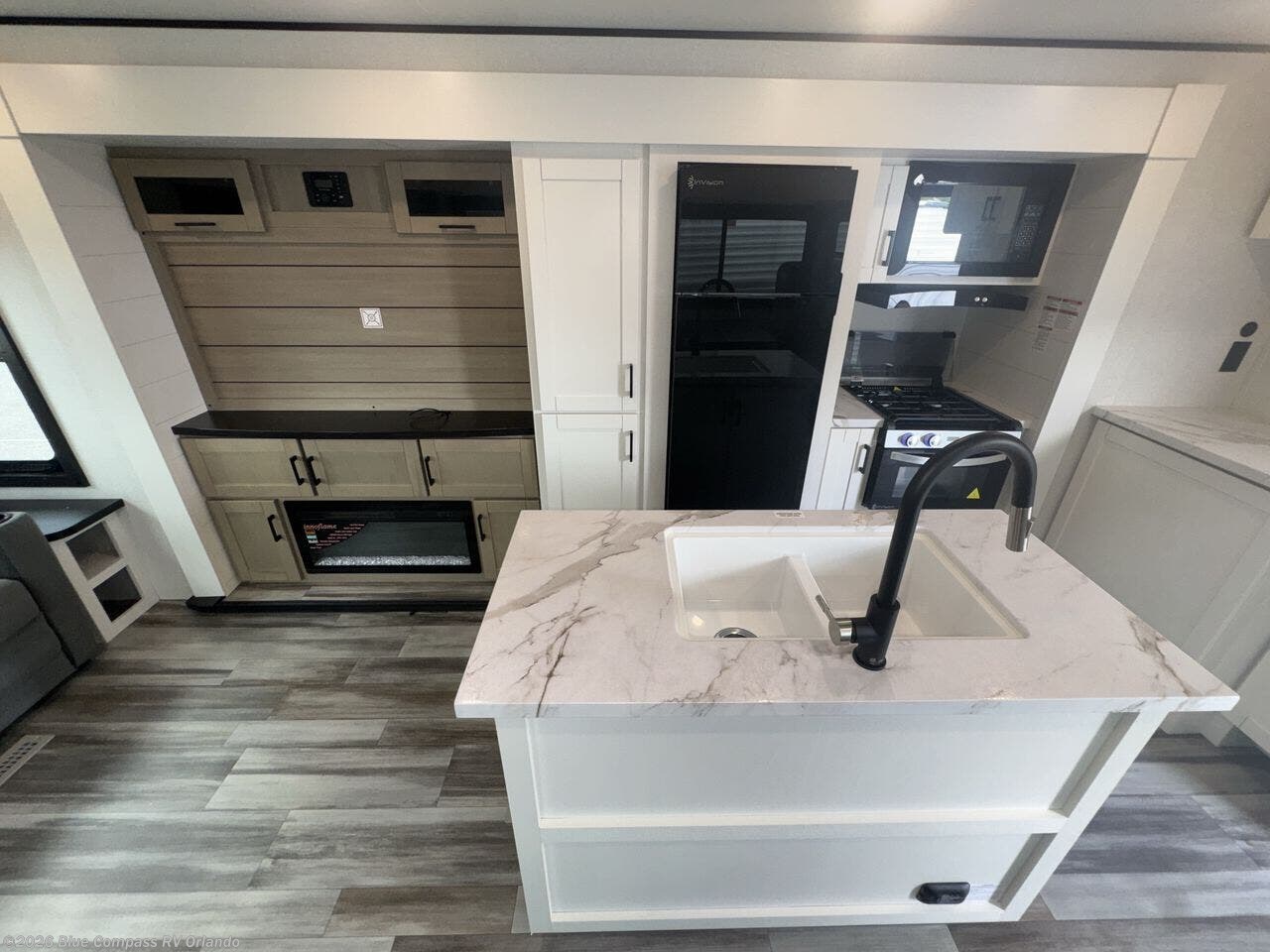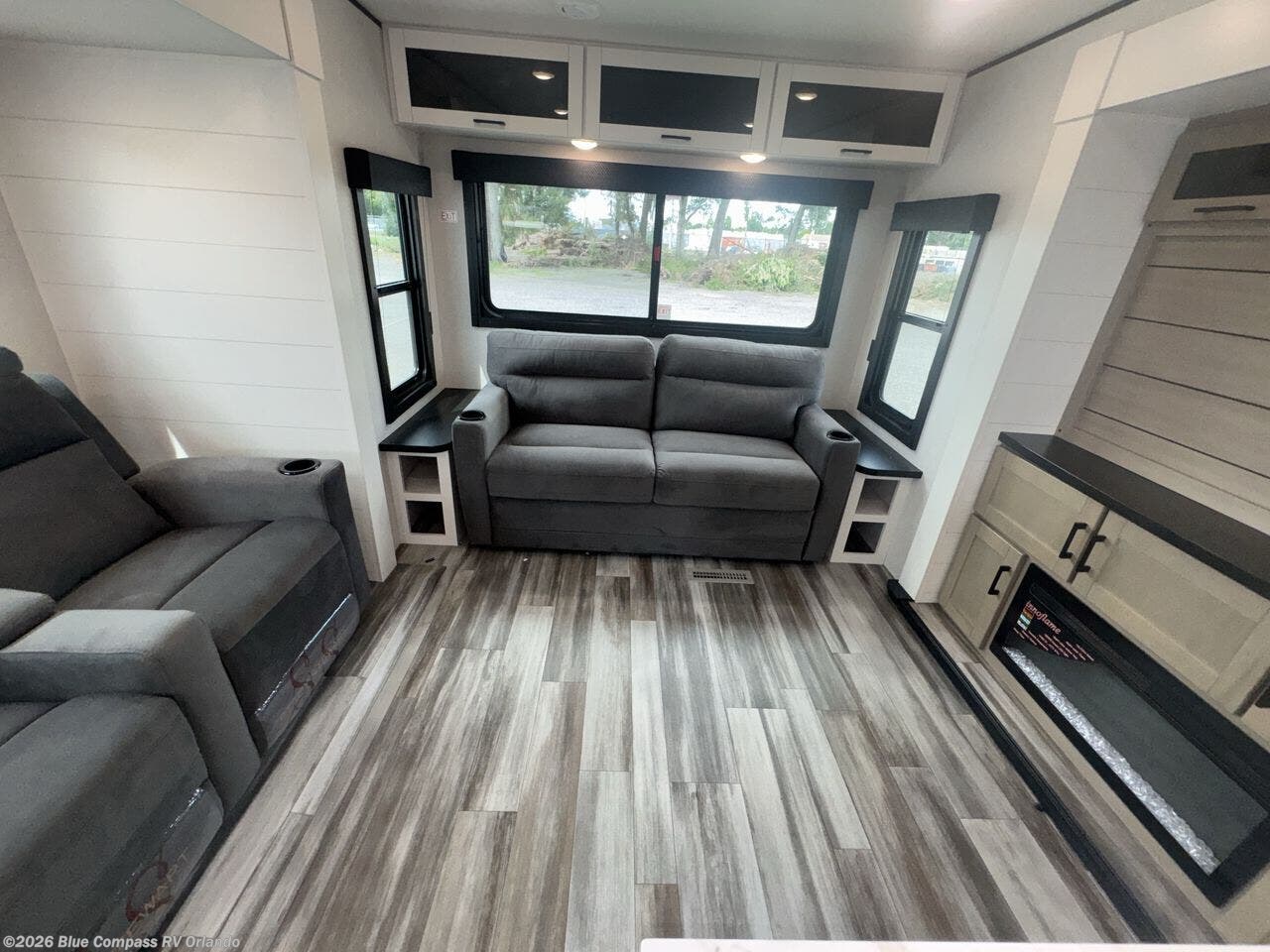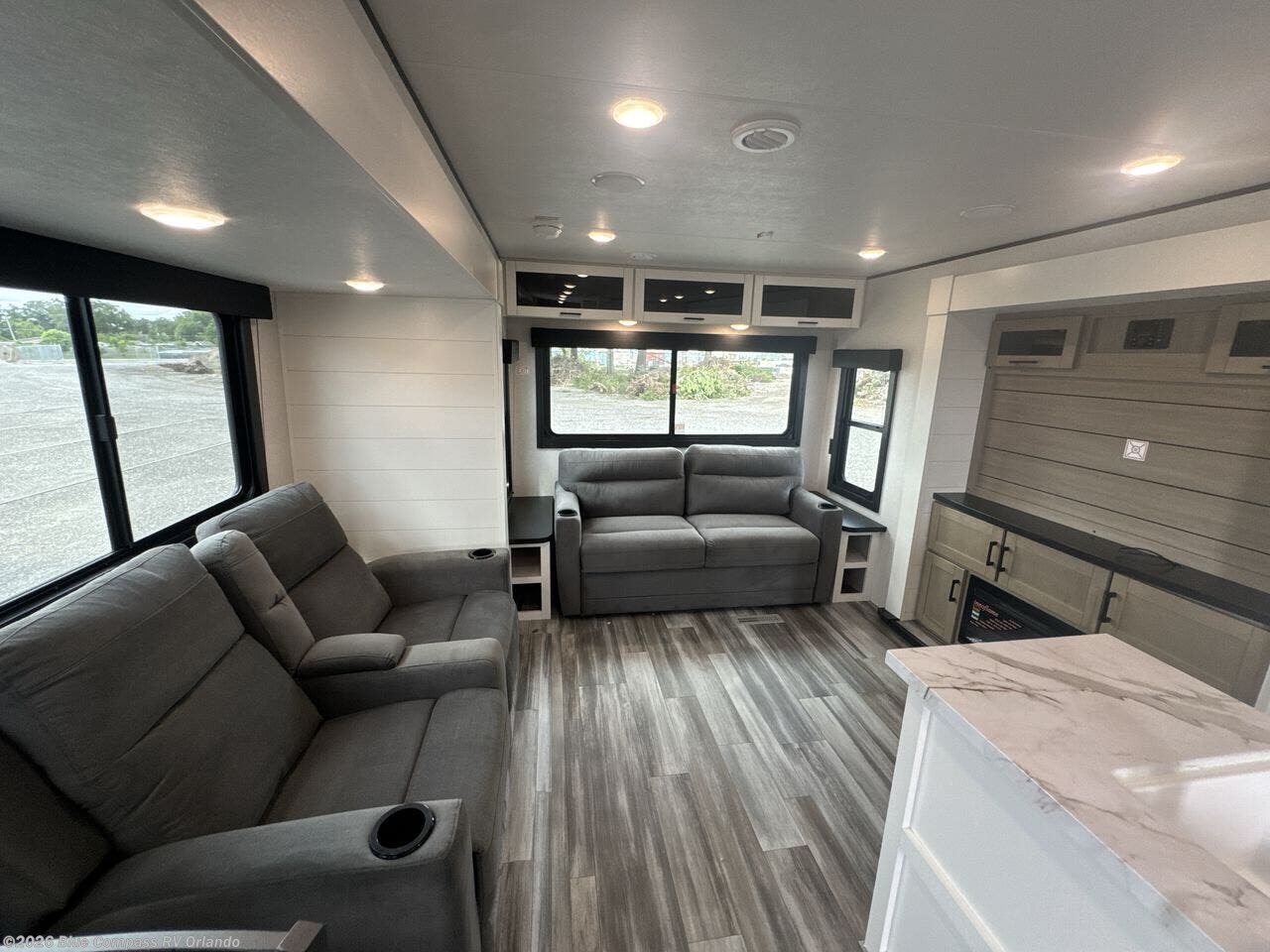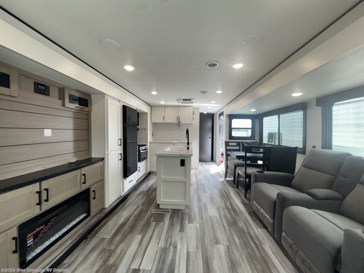 Enjoy a relaxing weekend getaway in this travel trailer! The dual entry bathroom with radius shower creates a front master suite with a queen bed slide, a dresser, and a front large wardrobe with storage space plus washer and dryer prep. The chef will have an easy time preparing their best home cooked meals with the kitchen island, hutch, three burner cooktop, and 12V refrigerator. Enjoy your meals at the booth dinette then play a card game or transform it into an extra sleeping space. The rear living area has a rear Jack-knife sofa for a quick afternoon nap and theater seating across from the entertainment center with a fireplace for the perfect spot on movie night!