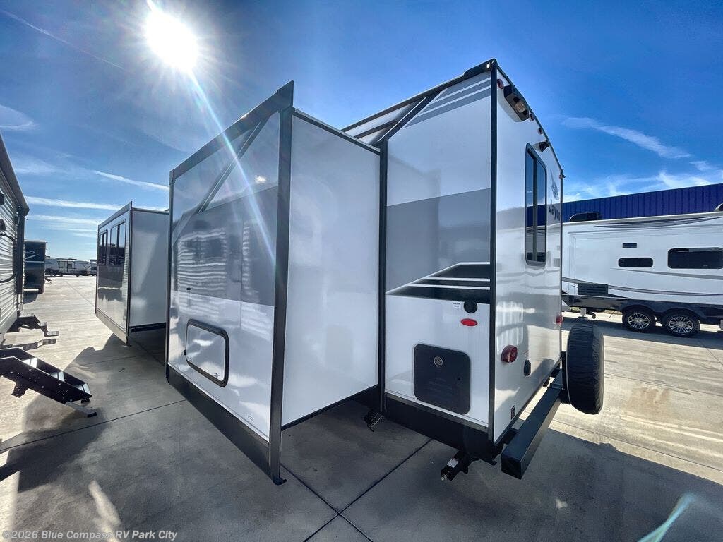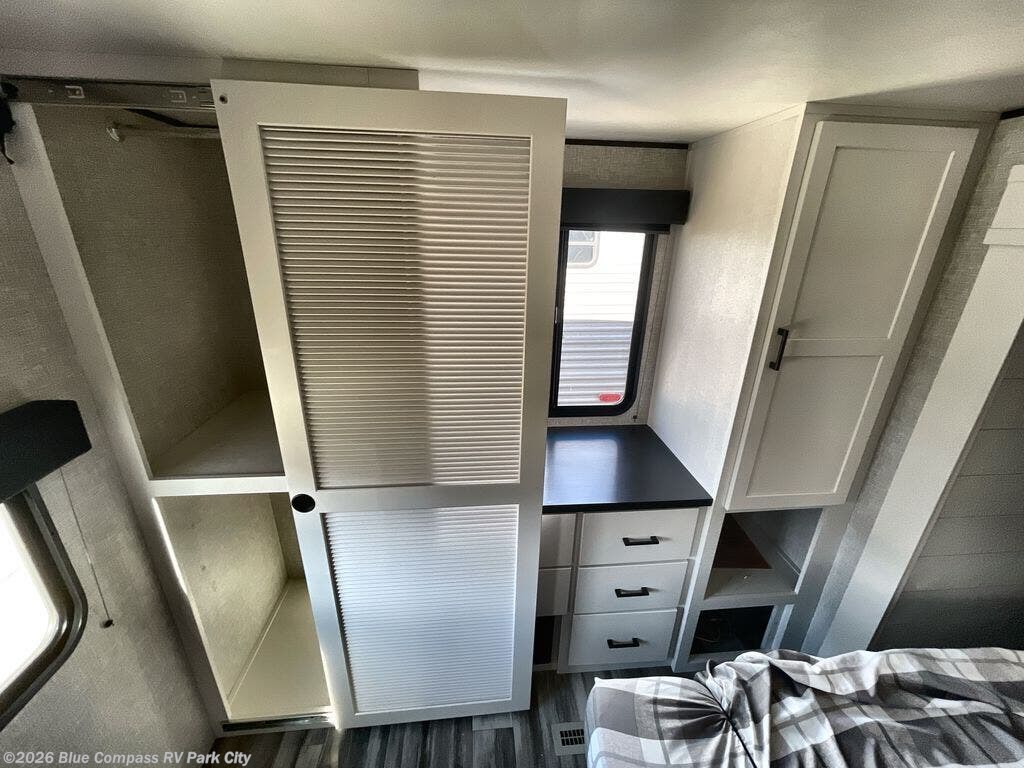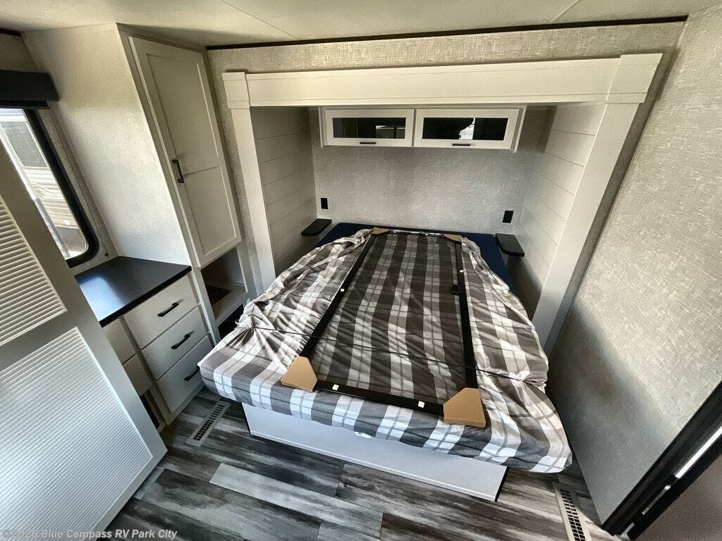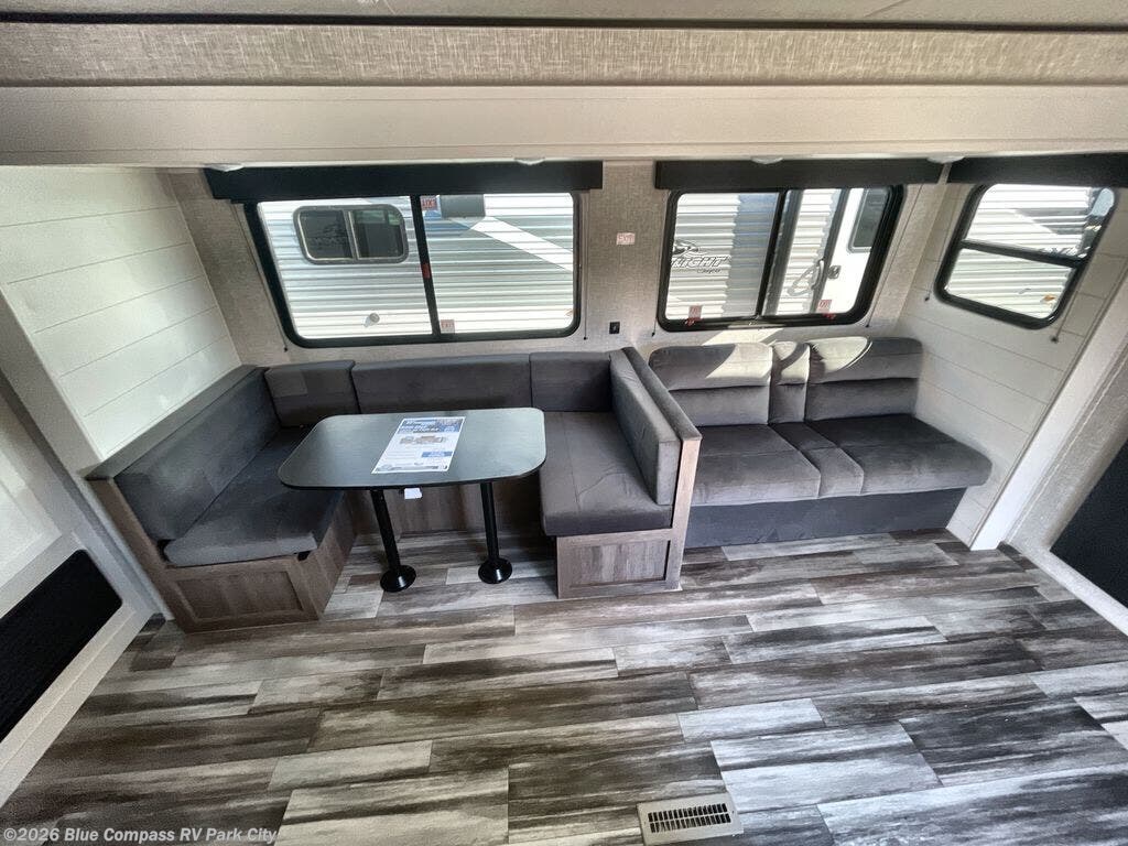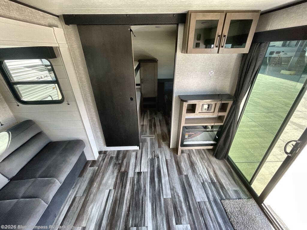 With two private bedrooms, everyone will have a comfortable place to sleep in this travel trailer! The front private bedroom has a 60" x 75" queen bed with wardrobes on either side and the rear private bedroom has a 60" x 80" queen bed slide with a dresser, a wardrobe, one of the exit/entrance doors, and an entrance into the walk-through bathroom which has a radius shower for everyone to stay squeaky clean. The patio doors not only make it easy to enter and exit the unit, but also bring in tons of natural lighting. After you have prepared a delicious home cooked meal, you can can head to the U-shaped dinette to enjoy it there comfortably then relax on the Jack-knife sofa across from the entertainment center!