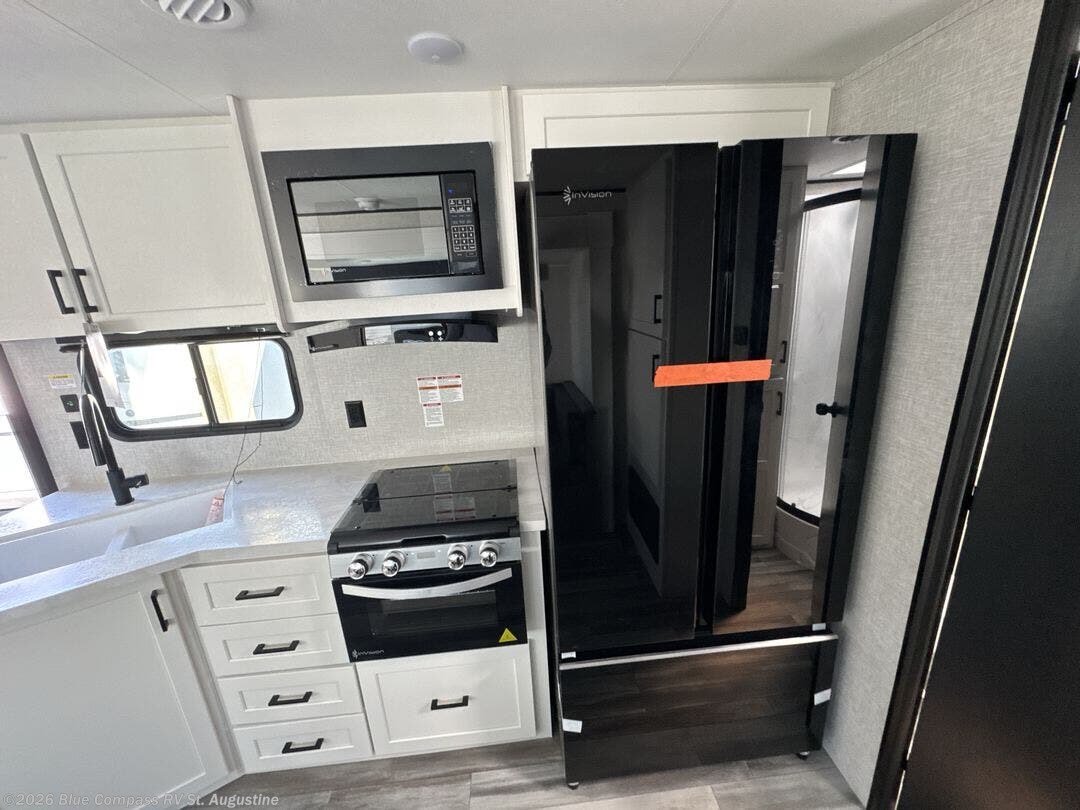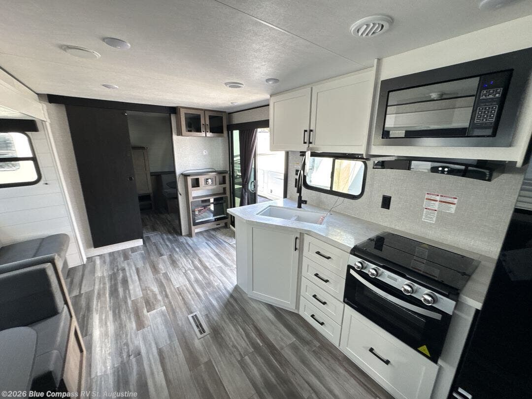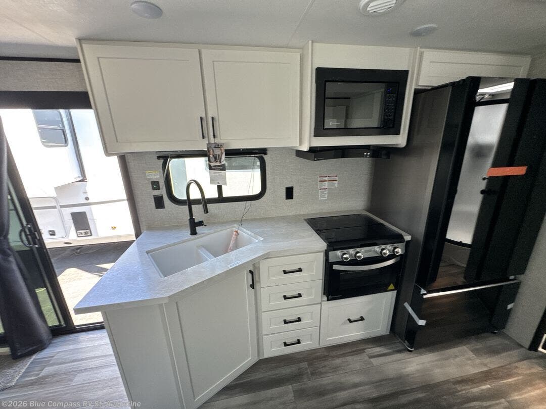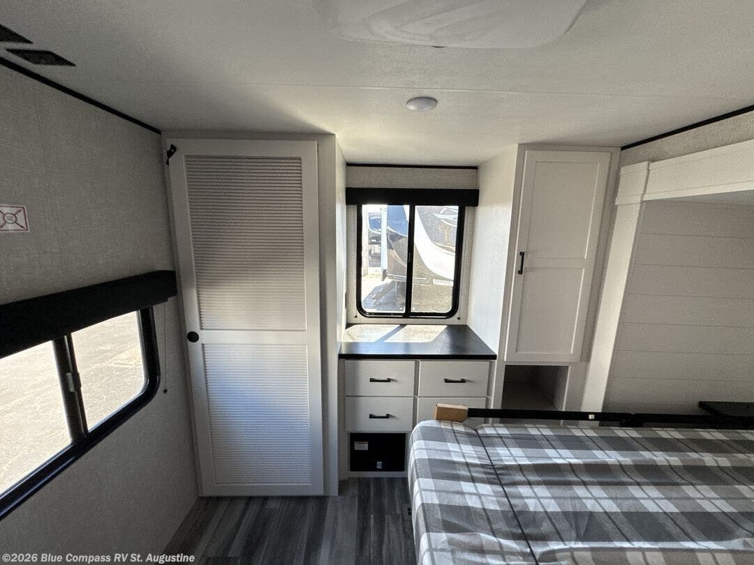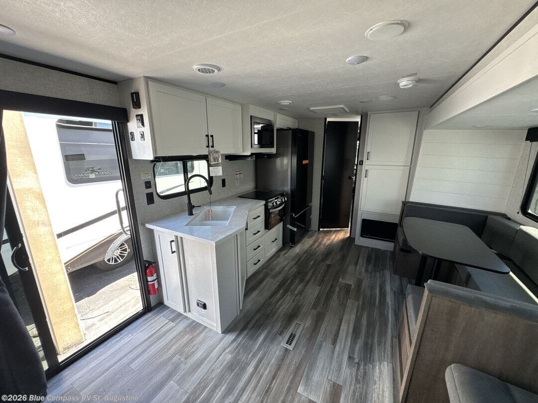 With two private bedrooms, everyone will have a comfortable place to sleep in this travel trailer! The front private bedroom has a 60" x 75" queen bed with wardrobes on either side and the rear private bedroom has a 60" x 80" queen bed slide with a dresser, a wardrobe, one of the exit/entrance doors, and an entrance into the walk-through bathroom which has a radius shower for everyone to stay squeaky clean. The patio doors not only make it easy to enter and exit the unit, but also bring in tons of natural lighting. After you have prepared a delicious home cooked meal, you can can head to the U-shaped dinette to enjoy it there comfortably then relax on the Jack-knife sofa across from the entertainment center!