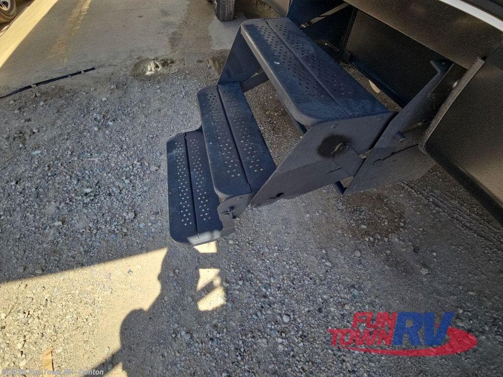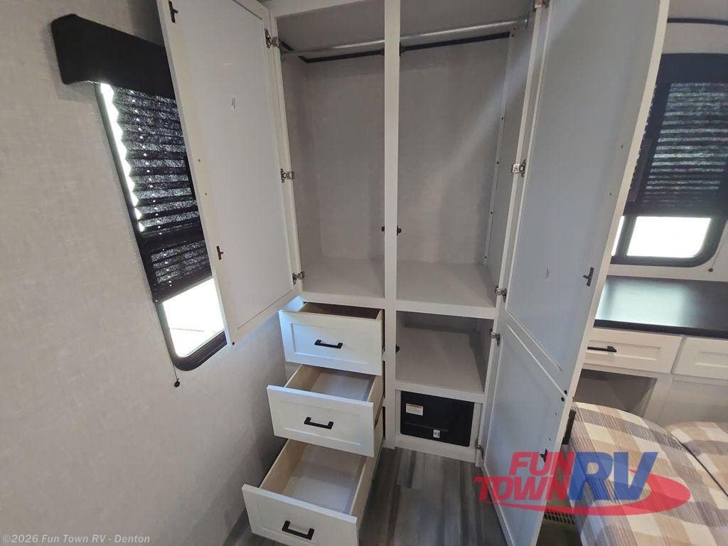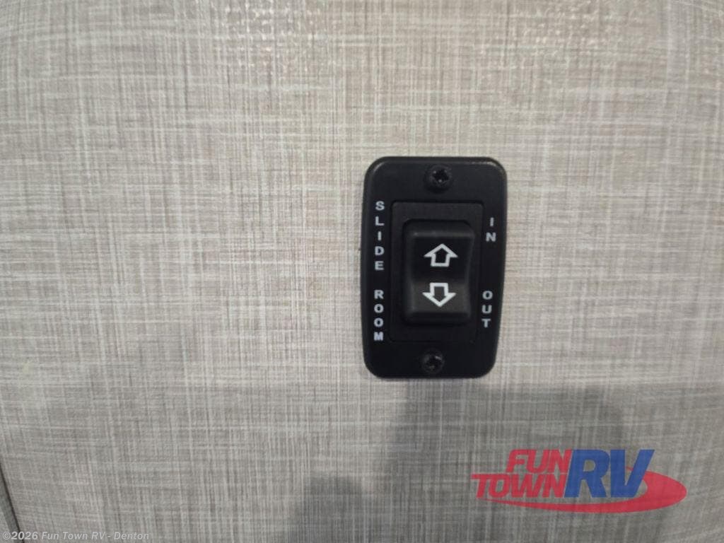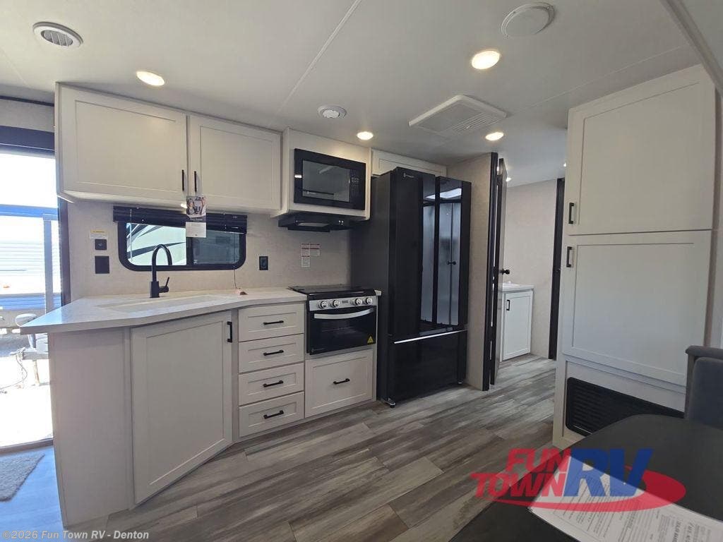 With two private bedrooms, everyone will have a comfortable place to sleep in this travel trailer! The front private bedroom has a 60" x 75" queen bed with wardrobes on either side and the rear private bedroom has a 60" x 80" queen bed slide with a dresser, a wardrobe, one of the exit/entrance doors, and an entrance into the walk-through bathroom which has a radius shower for everyone to stay squeaky clean. The patio doors not only make it easy to enter and exit the unit, but also bring in tons of natural lighting. After you have prepared a delicious home cooked meal, you can can head to the U-shaped dinette to enjoy it there comfortably then relax on the Jack-knife sofa across from the entertainment center!