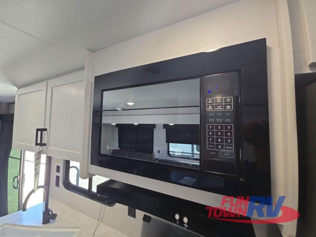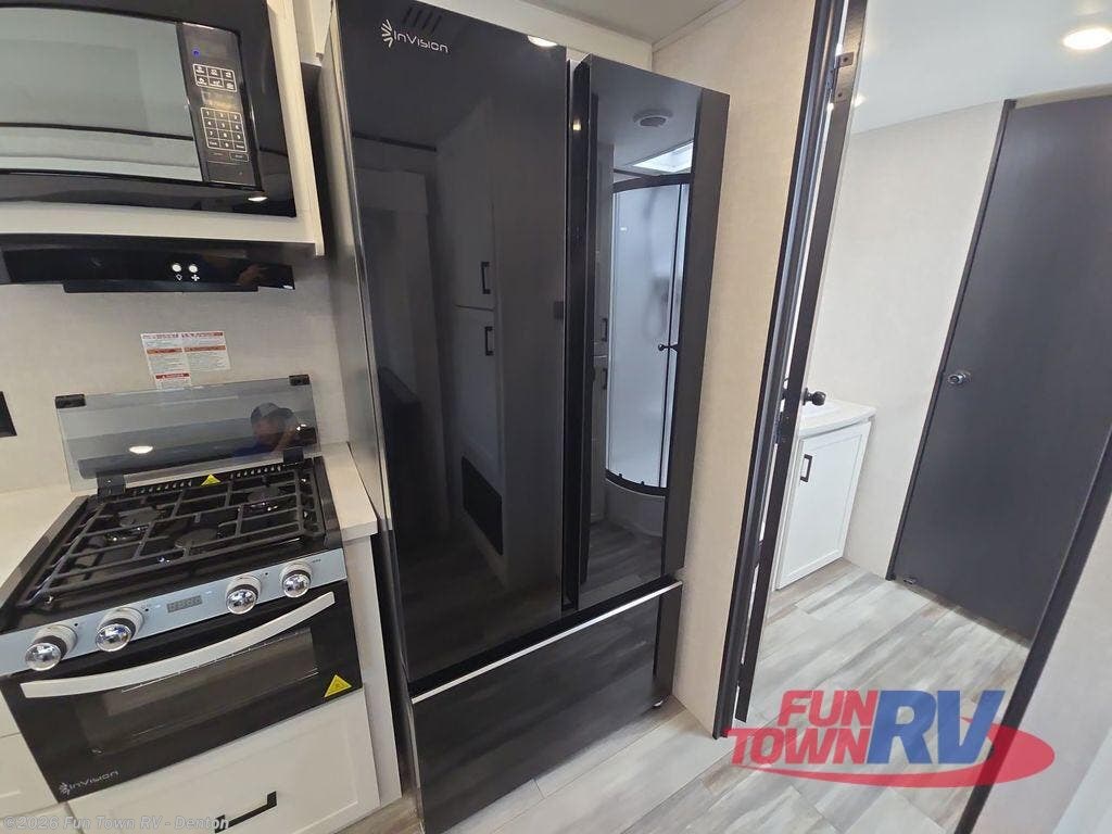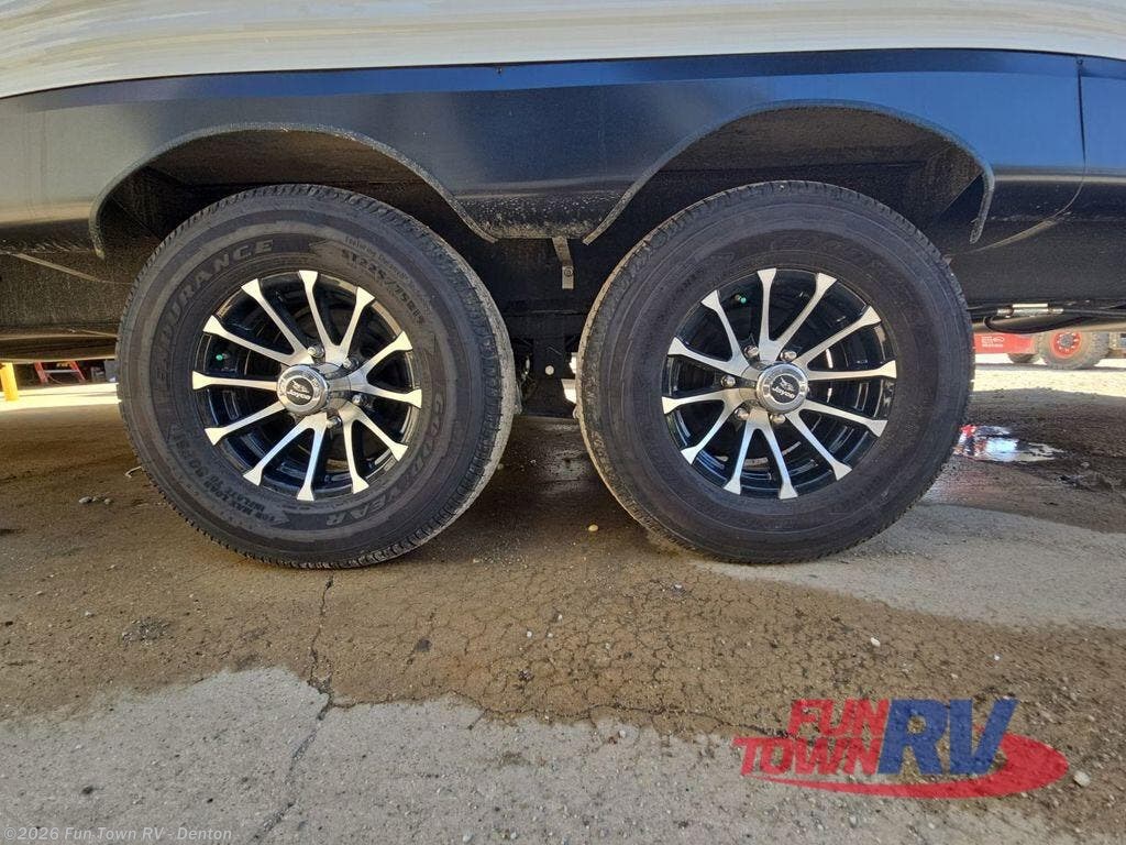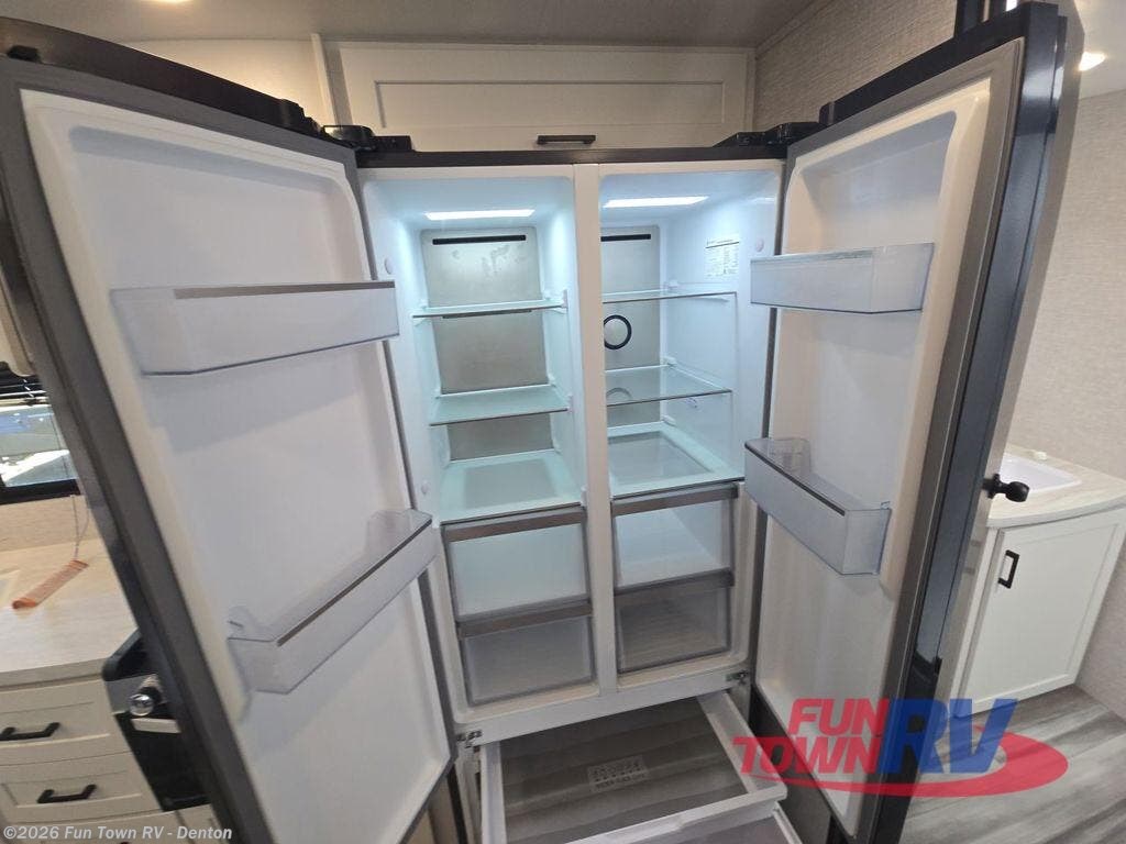 With two private bedrooms, everyone will have a comfortable place to sleep in this travel trailer! The front private bedroom has a 60" x 75" queen bed with wardrobes on either side and the rear private bedroom has a 60" x 80" queen bed slide with a dresser, a wardrobe, one of the exit/entrance doors, and an entrance into the walk-through bathroom which has a radius shower for everyone to stay squeaky clean. The patio doors not only make it easy to enter and exit the unit, but also bring in tons of natural lighting. After you have prepared a delicious home cooked meal, you can can head to the U-shaped dinette to enjoy it there comfortably then relax on the Jack-knife sofa across from the entertainment center!