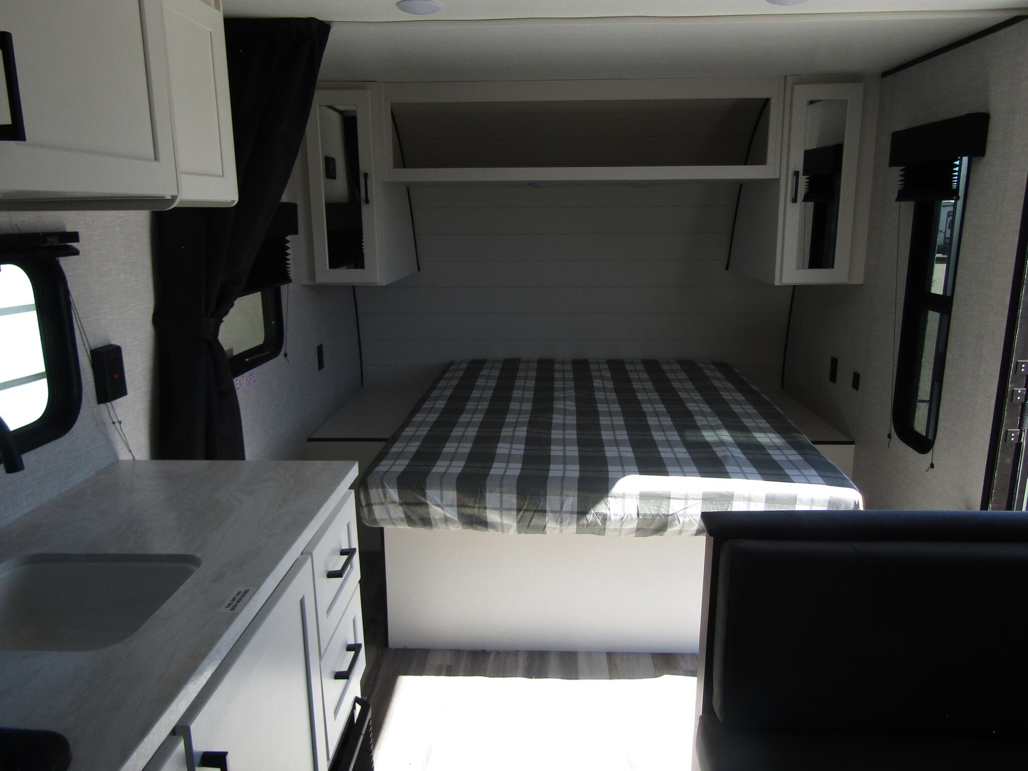 This new travel trailer is currently in stock and ready for adventure. Its crisp white exterior is not only eye-catching but also ensures durability. The efficient towing capability, complemented by its bumper pull hitch, makes it easy to transport wherever your journey takes you.