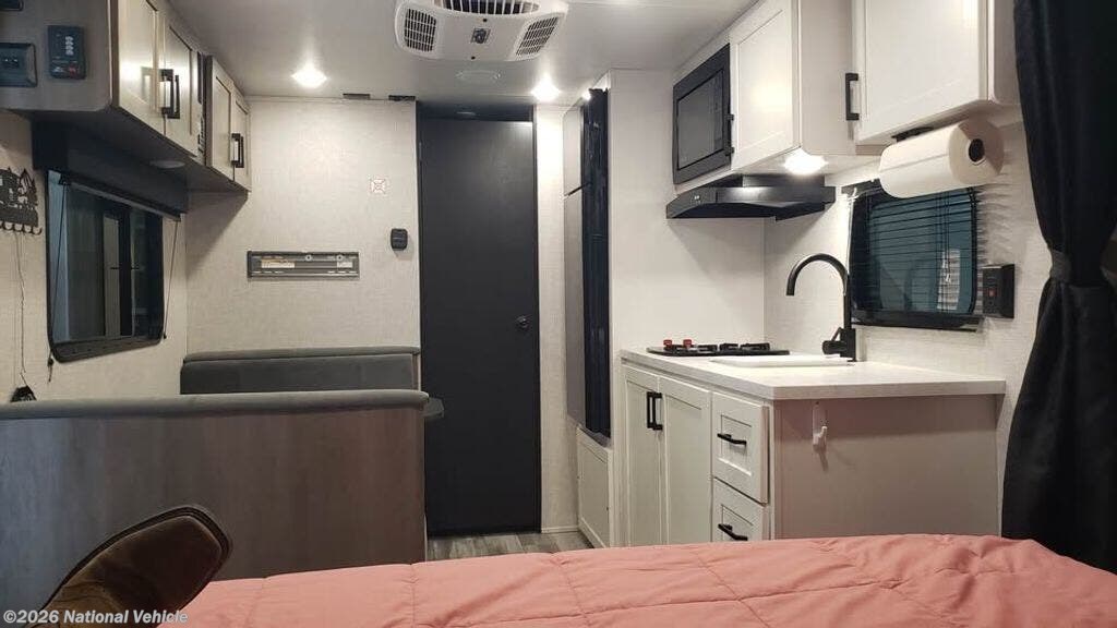 Step inside and you?ll find a smart, efficient layout packed with comfort. The front queen bed features a sturdy plywood platform, giving you residential-style support and long-lasting quality. The interior is finished with easy-clean vinyl flooring and is kept cool with an 8,000 BTU wall-mount A/C, perfect for warm summer trips.