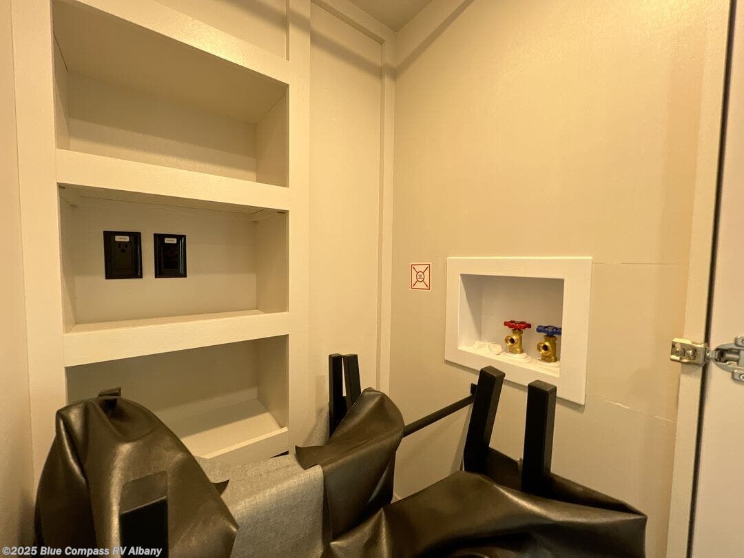 You can't go wrong when camping in this triple slide out fifth wheel! Once you've arrived at your destination and unloaded the pass-through storage, you can make lunch in the rear kitchen with generous counter space. There are also two pantries, one being a pull-out, plus a convenient pull-out butcher block so you can chop fresh veggies! You can enjoy your meal at the roll-top dinette with chairs, and if you need to get some work done, the desk/coffee bar will provide a space for your laptop. An L-shaped sofa and theater seat in the main living area will create an inviting space, plus there is a 65" TV and a mantle with a fireplace just like at home! Freshen up in the full bath at the end of the day, then head to the front private bedroom for a great night's rest on the king bed slide out. There is a closet with drawers and a hamper below, a chest with a TV, plus washer and dryer prep for the option to add these appliances; how convenient!