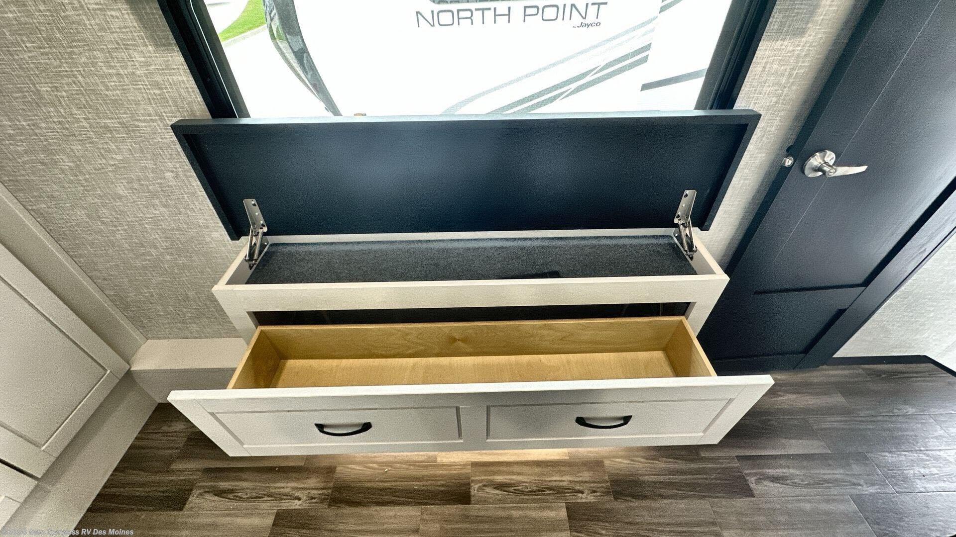 With any North Point fifth wheel by Jayco you begin with a strong foundation with a custom frame, designed and sized specifically to best support each unit. Constructed with Stronghold VBL™ aluminum framed, vacuum bond laminated walls and the Magnum Truss™ XL6™ roof system with a one-piece, seamless roof material, which is the strongest tested roof in the industry. The 5-Star Handling package is included with Uniroyal tires, a MORryde rubber pin box, Dexter axles with Nev-R-Adjust brakes, MORryde CRE-3000 rubberized suspension and wet bolt fasteners and bronze bushings. The interior has handcrafted hardwood glazed doors and drawers, vinyl flooring throughout, an integrated under-mount sink in the main bathroom, plus so much more you just have to see one to believe it all!