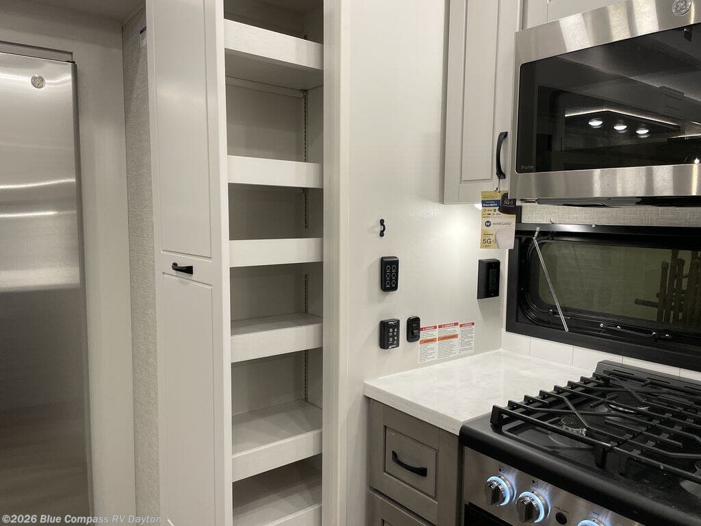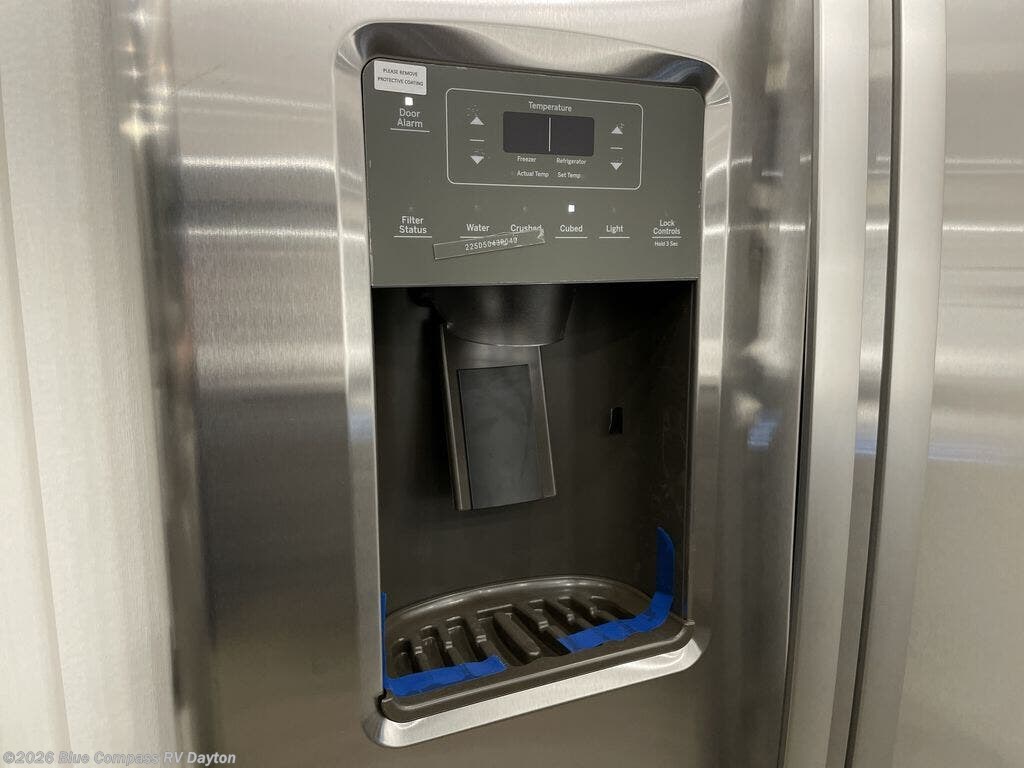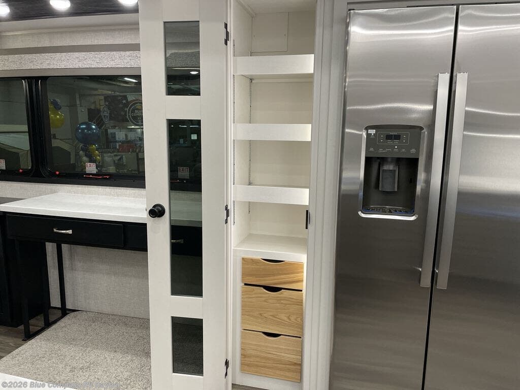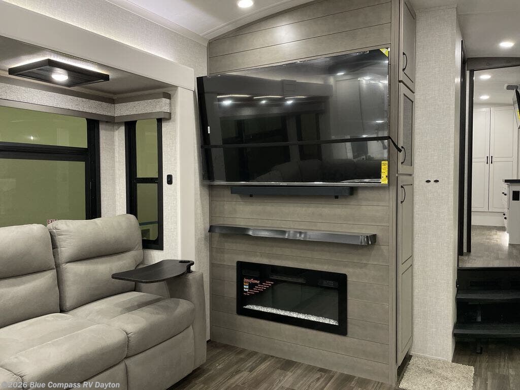 You can't go wrong when camping in this triple slide out fifth wheel! Once you've arrived at your destination and unloaded the pass-through storage, you can make lunch in the rear kitchen with generous counter space. There are also two pantries, one being a pull-out, plus a convenient pull-out butcher block so you can chop fresh veggies! You can enjoy your meal at the roll-top dinette with chairs, and if you need to get some work done, the desk/coffee bar will provide a space for your laptop. An L-shaped sofa and theater seat in the main living area will create an inviting space, plus there is a 65" TV and a mantle with a fireplace just like at home! Freshen up in the full bath at the end of the day, then head to the front private bedroom for a great night's rest on the king bed slide out. There is a closet with drawers and a hamper below, a chest with a TV, plus washer and dryer prep for the option to add these appliances; how convenient!