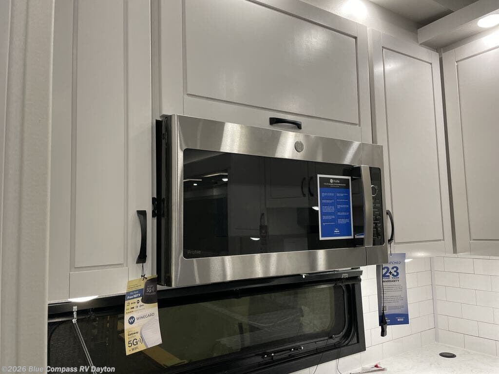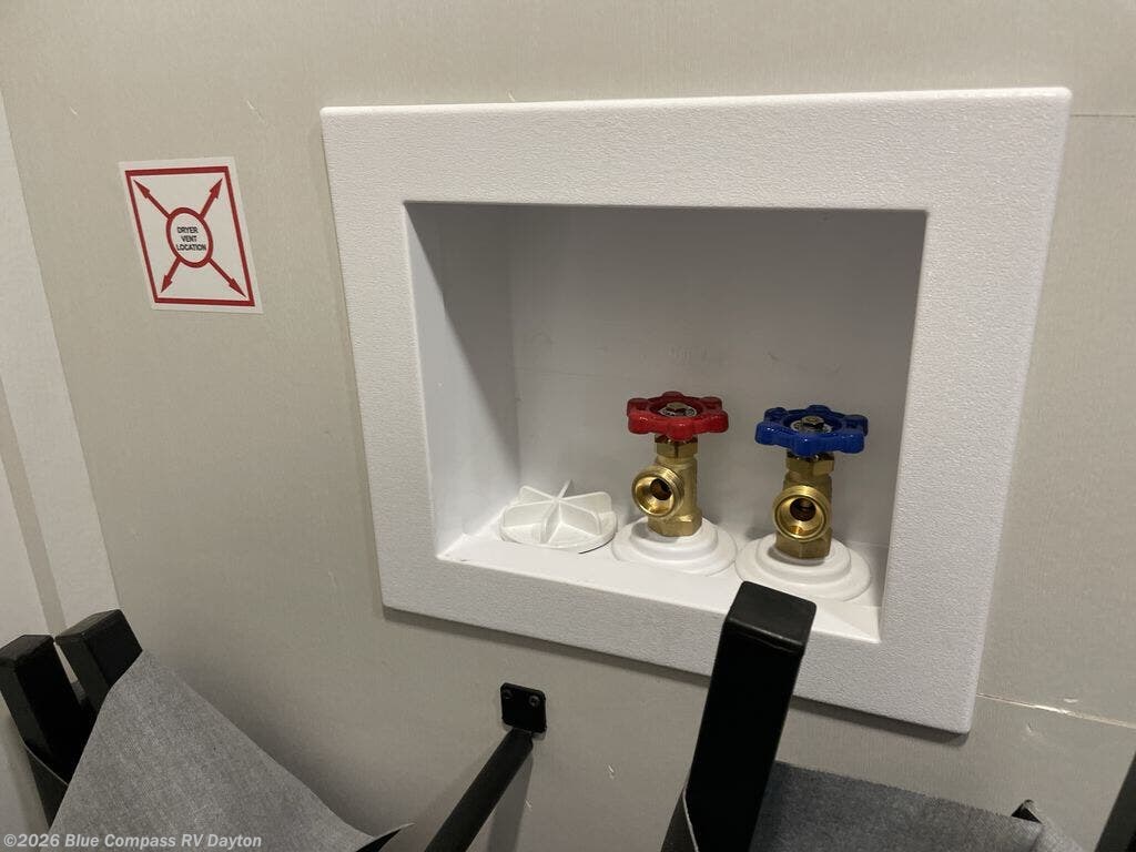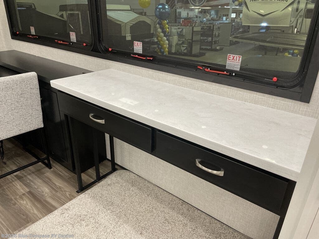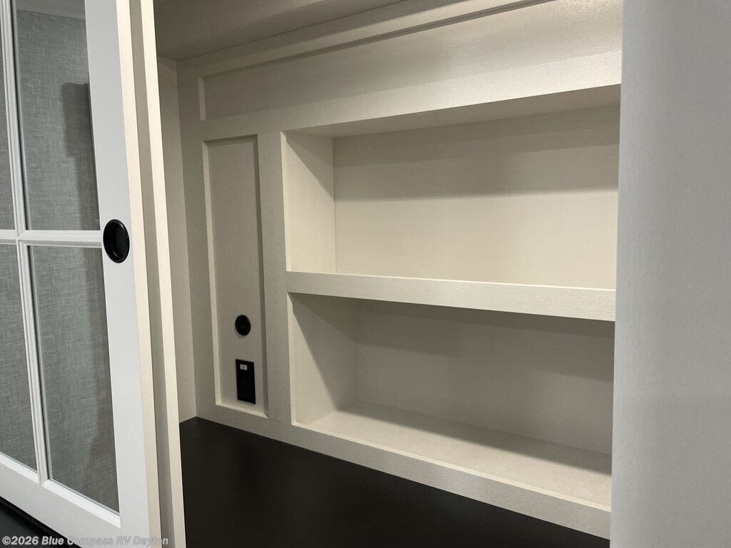 You can't go wrong when camping in this triple slide out fifth wheel! Once you've arrived at your destination and unloaded the pass-through storage, you can make lunch in the rear kitchen with generous counter space. There are also two pantries, one being a pull-out, plus a convenient pull-out butcher block so you can chop fresh veggies! You can enjoy your meal at the roll-top dinette with chairs, and if you need to get some work done, the desk/coffee bar will provide a space for your laptop. An L-shaped sofa and theater seat in the main living area will create an inviting space, plus there is a 65" TV and a mantle with a fireplace just like at home! Freshen up in the full bath at the end of the day, then head to the front private bedroom for a great night's rest on the king bed slide out. There is a closet with drawers and a hamper below, a chest with a TV, plus washer and dryer prep for the option to add these appliances; how convenient!