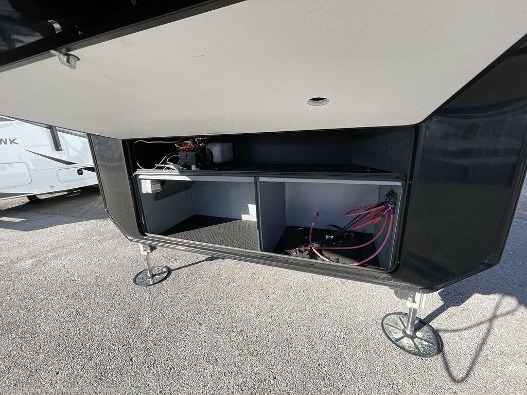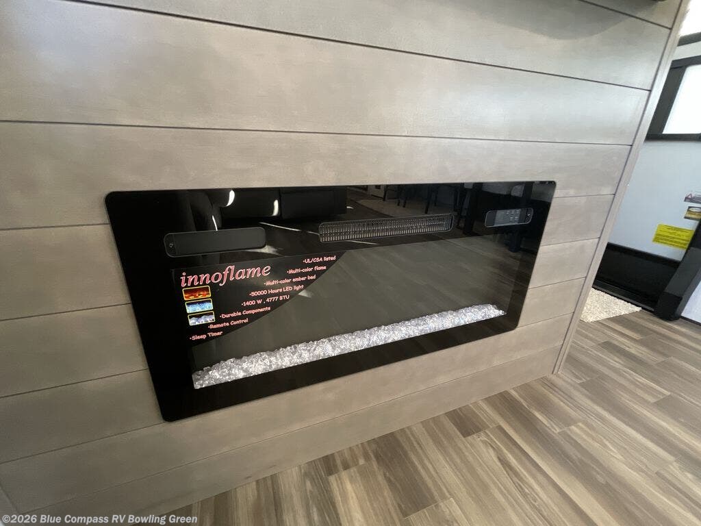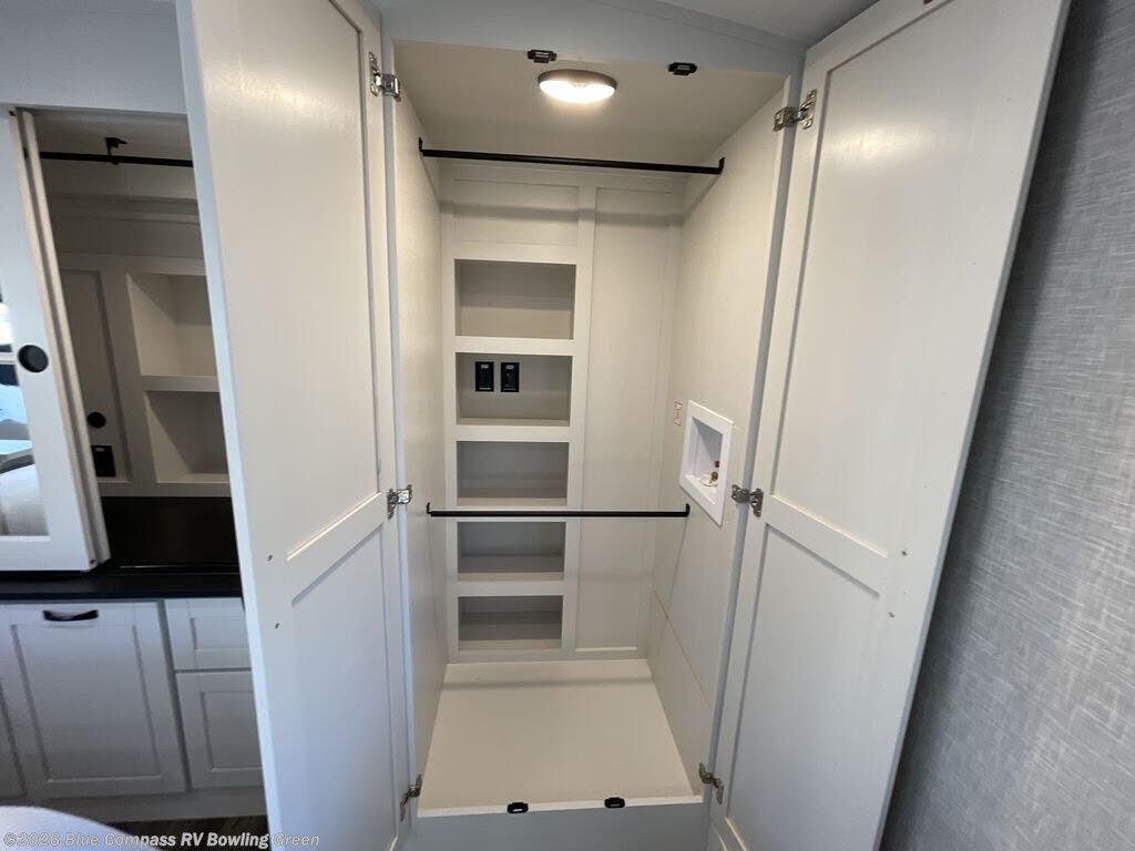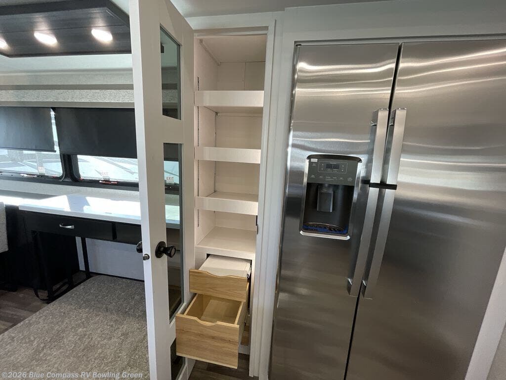 You can't go wrong when camping in this triple slide out fifth wheel! Once you've arrived at your destination and unloaded the pass-through storage, you can make lunch in the rear kitchen with generous counter space. There are also two pantries, one being a pull-out, plus a convenient pull-out butcher block so you can chop fresh veggies! You can enjoy your meal at the roll-top dinette with chairs, and if you need to get some work done, the desk/coffee bar will provide a space for your laptop. An L-shaped sofa and theater seat in the main living area will create an inviting space, plus there is a 65" TV and a mantle with a fireplace just like at home! Freshen up in the full bath at the end of the day, then head to the front private bedroom for a great night's rest on the king bed slide out. There is a closet with drawers and a hamper below, a chest with a TV, plus washer and dryer prep for the option to add these appliances; how convenient!