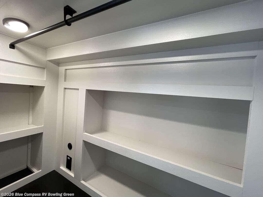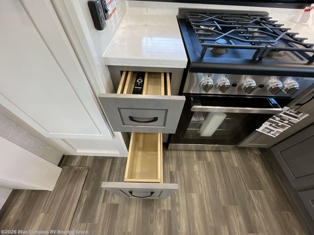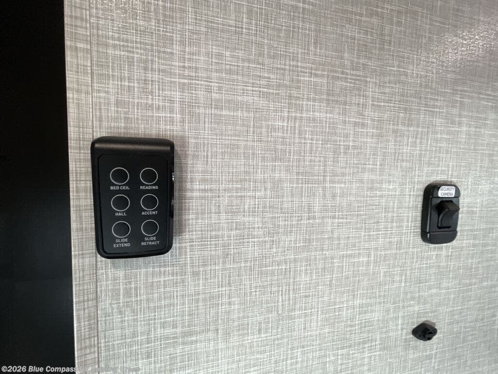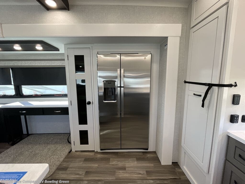 You can't go wrong when camping in this triple slide out fifth wheel! Once you've arrived at your destination and unloaded the pass-through storage, you can make lunch in the rear kitchen with generous counter space. There are also two pantries, one being a pull-out, plus a convenient pull-out butcher block so you can chop fresh veggies! You can enjoy your meal at the roll-top dinette with chairs, and if you need to get some work done, the desk/coffee bar will provide a space for your laptop. An L-shaped sofa and theater seat in the main living area will create an inviting space, plus there is a 65" TV and a mantle with a fireplace just like at home! Freshen up in the full bath at the end of the day, then head to the front private bedroom for a great night's rest on the king bed slide out. There is a closet with drawers and a hamper below, a chest with a TV, plus washer and dryer prep for the option to add these appliances; how convenient!