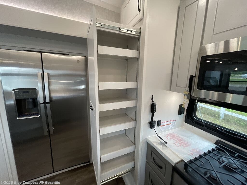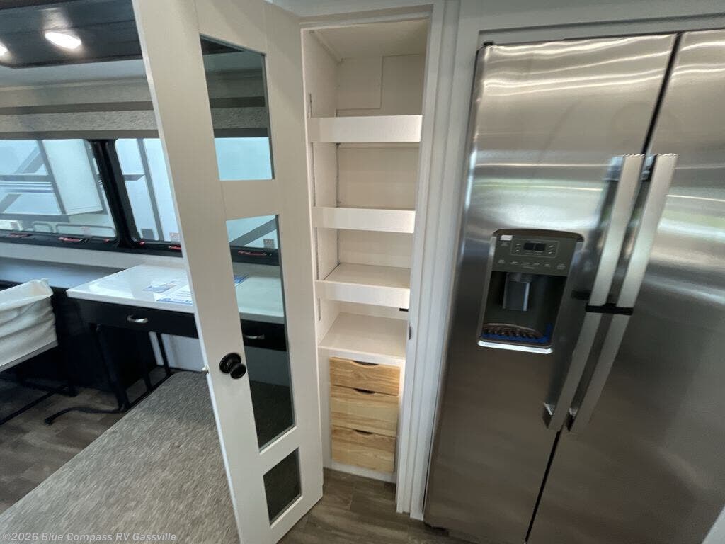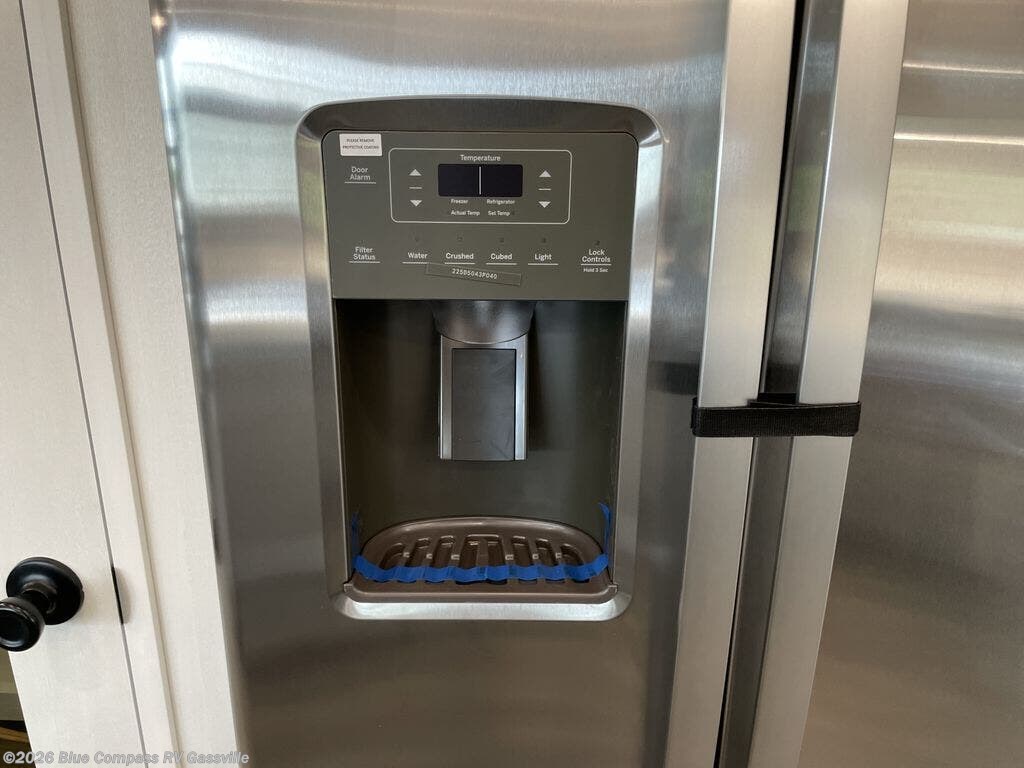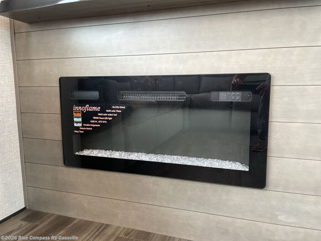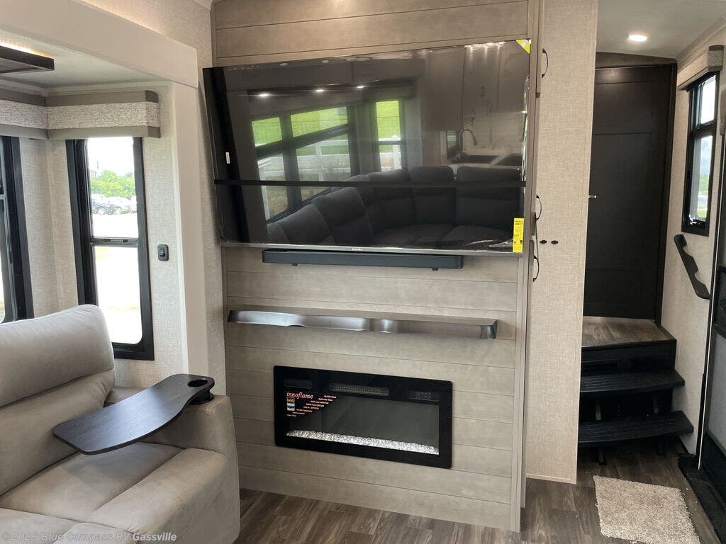 You can't go wrong when camping in this triple slide out fifth wheel! Once you've arrived at your destination and unloaded the pass-through storage, you can make lunch in the rear kitchen with generous counter space. There are also two pantries, one being a pull-out, plus a convenient pull-out butcher block so you can chop fresh veggies! You can enjoy your meal at the roll-top dinette with chairs, and if you need to get some work done, the desk/coffee bar will provide a space for your laptop. An L-shaped sofa and theater seat in the main living area will create an inviting space, plus there is a 65" TV and a mantle with a fireplace just like at home! Freshen up in the full bath at the end of the day, then head to the front private bedroom for a great night's rest on the king bed slide out. There is a closet with drawers and a hamper below, a chest with a TV, plus washer and dryer prep for the option to add these appliances; how convenient!