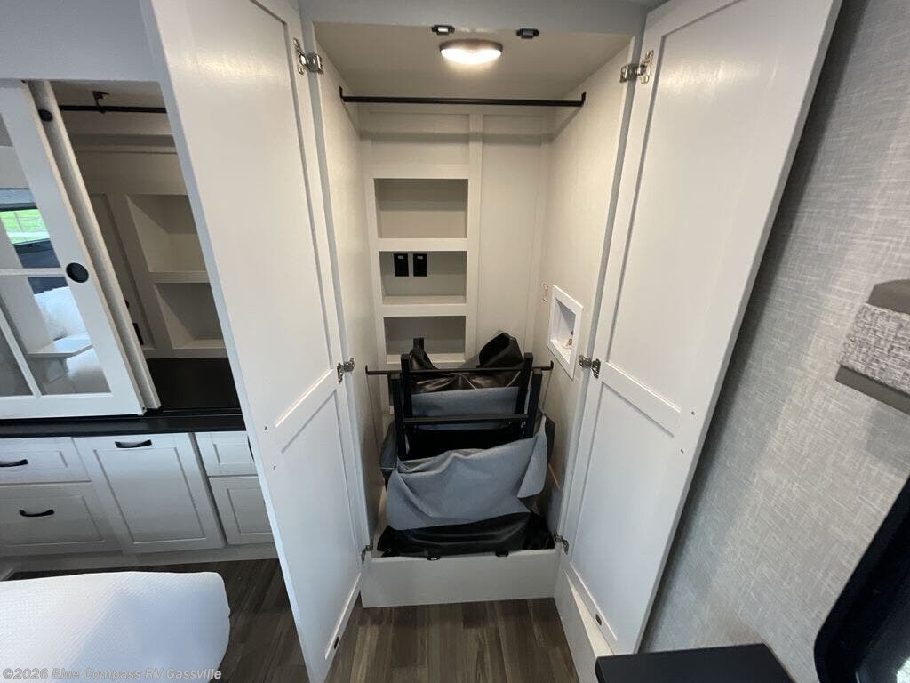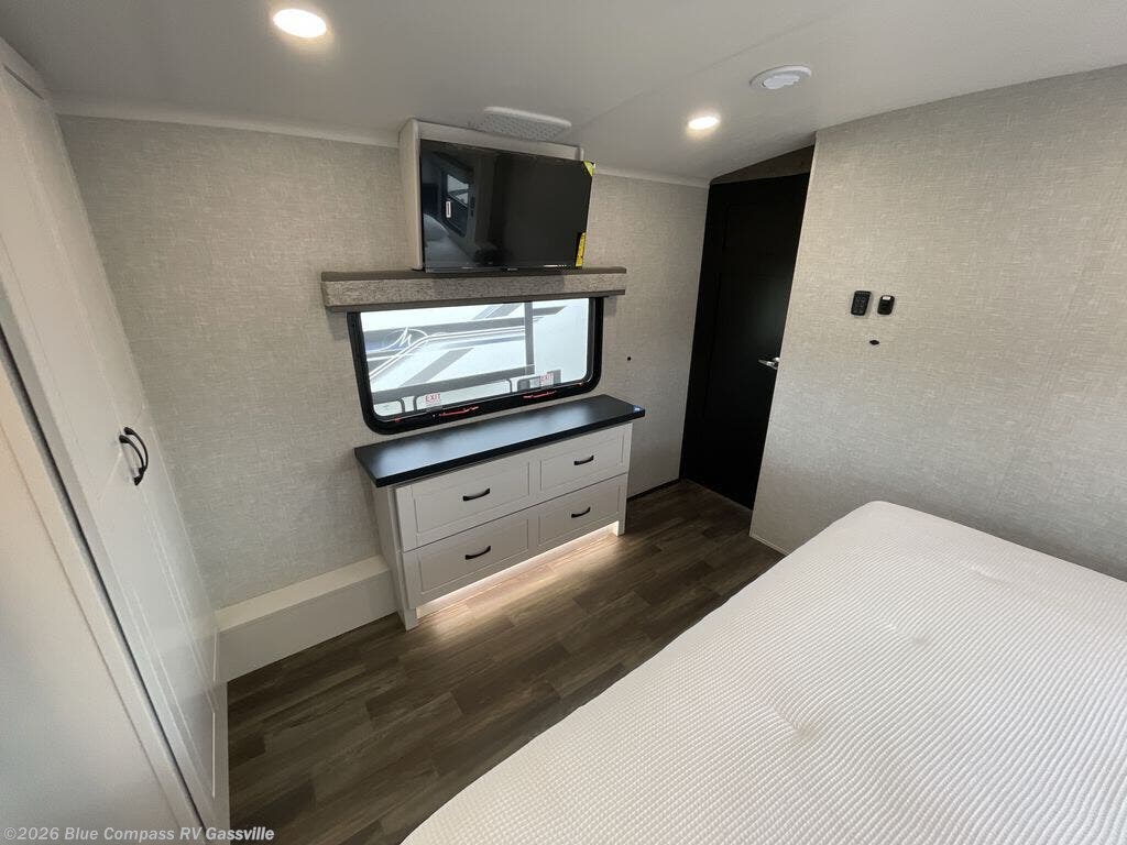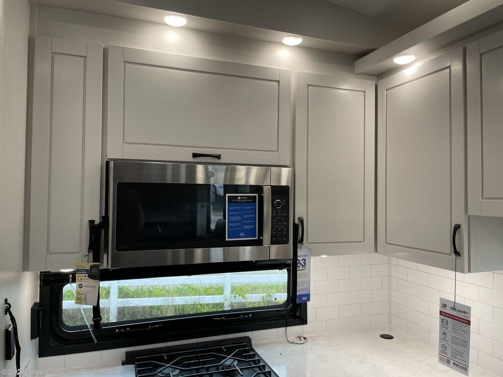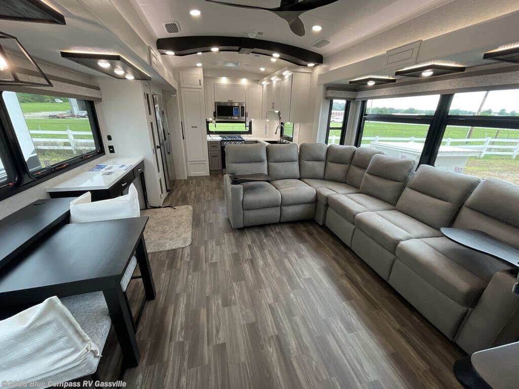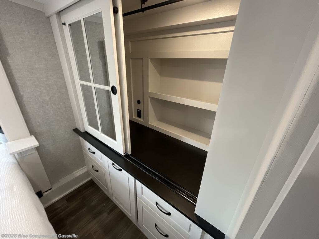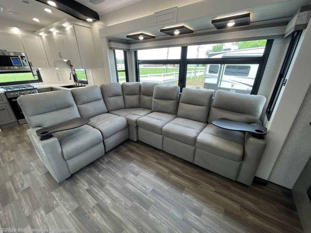 You can't go wrong when camping in this triple slide out fifth wheel! Once you've arrived at your destination and unloaded the pass-through storage, you can make lunch in the rear kitchen with generous counter space. There are also two pantries, one being a pull-out, plus a convenient pull-out butcher block so you can chop fresh veggies! You can enjoy your meal at the roll-top dinette with chairs, and if you need to get some work done, the desk/coffee bar will provide a space for your laptop. An L-shaped sofa and theater seat in the main living area will create an inviting space, plus there is a 65" TV and a mantle with a fireplace just like at home! Freshen up in the full bath at the end of the day, then head to the front private bedroom for a great night's rest on the king bed slide out. There is a closet with drawers and a hamper below, a chest with a TV, plus washer and dryer prep for the option to add these appliances; how convenient!