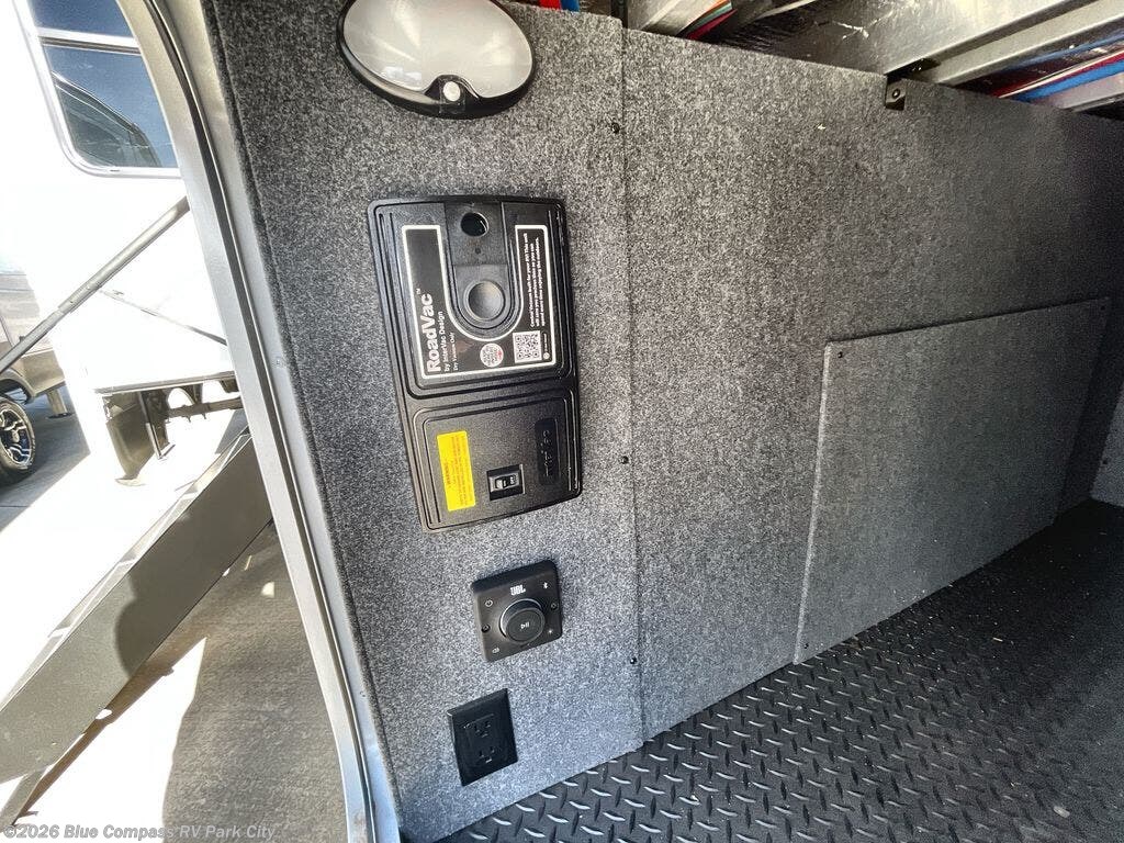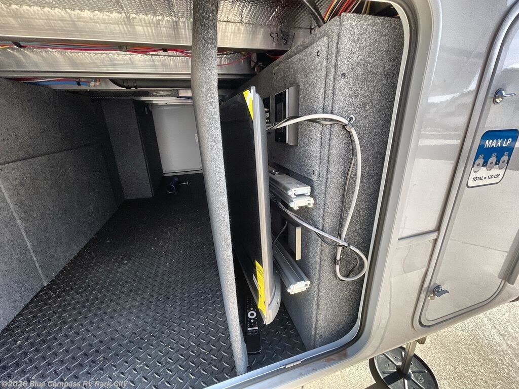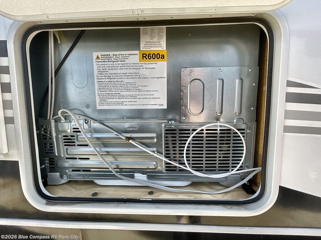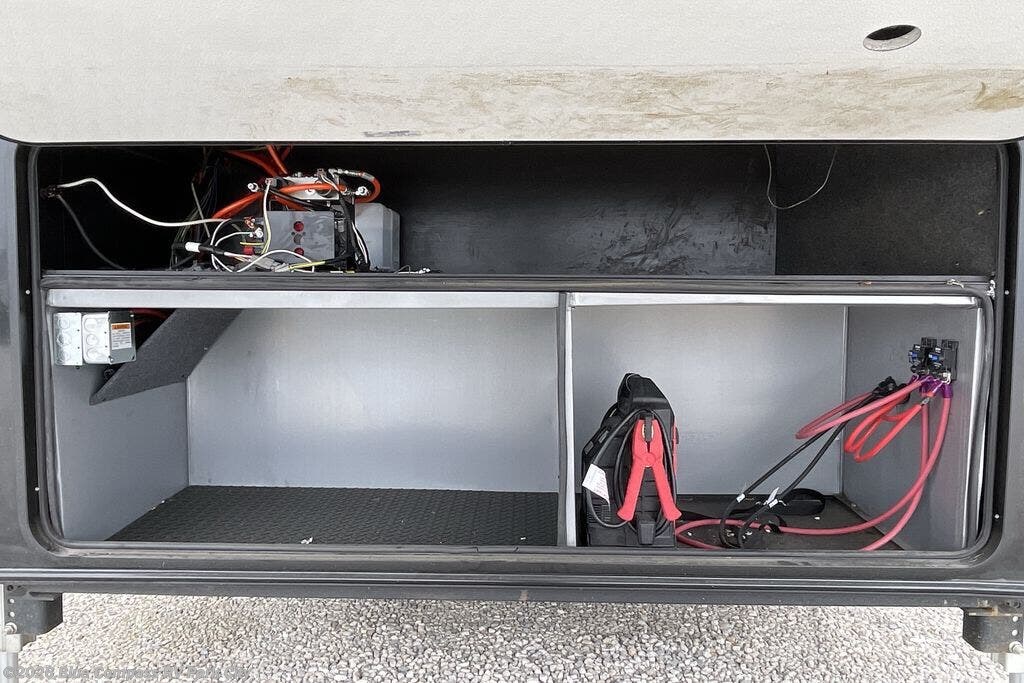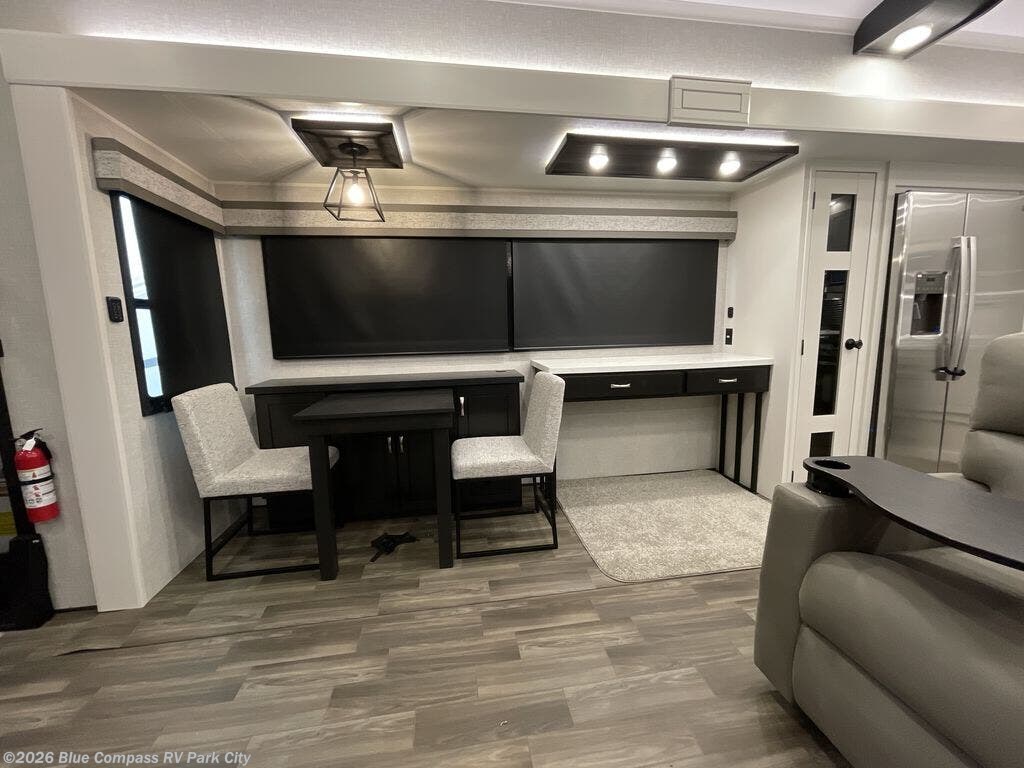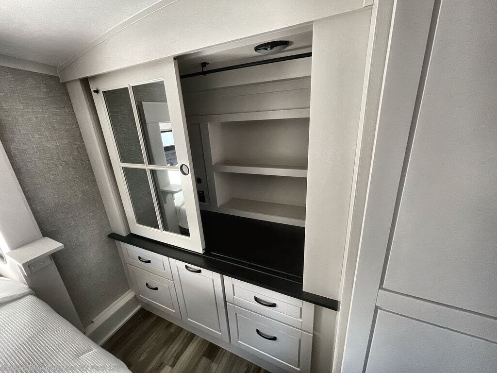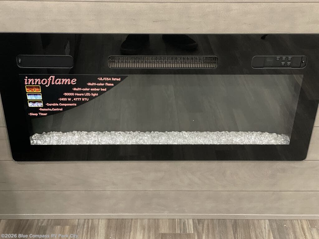 You can't go wrong when camping in this triple slide out fifth wheel! Once you've arrived at your destination and unloaded the pass-through storage, you can make lunch in the rear kitchen with generous counter space. There are also two pantries, one being a pull-out, plus a convenient pull-out butcher block so you can chop fresh veggies! You can enjoy your meal at the roll-top dinette with chairs, and if you need to get some work done, the desk/coffee bar will provide a space for your laptop. An L-shaped sofa and theater seat in the main living area will create an inviting space, plus there is a 65" TV and a mantle with a fireplace just like at home! Freshen up in the full bath at the end of the day, then head to the front private bedroom for a great night's rest on the king bed slide out. There is a closet with drawers and a hamper below, a chest with a TV, plus washer and dryer prep for the option to add these appliances; how convenient!