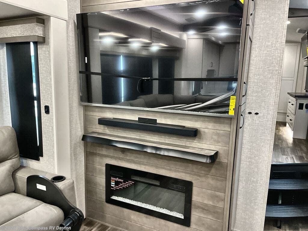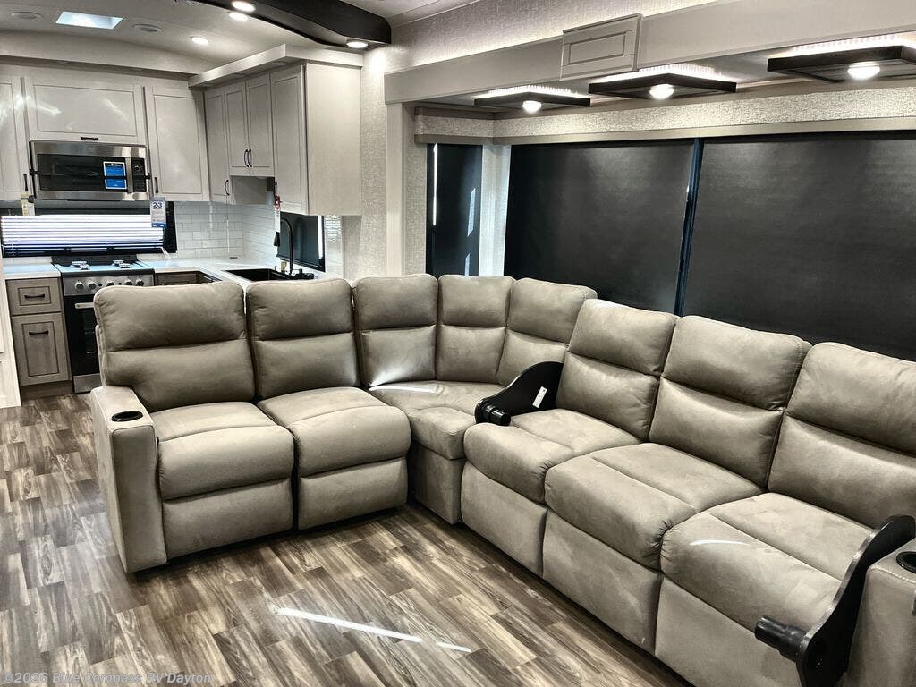 - Spacious Rear Living Area – Enjoy a cozy yet expansive space with plush theater seating, a tri-fold sofa, an entertainment center with a fireplace, and panoramic windows for stunning campsite views.