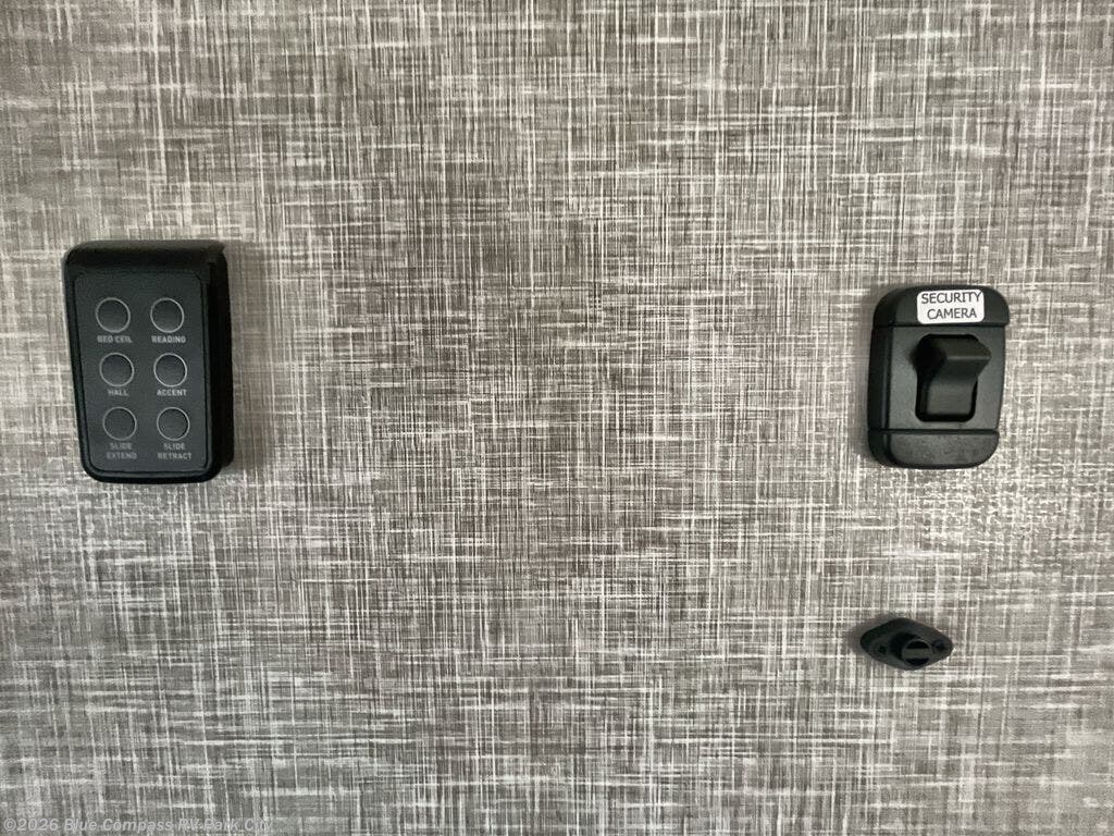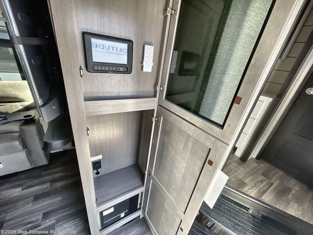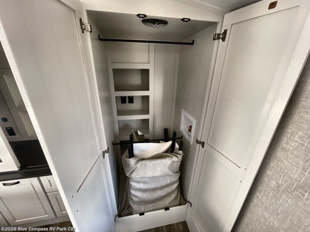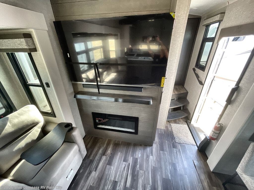 You can't go wrong when camping in this triple slide out fifth wheel! Once you've arrived at your destination and unloaded the pass-through storage, you can make lunch in the rear kitchen with generous counter space. There are also two pantries, one being a pull-out, plus a convenient pull-out butcher block so you can chop fresh veggies! You can enjoy your meal at the roll-top dinette with chairs, and if you need to get some work done, the desk/coffee bar will provide a space for your laptop. An L-shaped sofa and theater seat in the main living area will create an inviting space, plus there is a 65" TV and a mantle with a fireplace just like at home! Freshen up in the full bath at the end of the day, then head to the front private bedroom for a great night's rest on the king bed slide out. There is a closet with drawers and a hamper below, a chest with a TV, plus washer and dryer prep for the option to add these appliances; how convenient!
