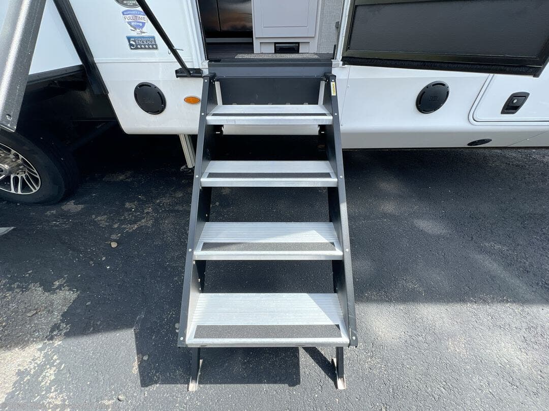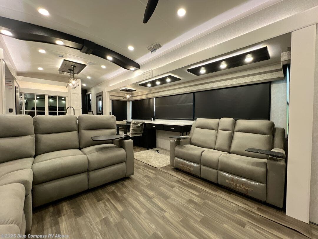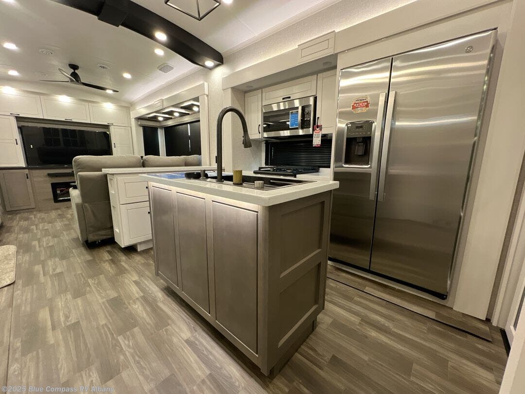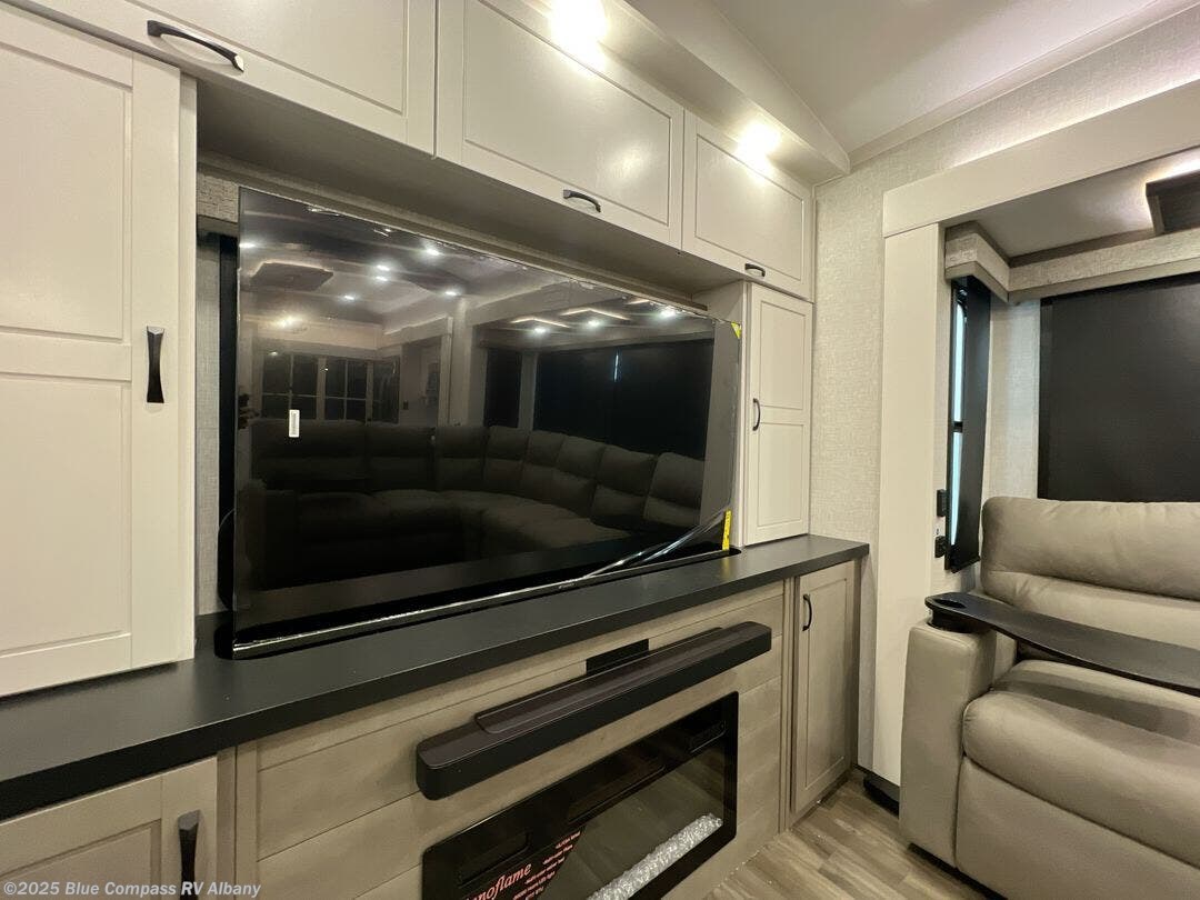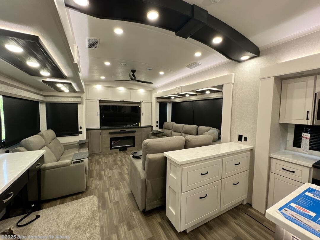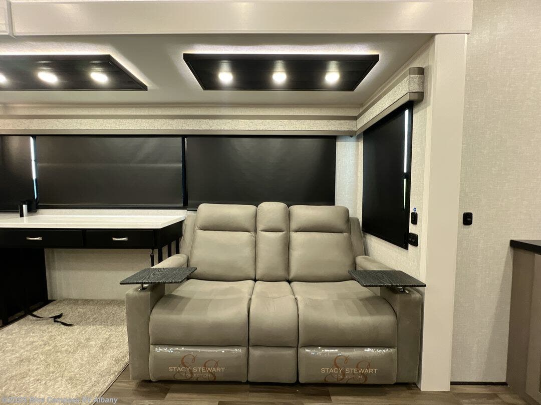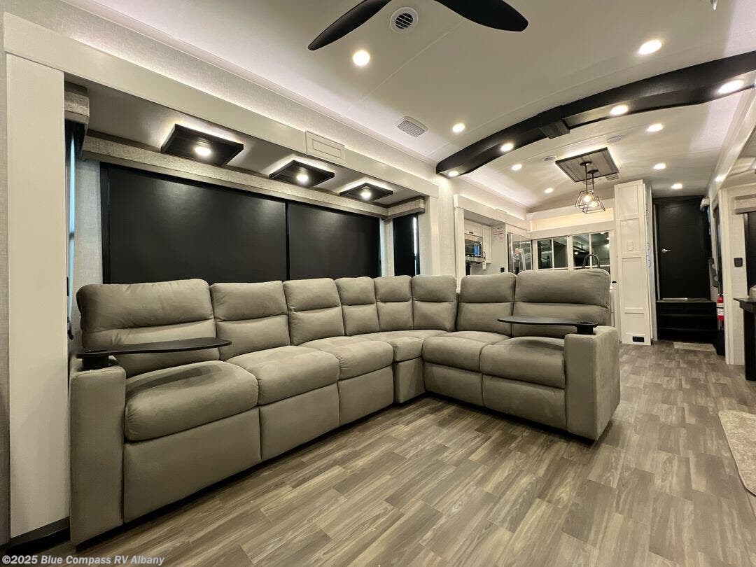 Prepare for great adventures in this fifth wheel! The rear living area features a massive L-shaped sofa which includes a hide-a-bed as well as recliner seats! Plus there's an additional set of theater seats all facing the entertainment center with a fireplace and 50" Smart TV. A flexible desk/coffee bar connects the living room to the kitchen so you can work or relax as needed. Meals will be easy to prepare with the island with sink and pull-out cutting board, plus pantry, microwave, and residential refrigerator. Up front you will find the private bedroom with its king bed, closet with drawers and hamper, and even a second TV. The full bath features a shower with seat and a linen closet for convenient storage. Outside you'll find a pair of awnings and a pull-out griddle.