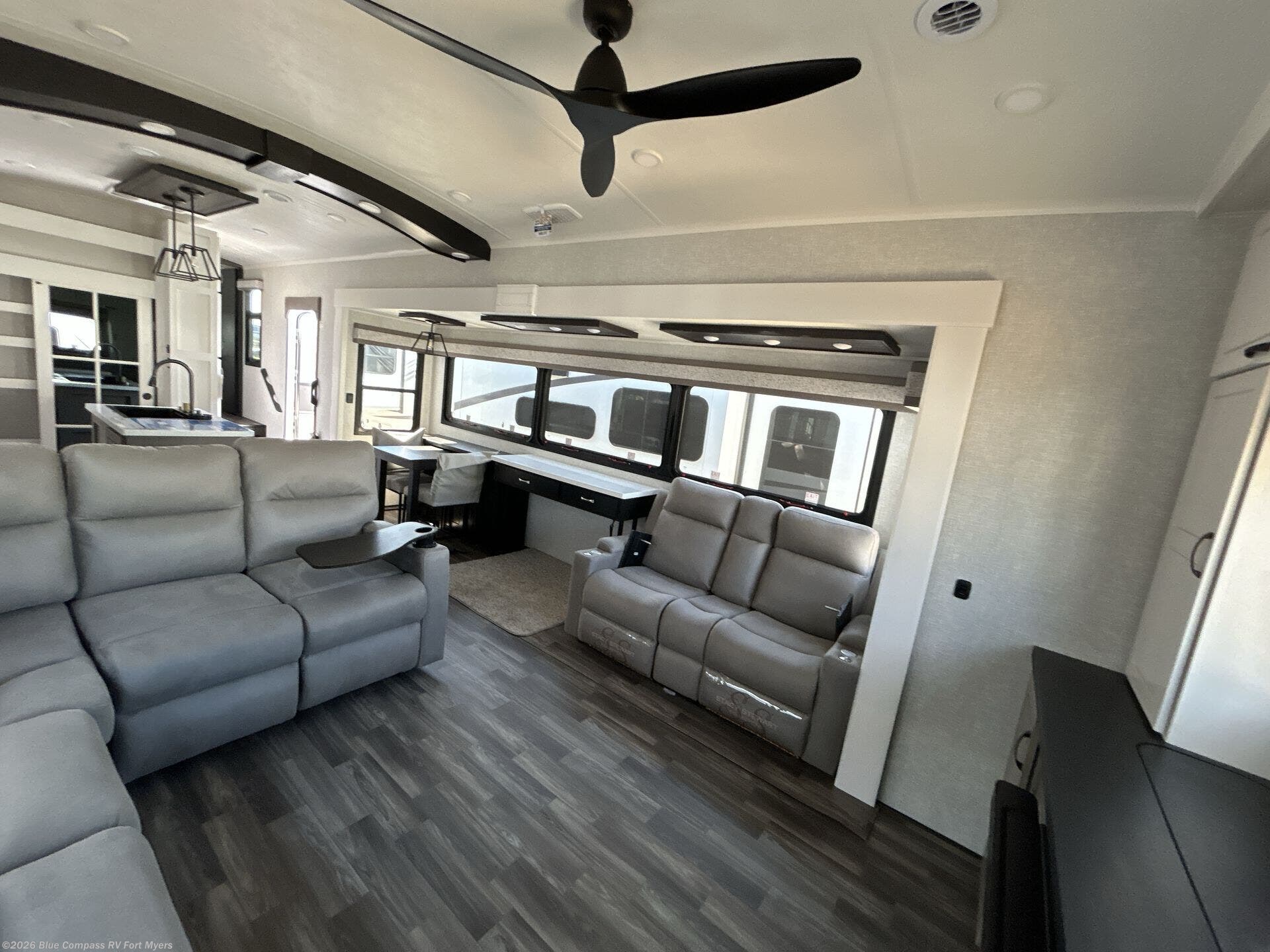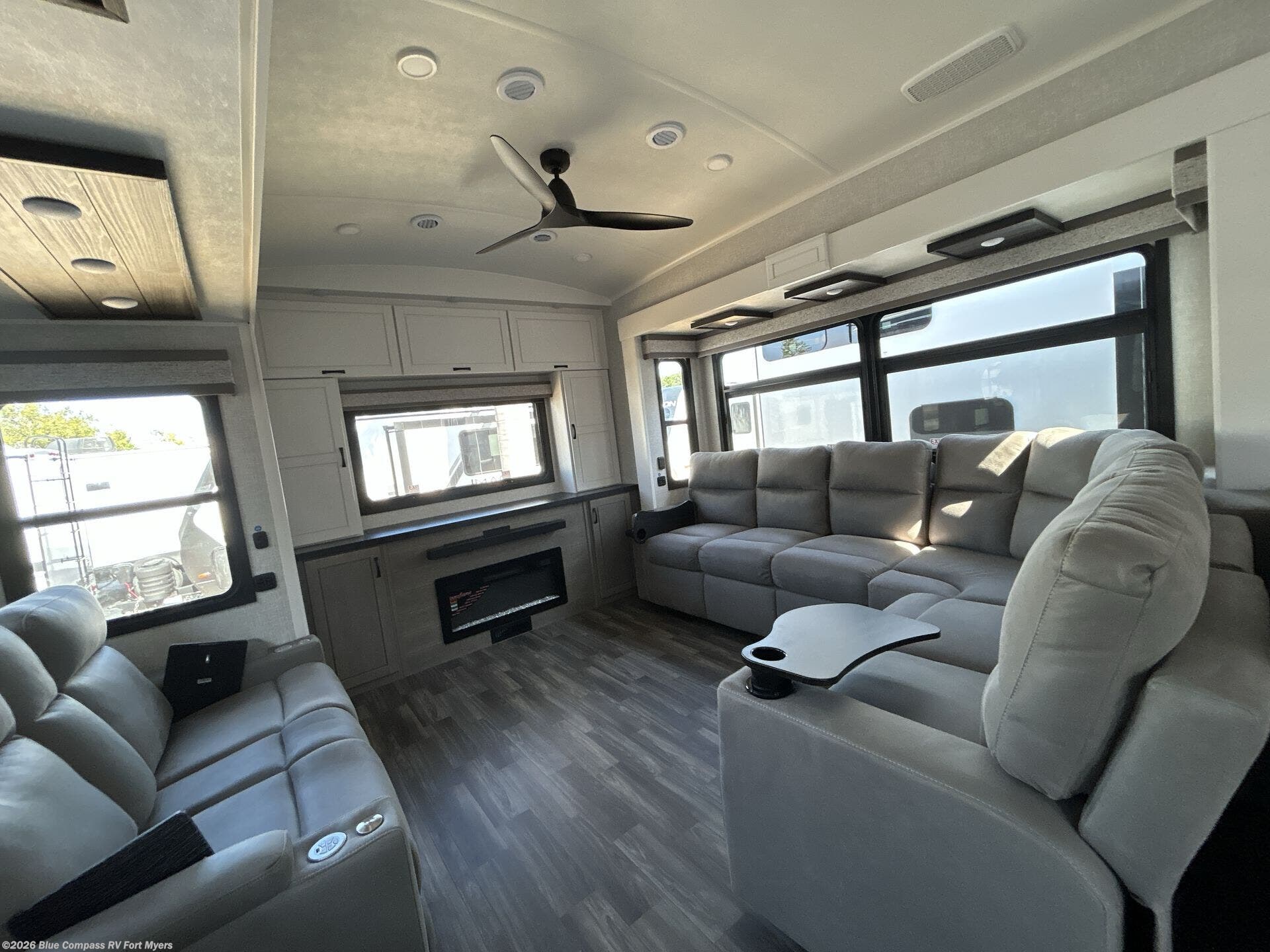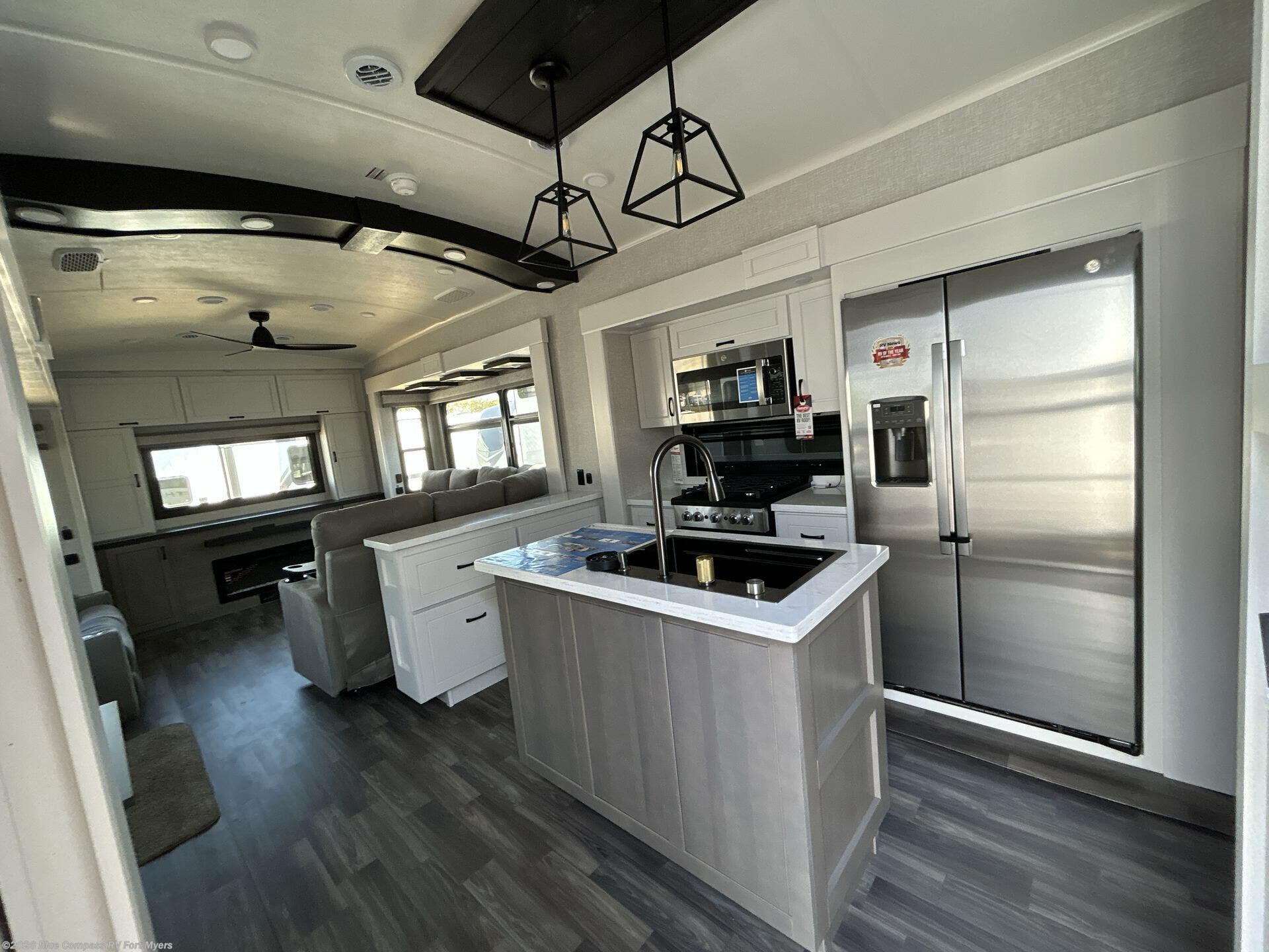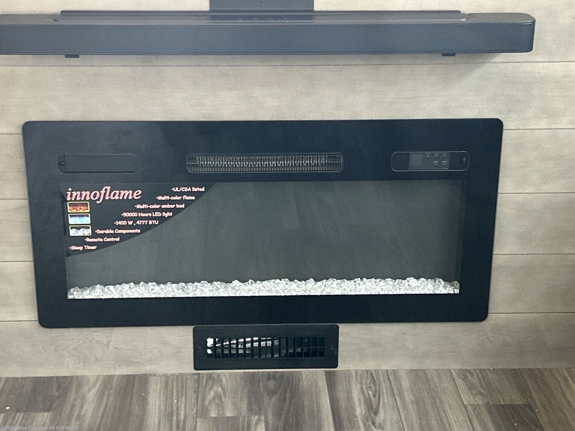 Prepare for great adventures in this fifth wheel! The rear living area features a massive L-shaped sofa which includes a hide-a-bed as well as recliner seats! Plus there's an additional set of theater seats all facing the entertainment center with a fireplace and 50" Smart TV. A flexible desk/coffee bar connects the living room to the kitchen so you can work or relax as needed. Meals will be easy to prepare with the island with sink and pull-out cutting board, plus pantry, microwave, and residential refrigerator. Up front you will find the private bedroom with its king bed, closet with drawers and hamper, and even a second TV. The full bath features a shower with seat and a linen closet for convenient storage. Outside you'll find a pair of awnings and a pull-out griddle.