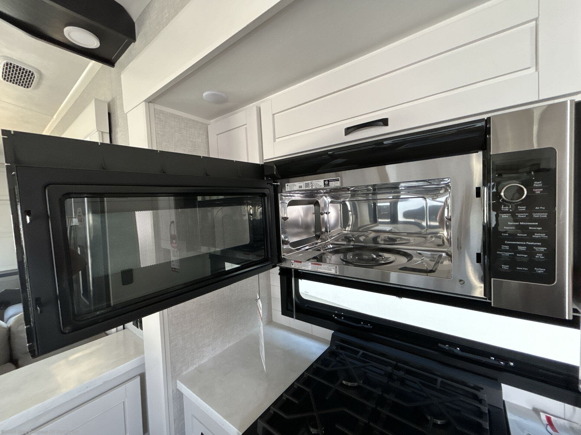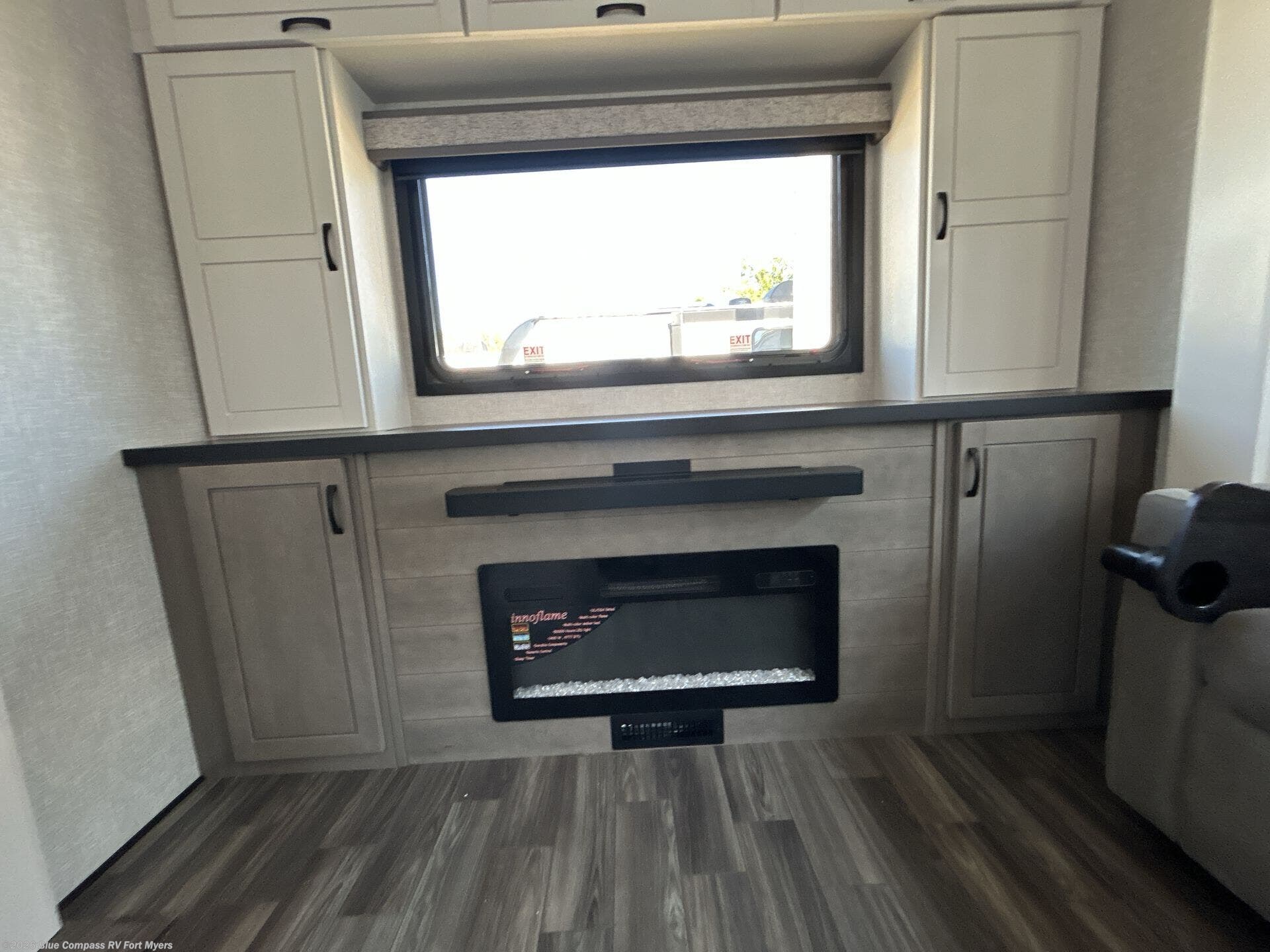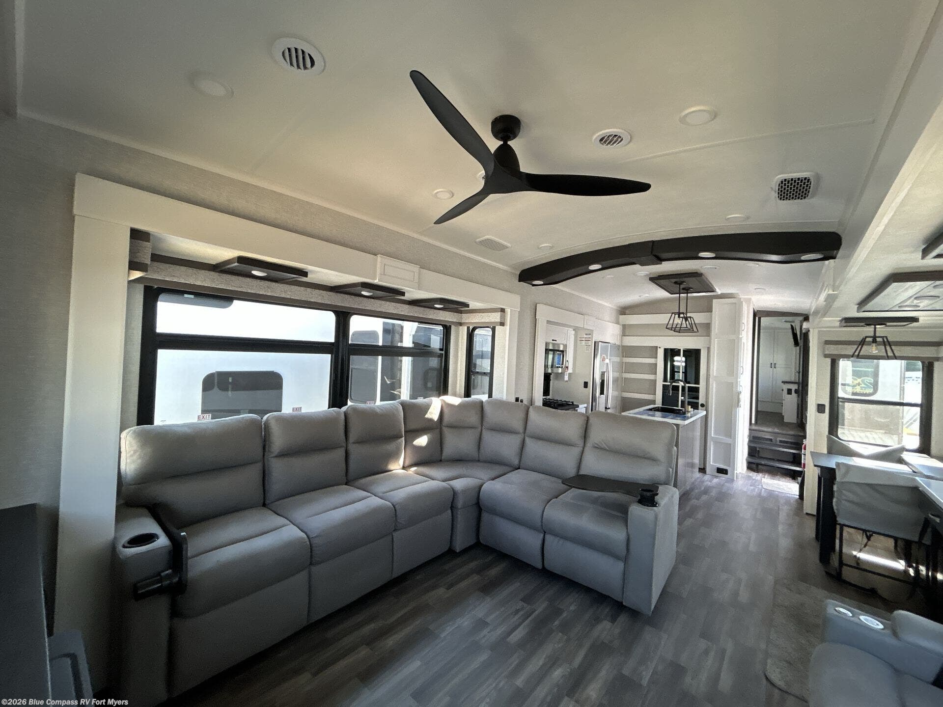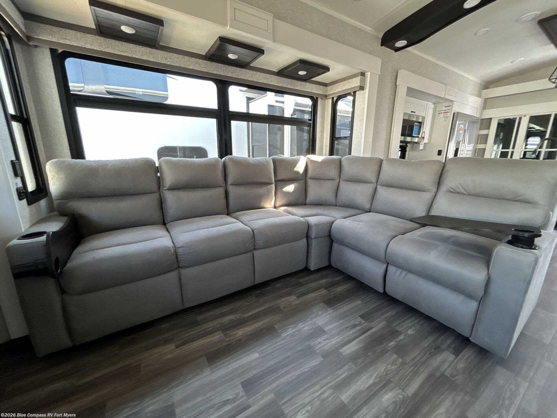 Prepare for great adventures in this fifth wheel! The rear living area features a massive L-shaped sofa which includes a hide-a-bed as well as recliner seats! Plus there's an additional set of theater seats all facing the entertainment center with a fireplace and 50" Smart TV. A flexible desk/coffee bar connects the living room to the kitchen so you can work or relax as needed. Meals will be easy to prepare with the island with sink and pull-out cutting board, plus pantry, microwave, and residential refrigerator. Up front you will find the private bedroom with its king bed, closet with drawers and hamper, and even a second TV. The full bath features a shower with seat and a linen closet for convenient storage. Outside you'll find a pair of awnings and a pull-out griddle.