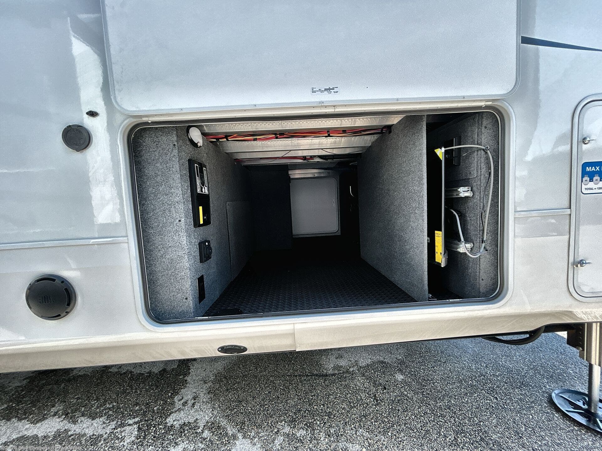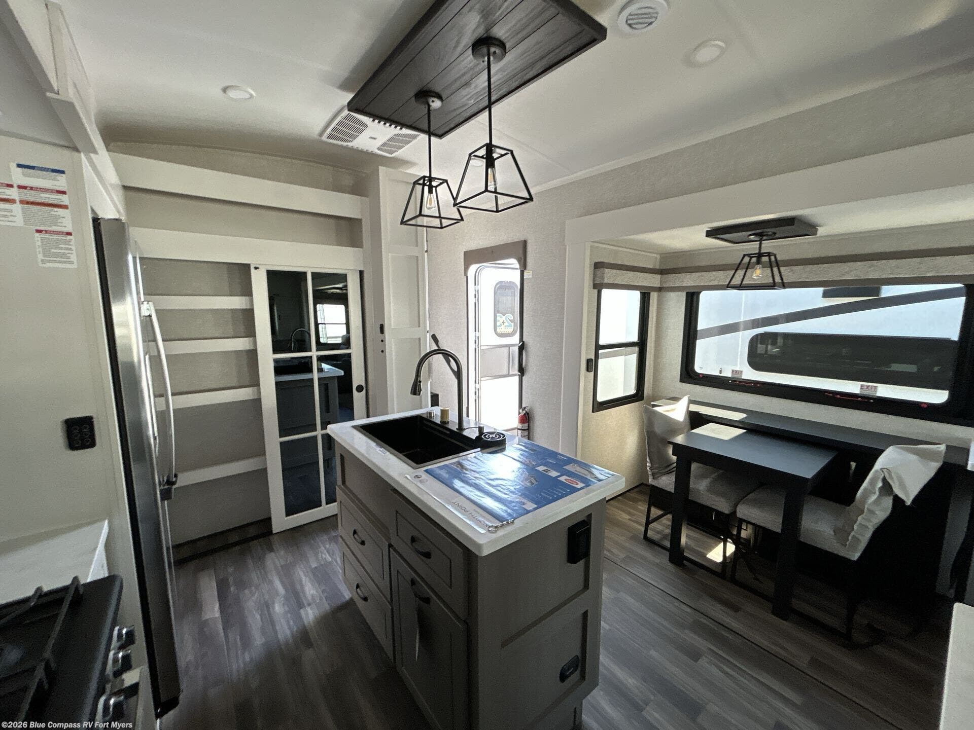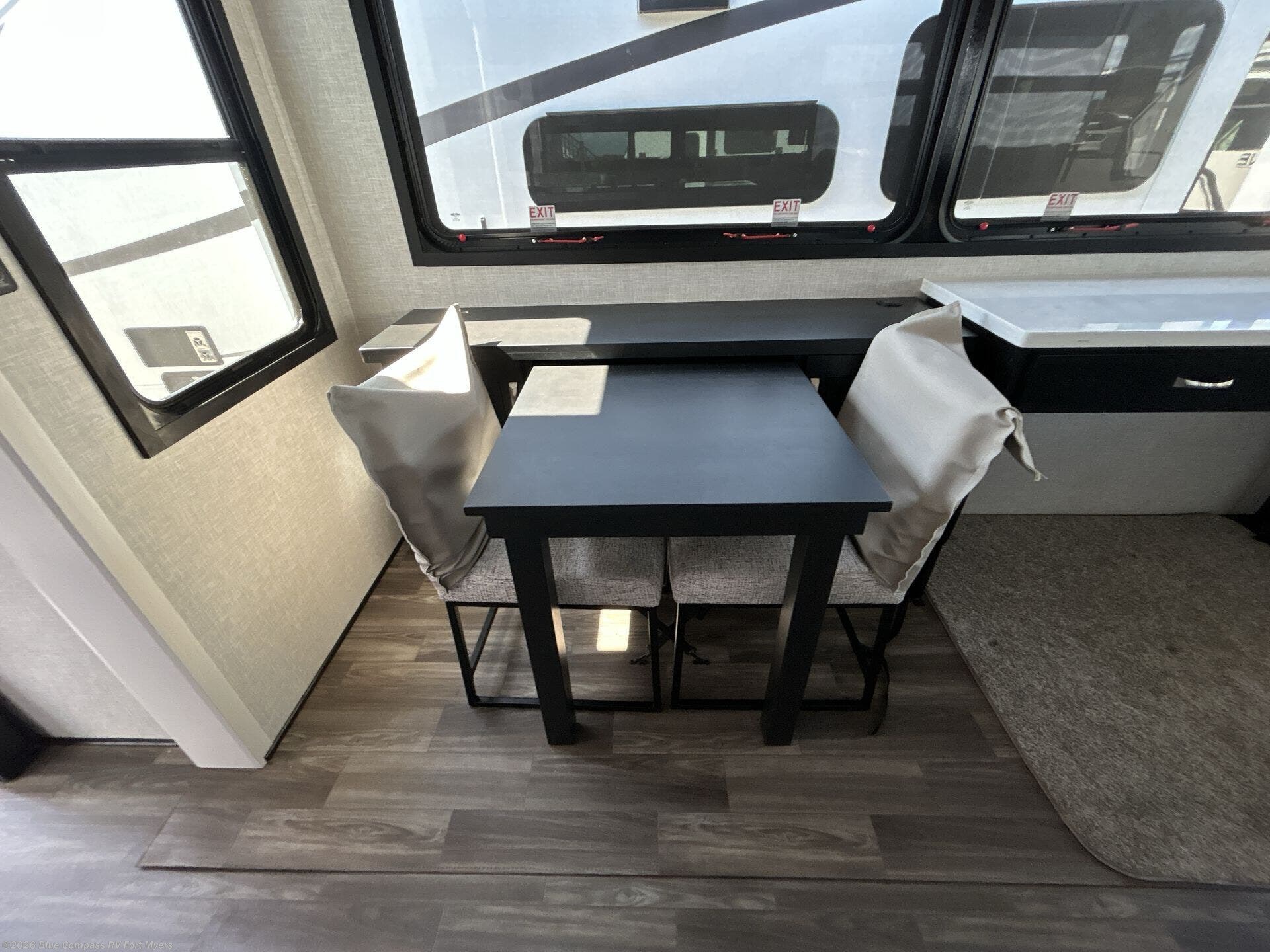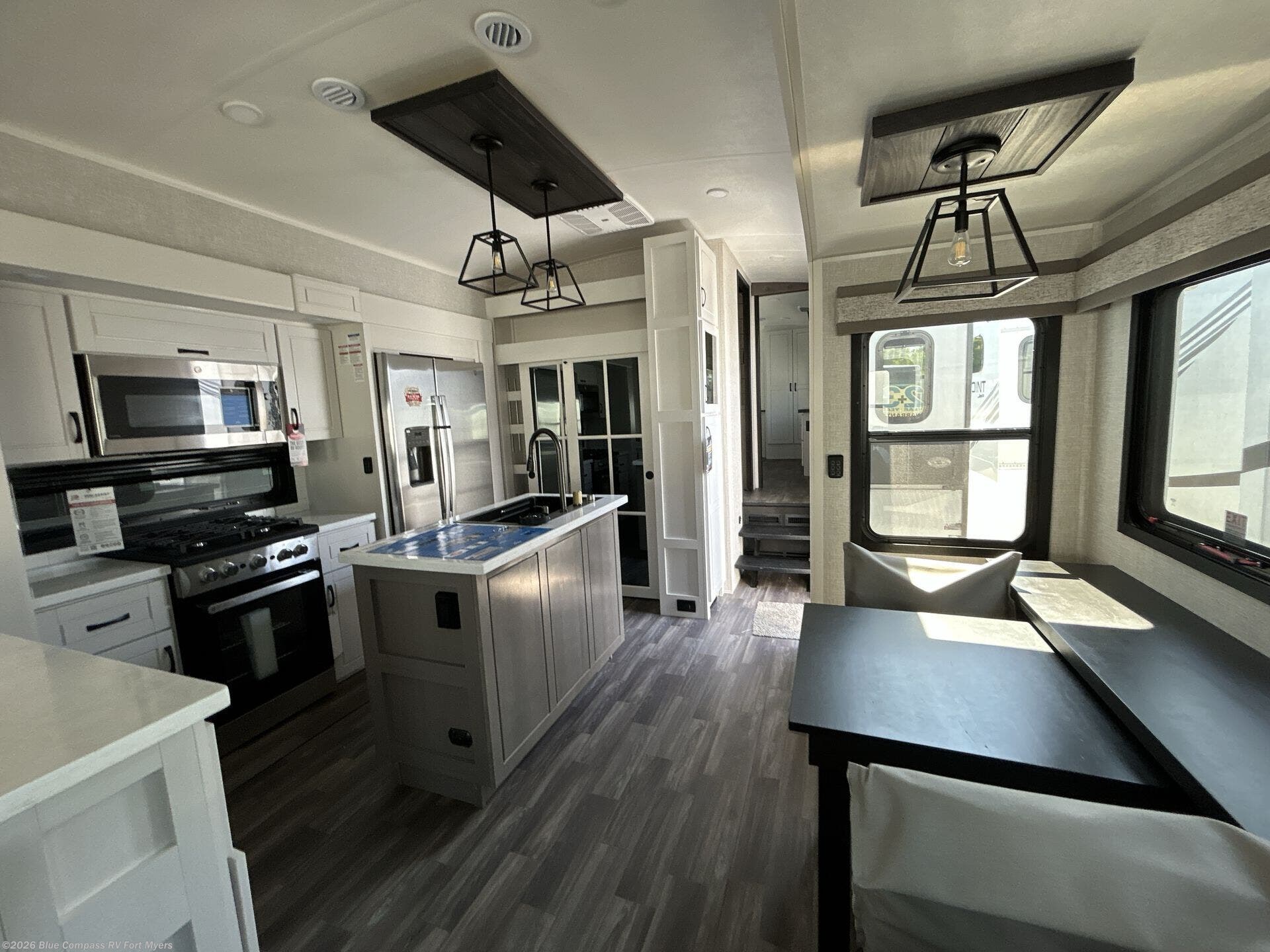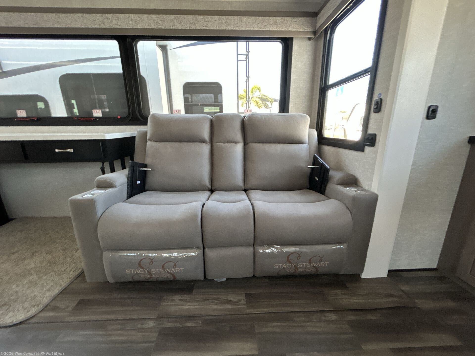 Prepare for great adventures in this fifth wheel! The rear living area features a massive L-shaped sofa which includes a hide-a-bed as well as recliner seats! Plus there's an additional set of theater seats all facing the entertainment center with a fireplace and 50" Smart TV. A flexible desk/coffee bar connects the living room to the kitchen so you can work or relax as needed. Meals will be easy to prepare with the island with sink and pull-out cutting board, plus pantry, microwave, and residential refrigerator. Up front you will find the private bedroom with its king bed, closet with drawers and hamper, and even a second TV. The full bath features a shower with seat and a linen closet for convenient storage. Outside you'll find a pair of awnings and a pull-out griddle.