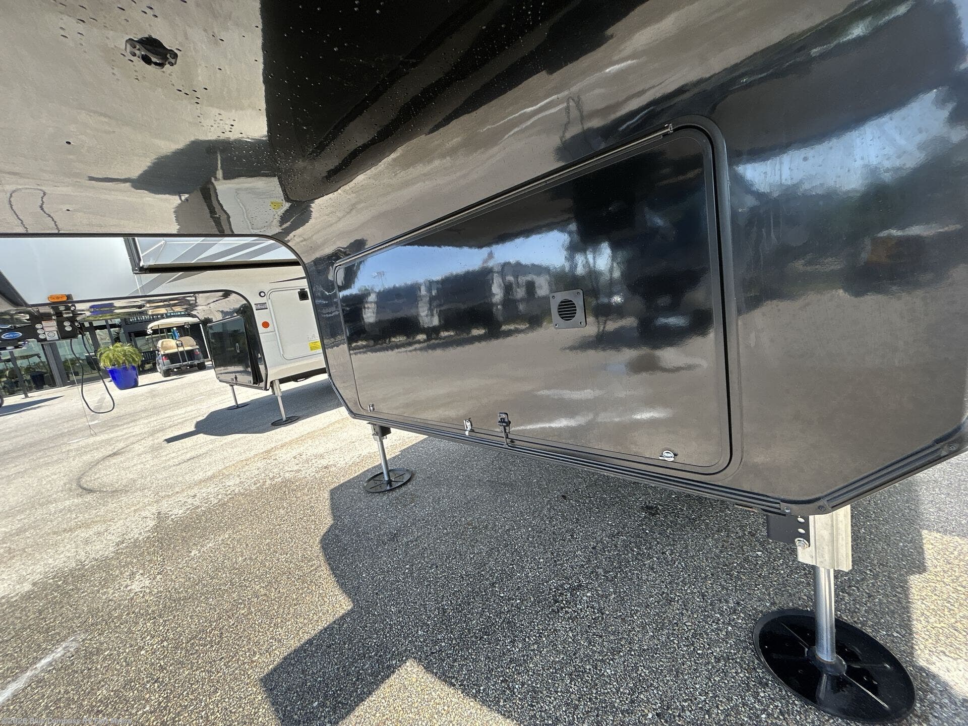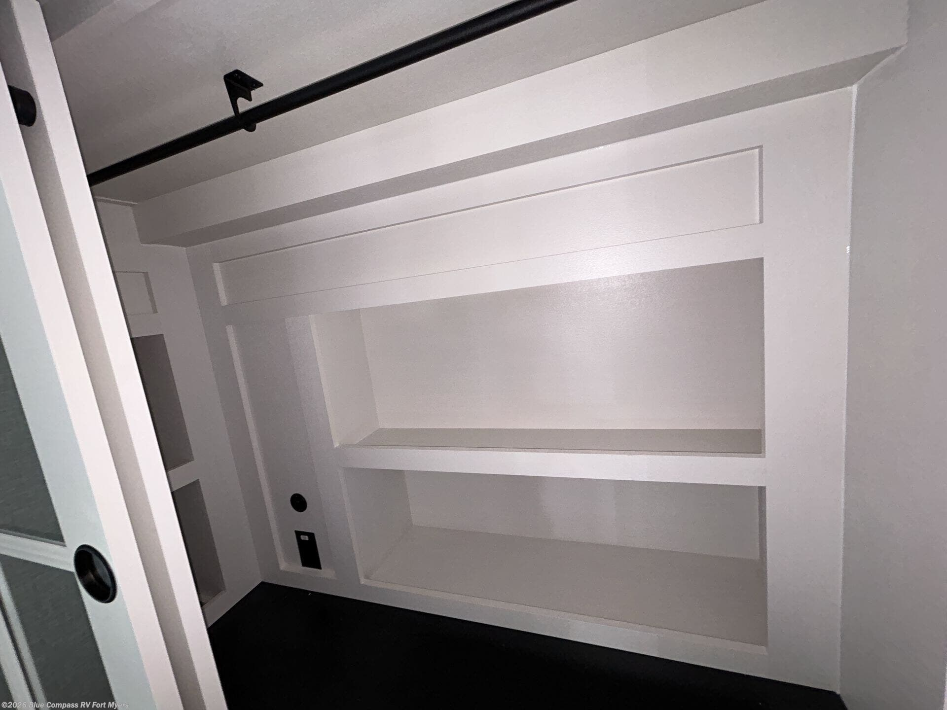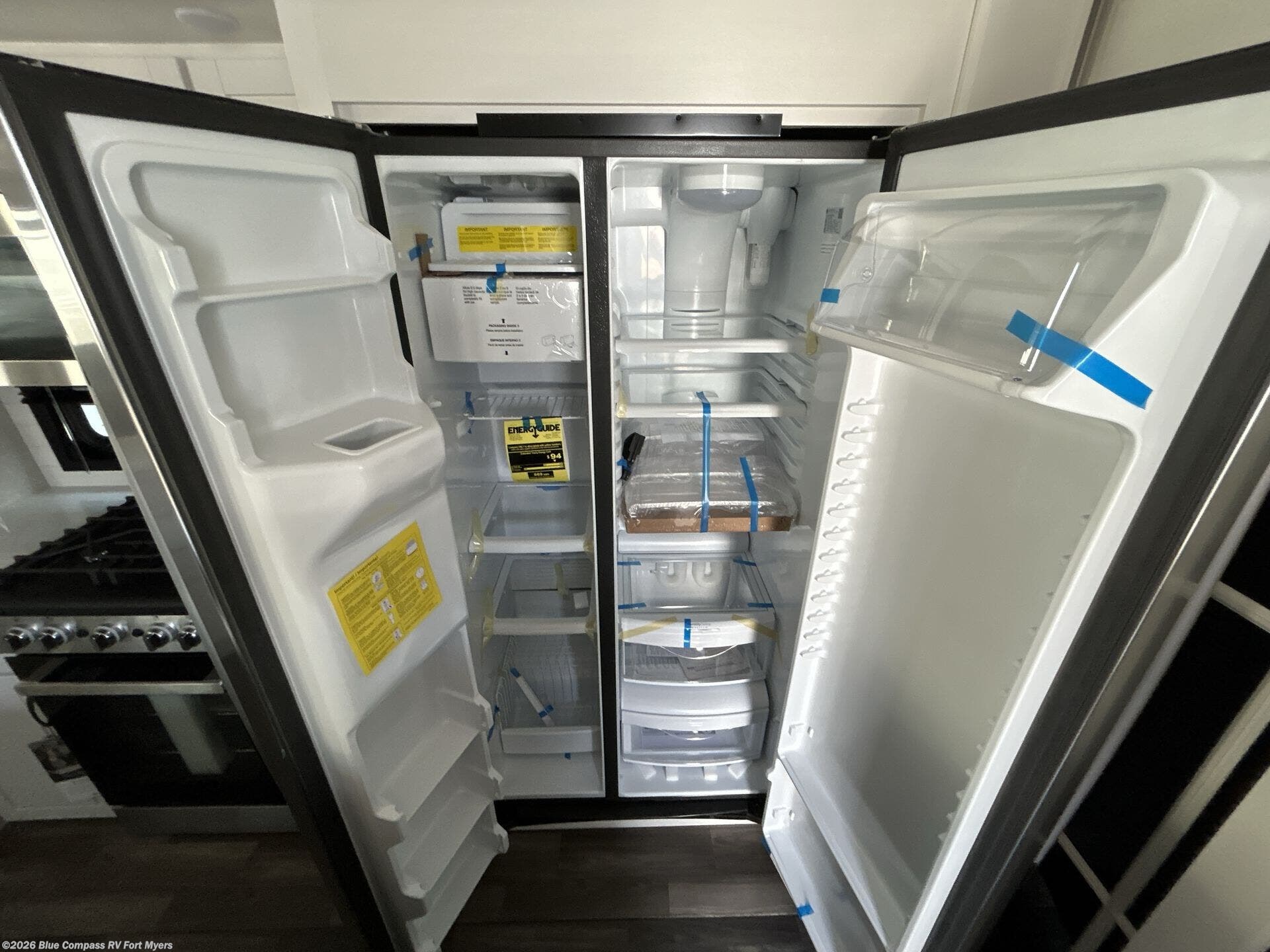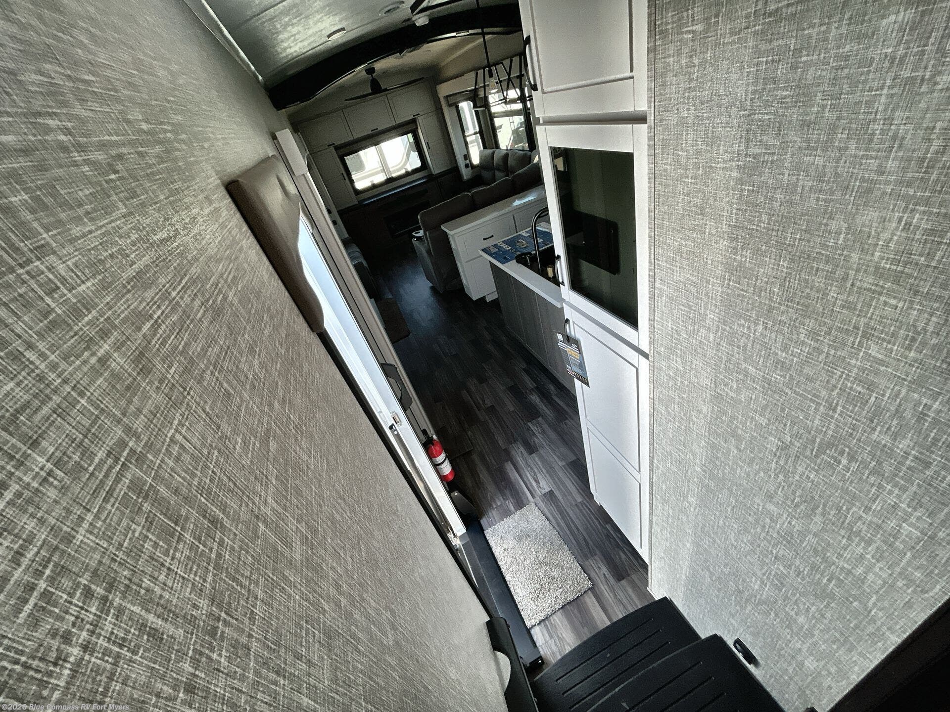 Prepare for great adventures in this fifth wheel! The rear living area features a massive L-shaped sofa which includes a hide-a-bed as well as recliner seats! Plus there's an additional set of theater seats all facing the entertainment center with a fireplace and 50" Smart TV. A flexible desk/coffee bar connects the living room to the kitchen so you can work or relax as needed. Meals will be easy to prepare with the island with sink and pull-out cutting board, plus pantry, microwave, and residential refrigerator. Up front you will find the private bedroom with its king bed, closet with drawers and hamper, and even a second TV. The full bath features a shower with seat and a linen closet for convenient storage. Outside you'll find a pair of awnings and a pull-out griddle.