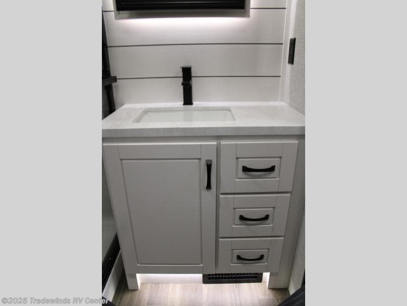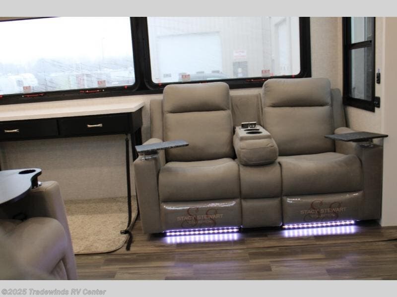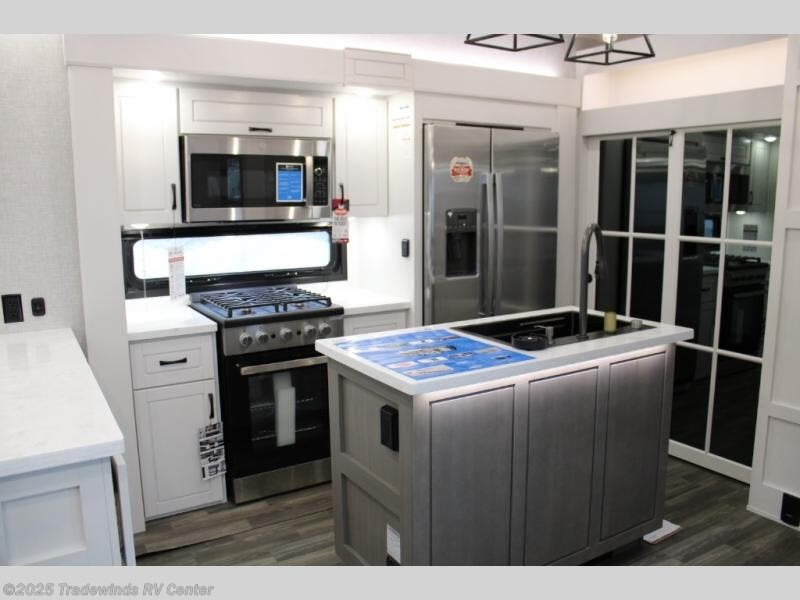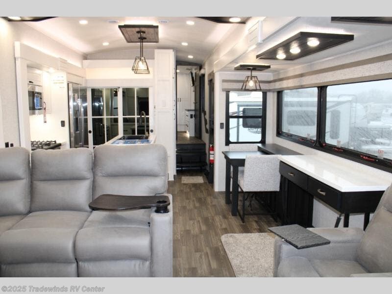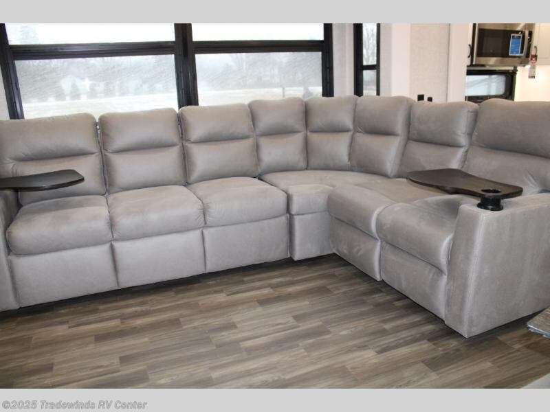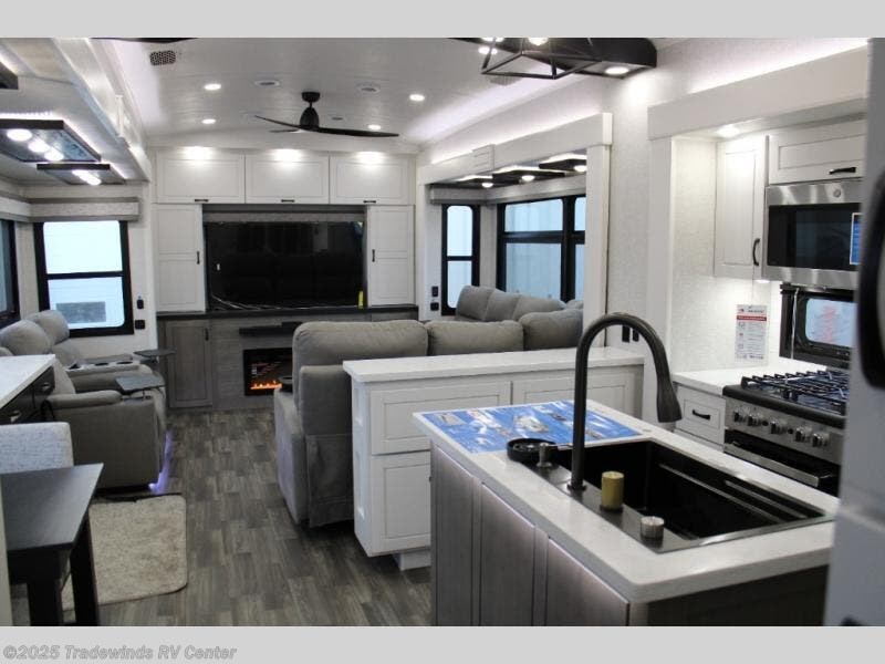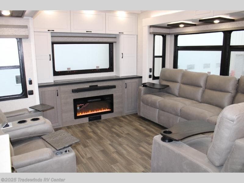 Prepare for great adventures in this fifth wheel! The rear living area features a massive L-shaped sofa which includes a hide-a-bed as well as recliner seats! Plus there's an additional set of theater seats all facing the entertainment center with a fireplace and 50" Smart TV. A flexible desk/coffee bar connects the living room to the kitchen so you can work or relax as needed. Meals will be easy to prepare with the island with sink and pull-out cutting board, plus pantry, microwave, and residential refrigerator. Up front you will find the private bedroom with its king bed, closet with drawers and hamper, and even a second TV. The full bath features a shower with seat and a linen closet for convenient storage. Outside you'll find a pair of awnings and a pull-out griddle.