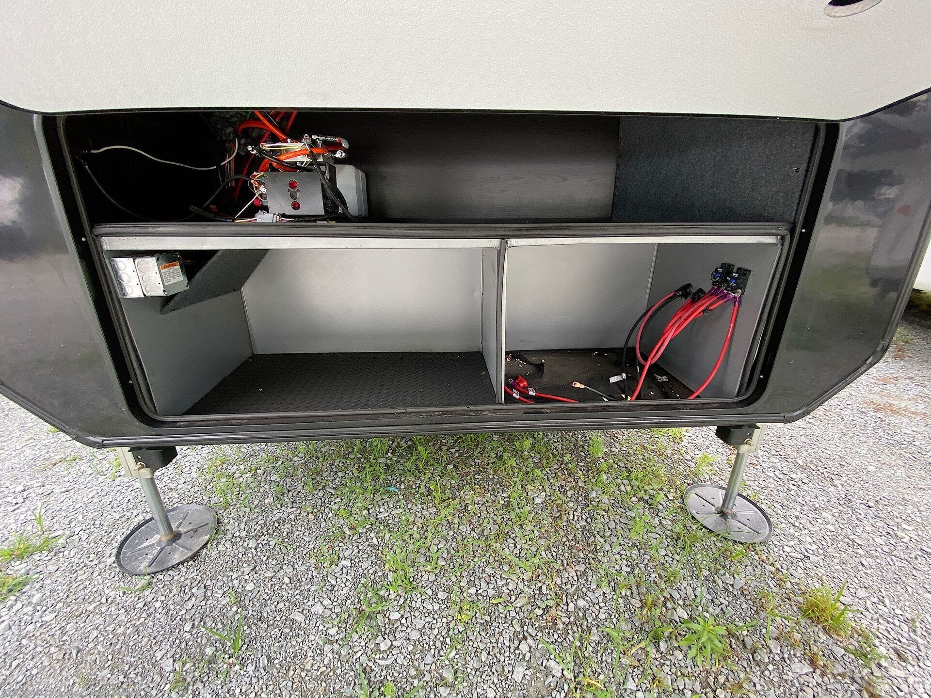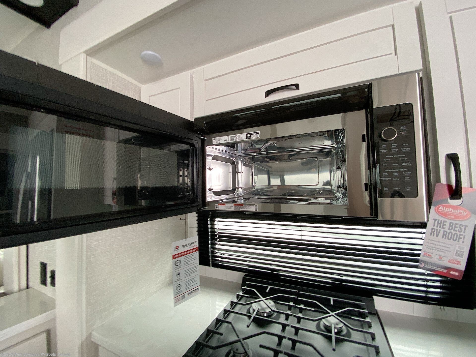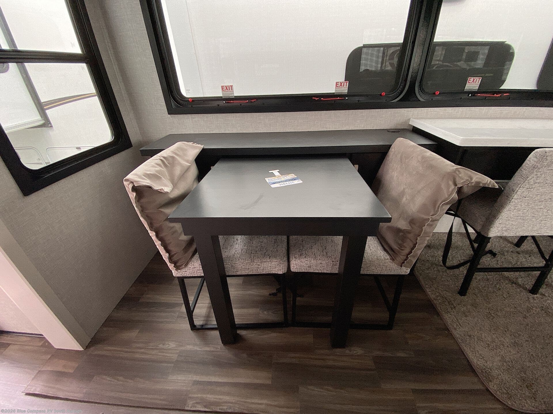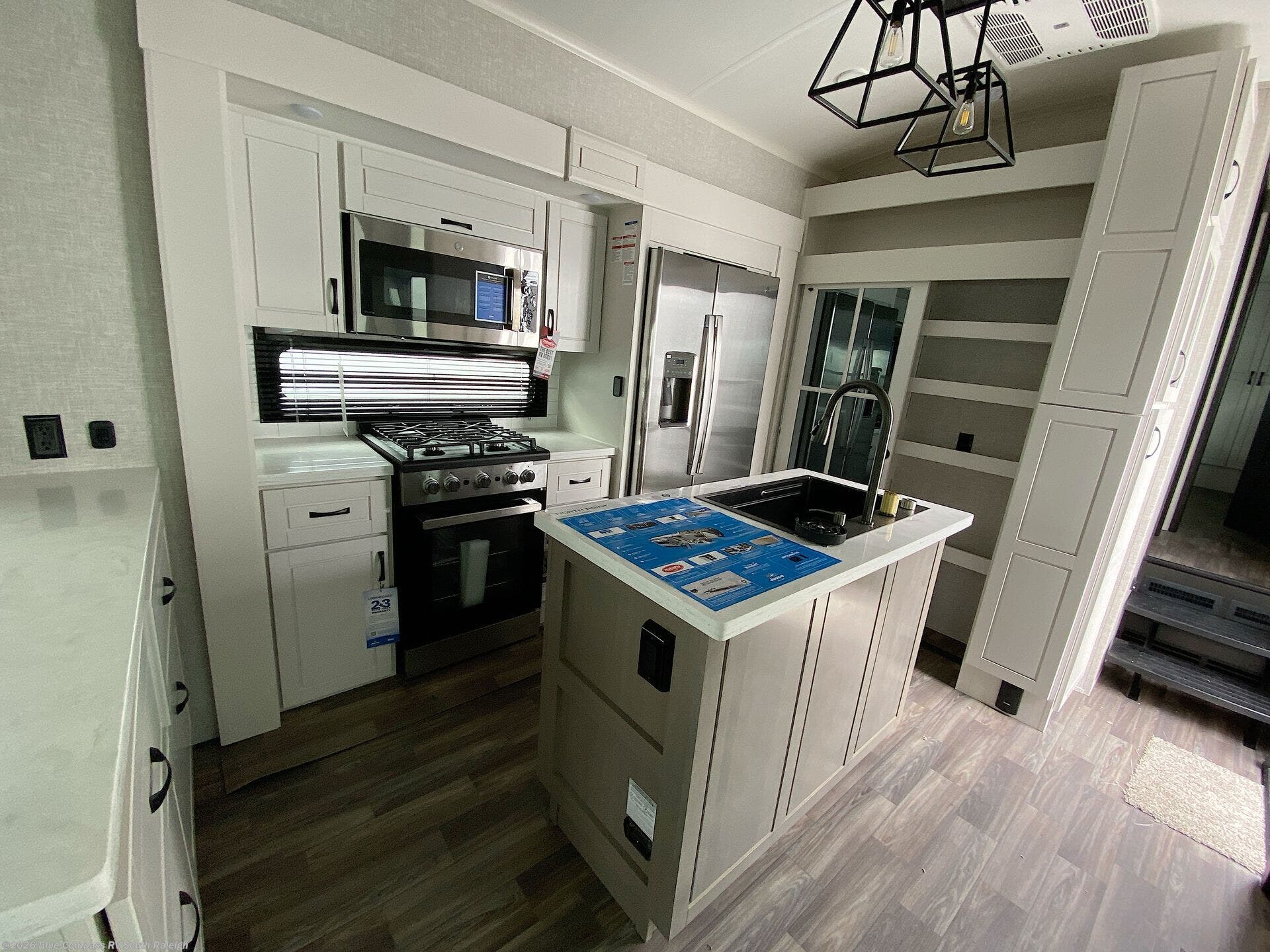Prepare for great adventures in this fifth wheel! The rear living area features a massive L-shaped sofa which includes a hide-a-bed as well as recliner seats! Plus there's an additional set of theater seats all facing the entertainment center with a fireplace and 50" Smart TV. A flexible desk/coffee bar connects the living room to the kitchen so you can work or relax as needed. Meals will be easy to prepare with the island with sink and pull-out cutting board, plus pantry, microwave, and residential refrigerator. Up front you will find the private bedroom with its king bed, closet with drawers and hamper, and even a second TV. The full bath features a shower with seat and a linen closet for convenient storage. Outside you'll find a pair of awnings and a pull-out griddle.