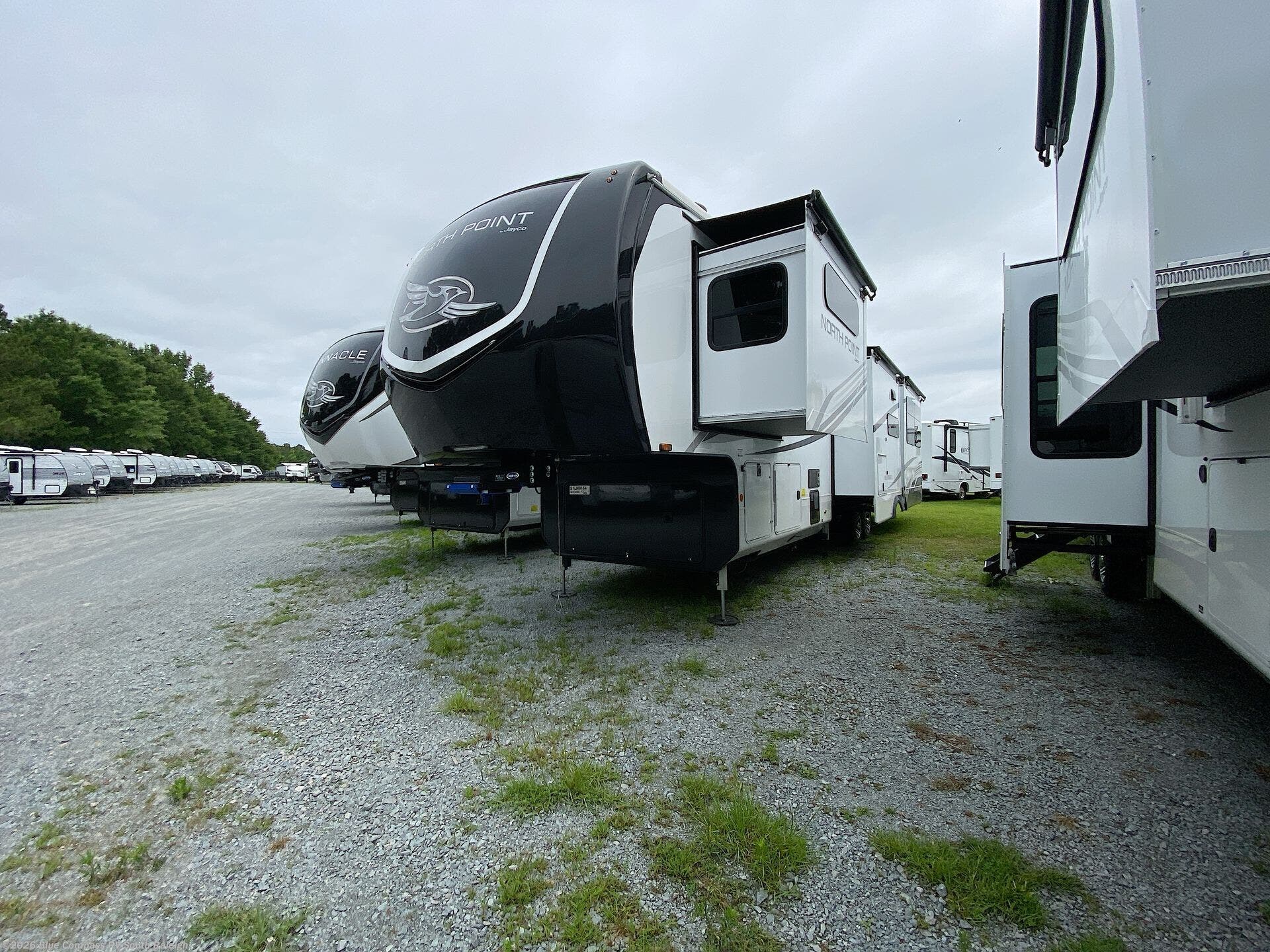 With any North Point fifth wheel by Jayco you begin with a strong foundation with a custom frame, designed and sized specifically to best support each unit. Constructed with Stronghold VBL™ aluminum framed, vacuum bond laminated walls and the Magnum Truss™ XL6™ roof system with a one-piece, seamless roof material, which is the strongest tested roof in the industry. The 5-Star Handling package is included with Uniroyal tires, a MORryde rubber pin box, Dexter axles with Nev-R-Adjust brakes, MORryde CRE-3000 rubberized suspension and wet bolt fasteners and bronze bushings. The interior has handcrafted hardwood glazed doors and drawers, vinyl flooring throughout, an integrated under-mount sink in the main bathroom, plus so much more you just have to see one to believe it all!