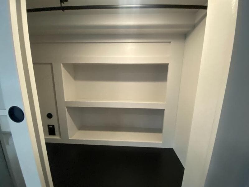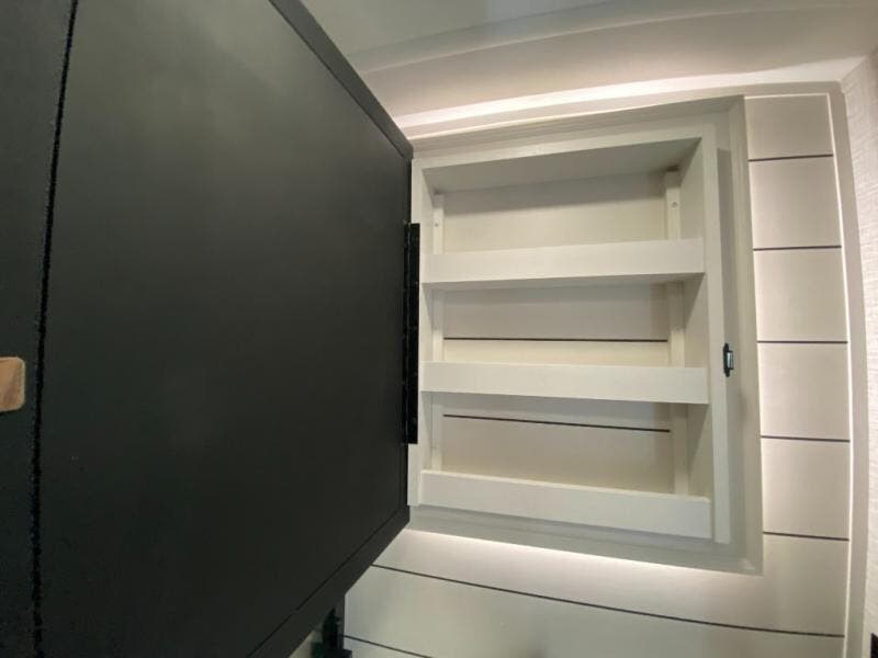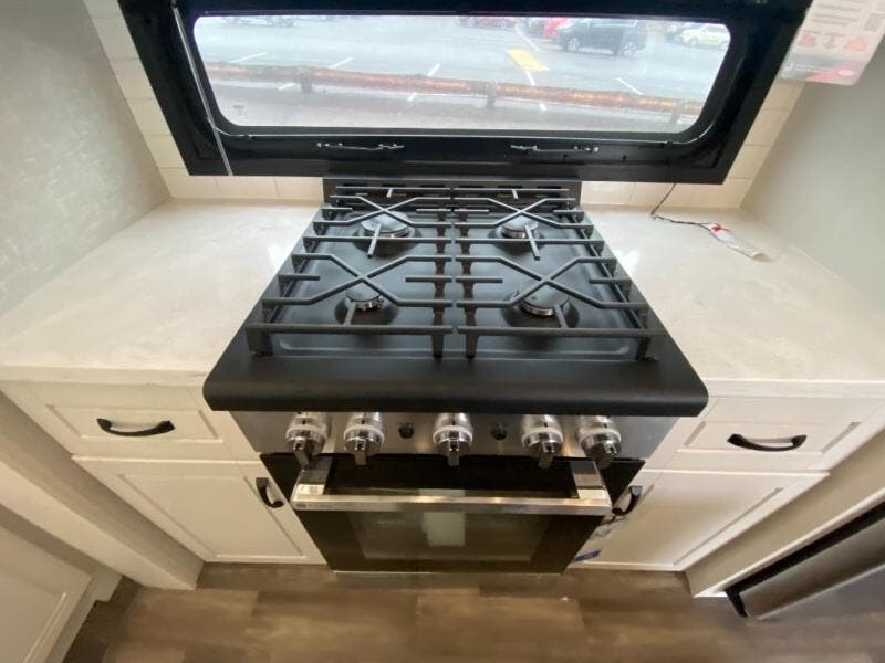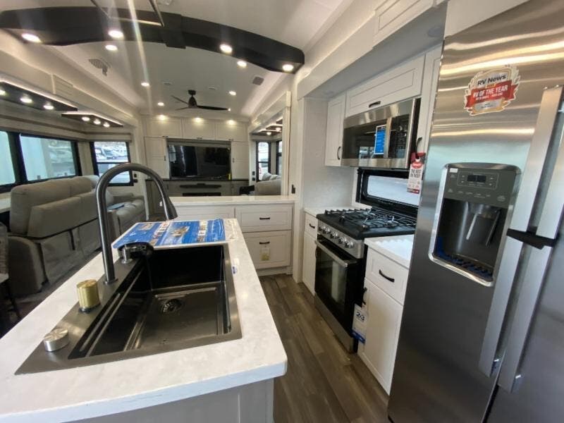 Prepare for great adventures in this fifth wheel! The rear living area features a massive L-shaped sofa which includes a hide-a-bed as well as recliner seats! Plus there's an additional theater seat all facing the entertainment center with a fireplace and 50" Smart TV. A flexible desk/coffee bar connects the living room to the kitchen so you can work or relax as needed. Meals will be easy to prepare with the island with sink and pull-out cutting board, plus pantry, microwave, and residential refrigerator. Up front you will find the private bedroom with its king bed, closet with drawers and hamper, and even a second TV. The full bath features a shower with seat and a linen closet for convenient storage.