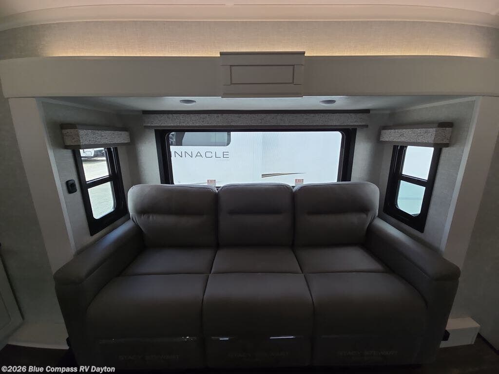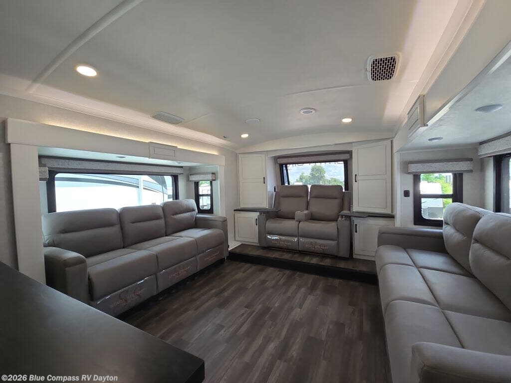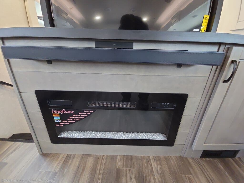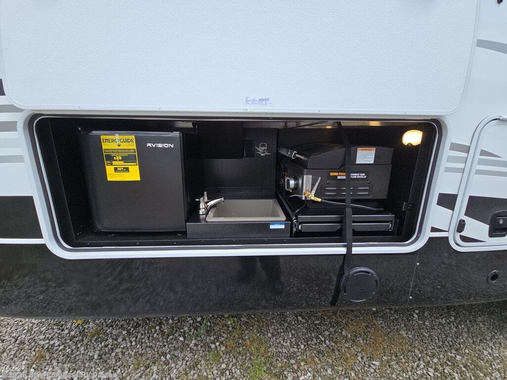 Entertainment can be found throughout this fifth wheel from the front living area with a 50" Smart LED HDTV with fully digital HDMI output and home entertainment system with subwoofer including a fireplace below that you can enjoy while relaxing on theater seats and two tri-fold sofas, a 32" TV in the middle kitchen and there is a bedroom 32" TV. You might even like to add the tailgate TV option along the exterior. Back inside the kitchen, the cook will love the center island, the pantry, the residential refrigerator, and the roll-top dinette. The half bath is a few steps away as an added convenience. The master bedroom includes a king bed slide, a bench, two wardrobes and a sliding door into the bathroom which offers two sinks, a space prepped for a washer/dryer option, and a walk-in shower. And don't forget about the exterior features such as the outside kitchen for more choices when making meals, the storage for your outdoor gear and chairs, and two awnings with integrated LED lighting.