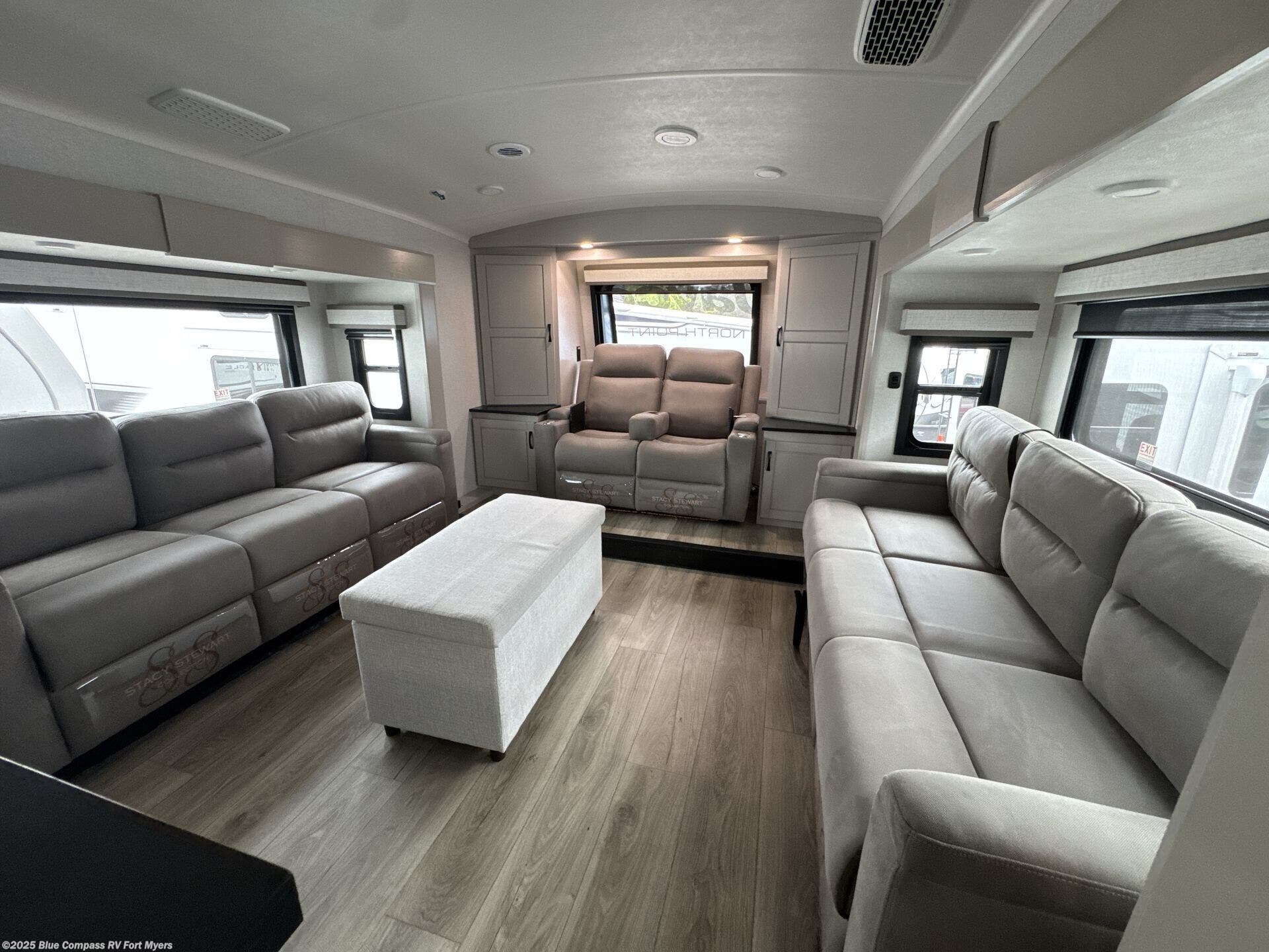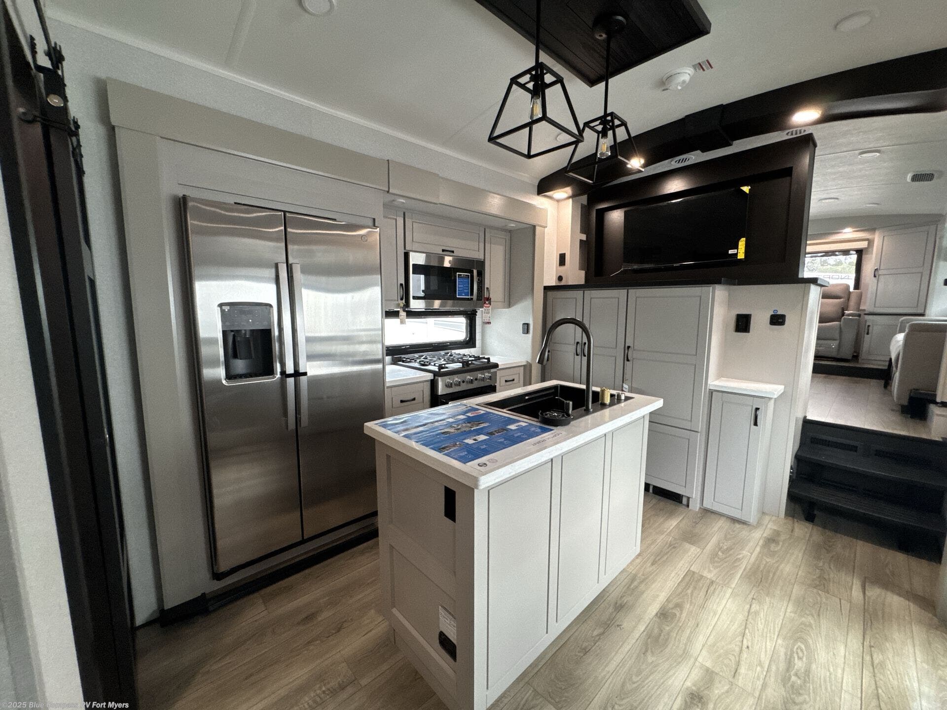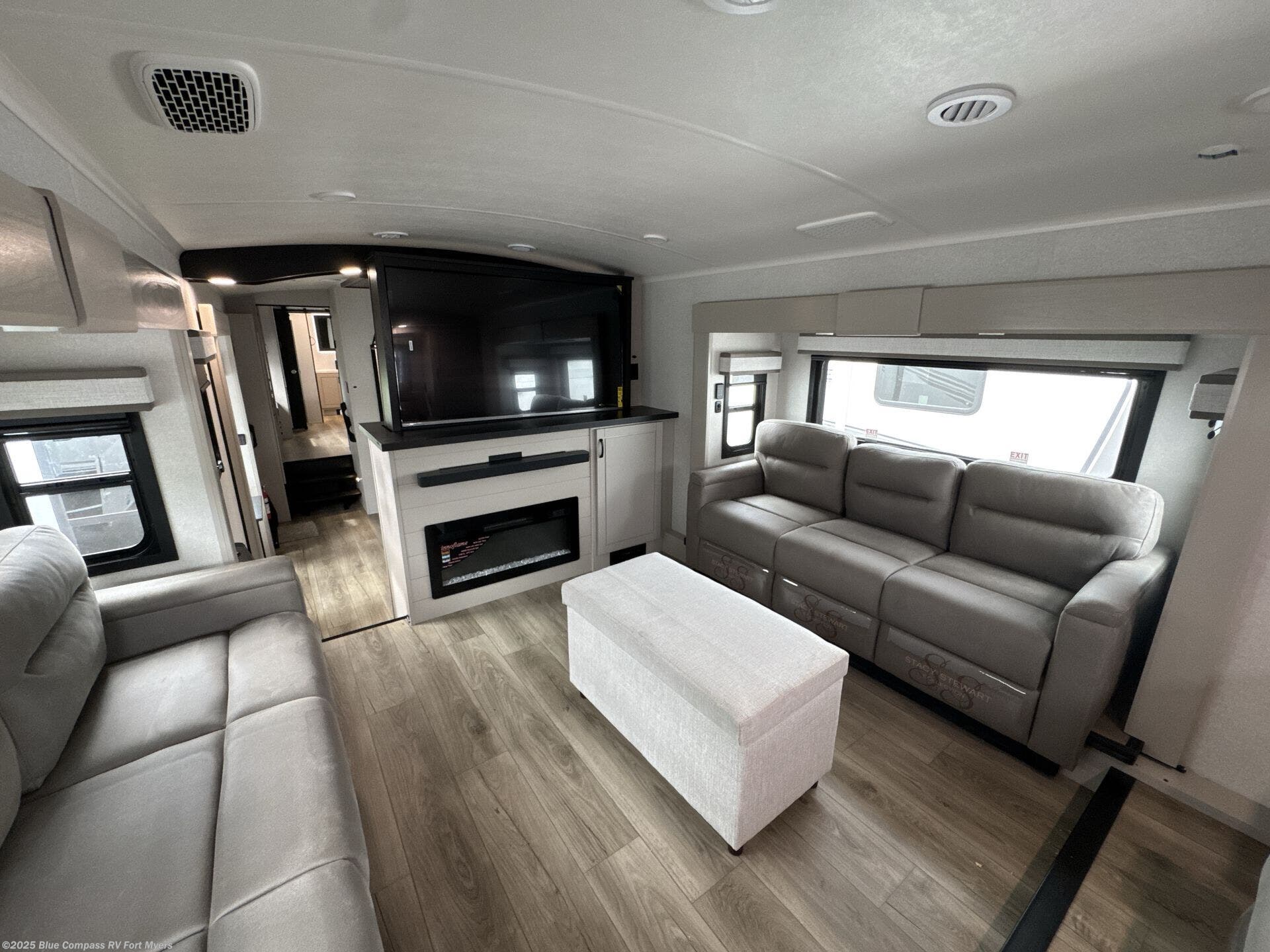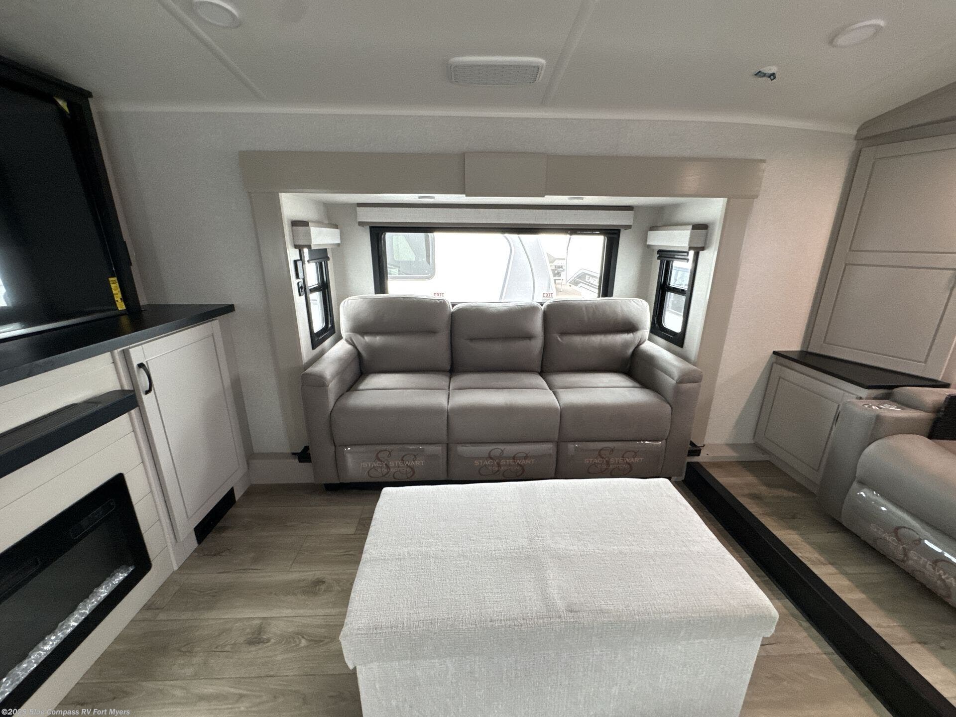 Entertainment can be found throughout this fifth wheel from the front living area with a 50" Smart LED HDTV with fully digital HDMI output and home entertainment system with subwoofer including a fireplace below that you can enjoy while relaxing on theater seats and two tri-fold sofas, a 32" TV in the middle kitchen and there is a bedroom 32" TV. You might even like to add the tailgate TV option along the exterior. Back inside the kitchen, the cook will love the center island, the pantry, the residential refrigerator, and the roll-top dinette. The half bath is a few steps away as an added convenience. The master bedroom includes a king bed slide, a bench, two wardrobes and a sliding door into the bathroom which offers two sinks, a space prepped for a washer/dryer option, and a walk-in shower. And don't forget about the exterior features such as the outside kitchen for more choices when making meals, the storage for your outdoor gear and chairs, and two awnings with integrated LED lighting.