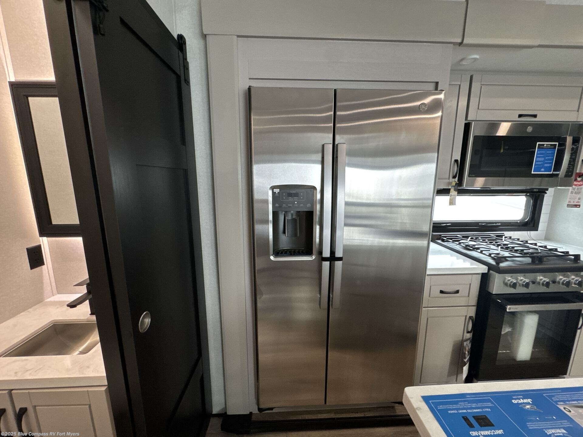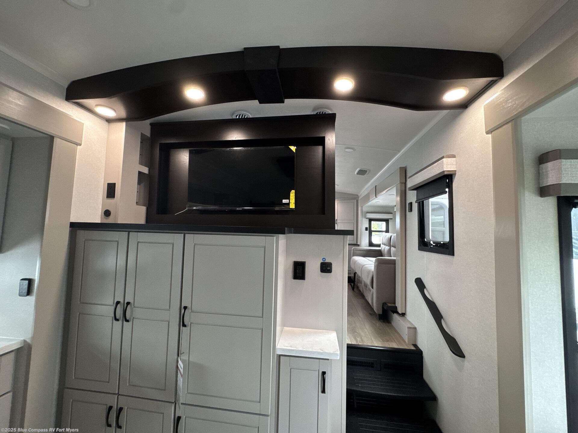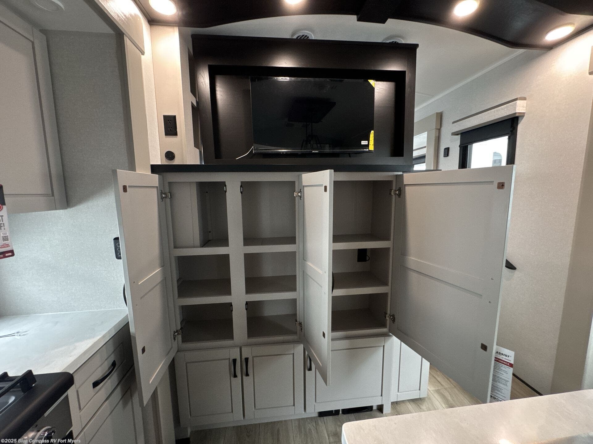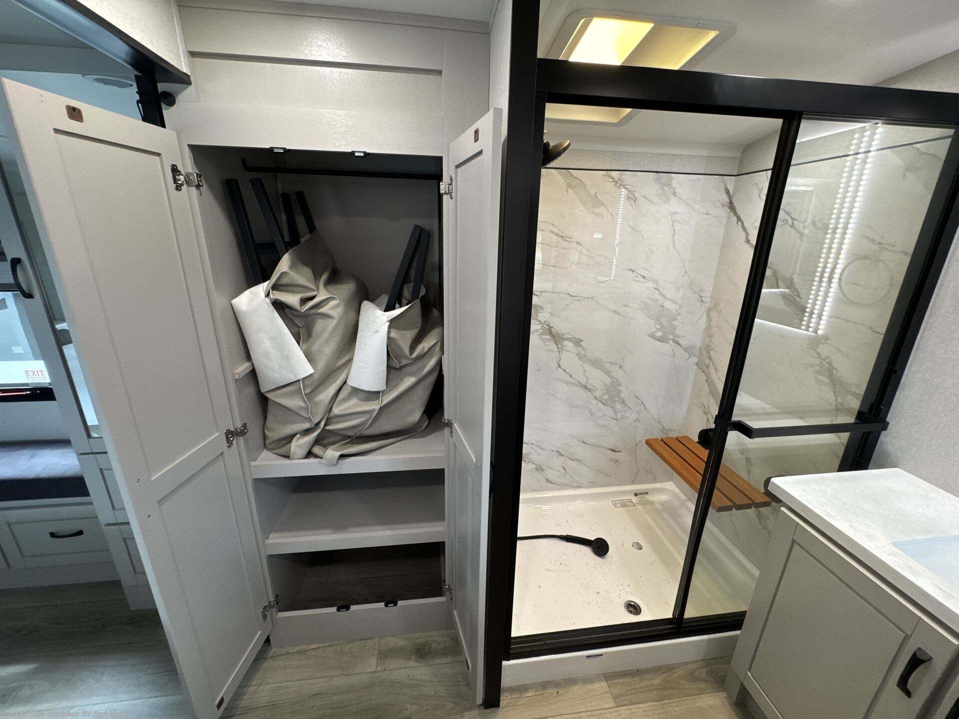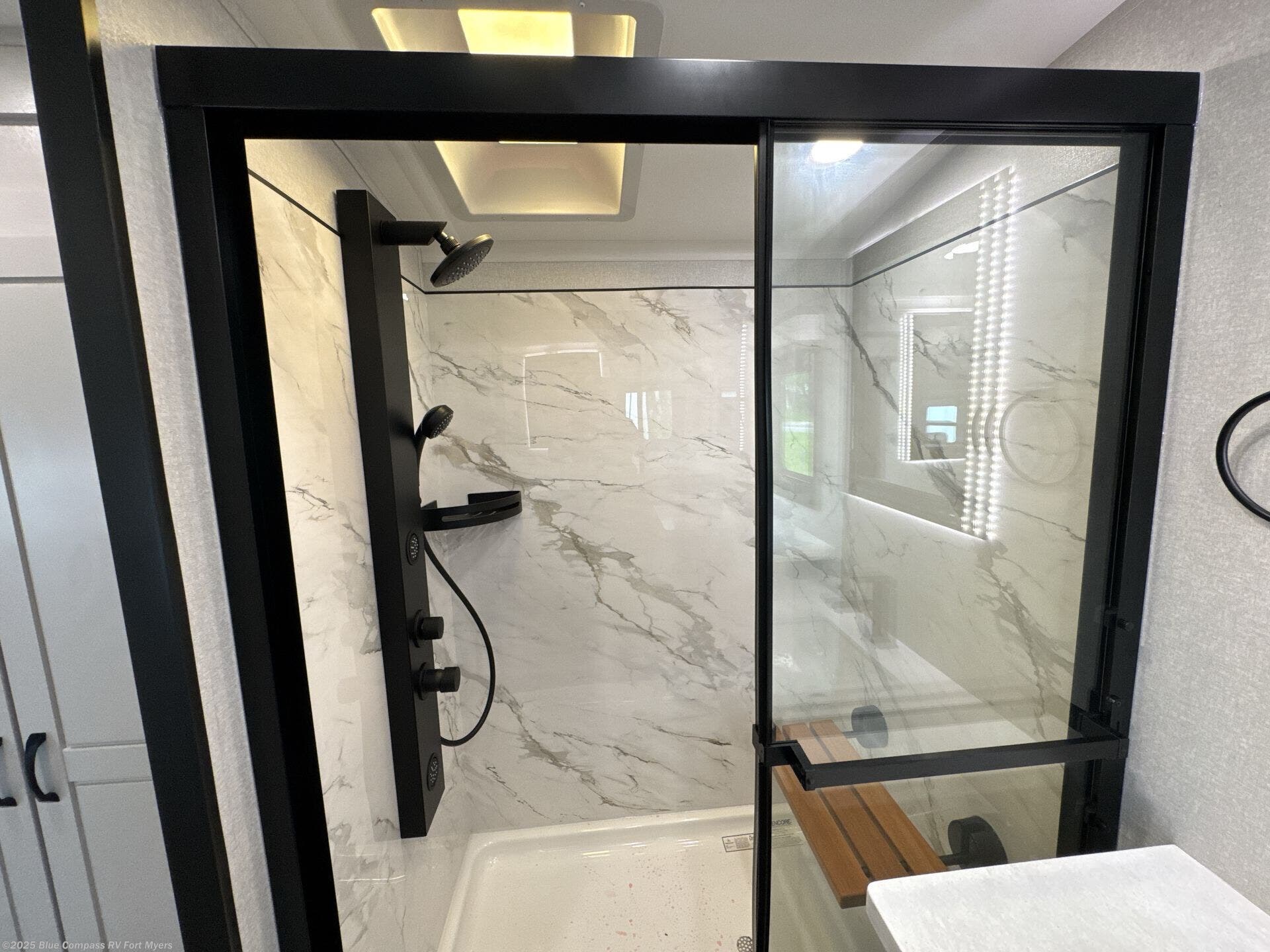 Entertainment can be found throughout this fifth wheel from the front living area with a 50" Smart LED HDTV with fully digital HDMI output and home entertainment system with subwoofer including a fireplace below that you can enjoy while relaxing on theater seats and two tri-fold sofas, a 32" TV in the middle kitchen and there is a bedroom 32" TV. You might even like to add the tailgate TV option along the exterior. Back inside the kitchen, the cook will love the center island, the pantry, the residential refrigerator, and the roll-top dinette. The half bath is a few steps away as an added convenience. The master bedroom includes a king bed slide, a bench, two wardrobes and a sliding door into the bathroom which offers two sinks, a space prepped for a washer/dryer option, and a walk-in shower. And don't forget about the exterior features such as the outside kitchen for more choices when making meals, the storage for your outdoor gear and chairs, and two awnings with integrated LED lighting.