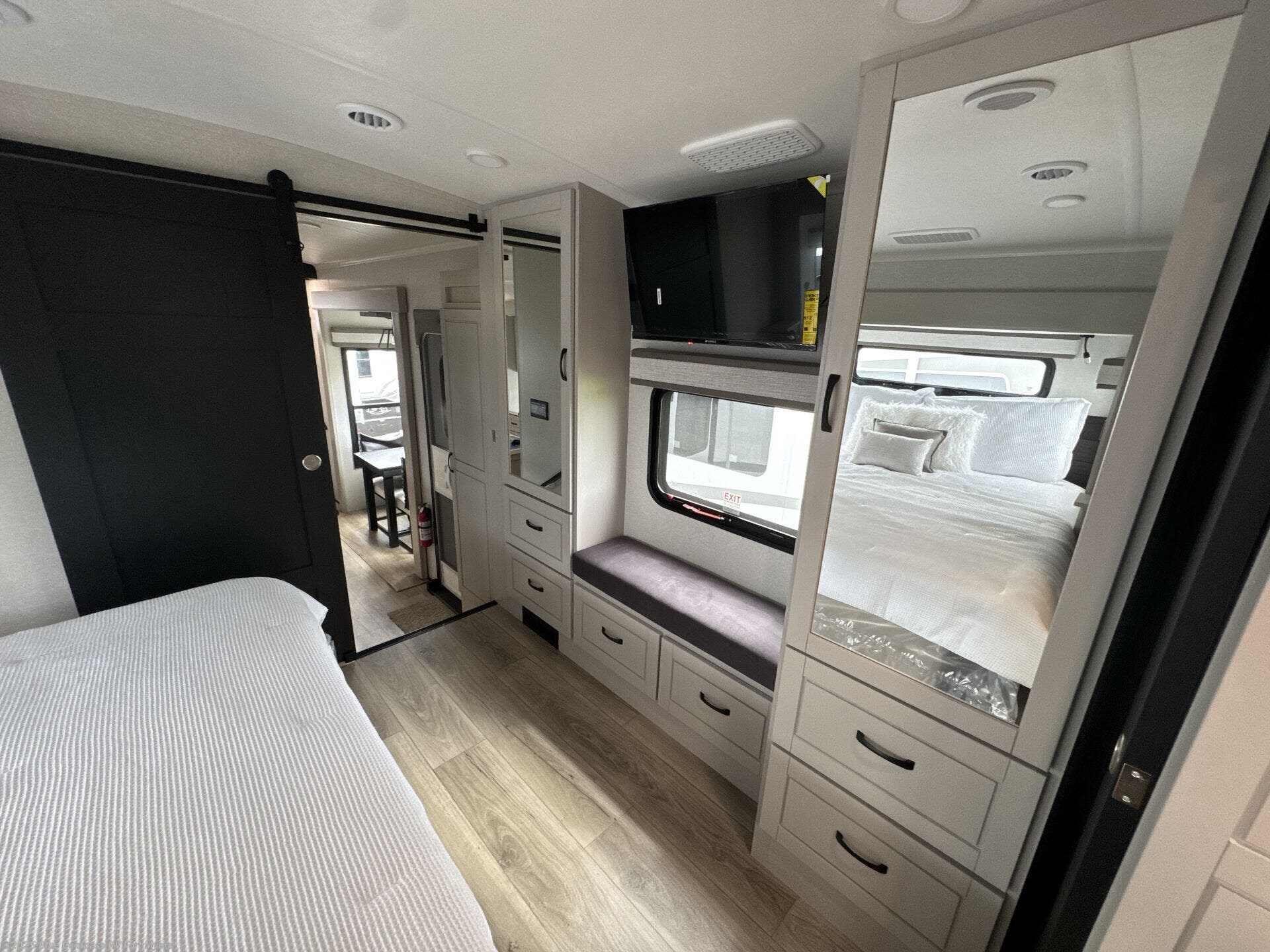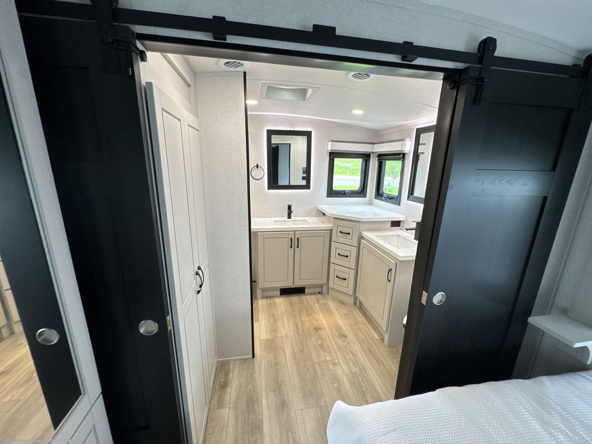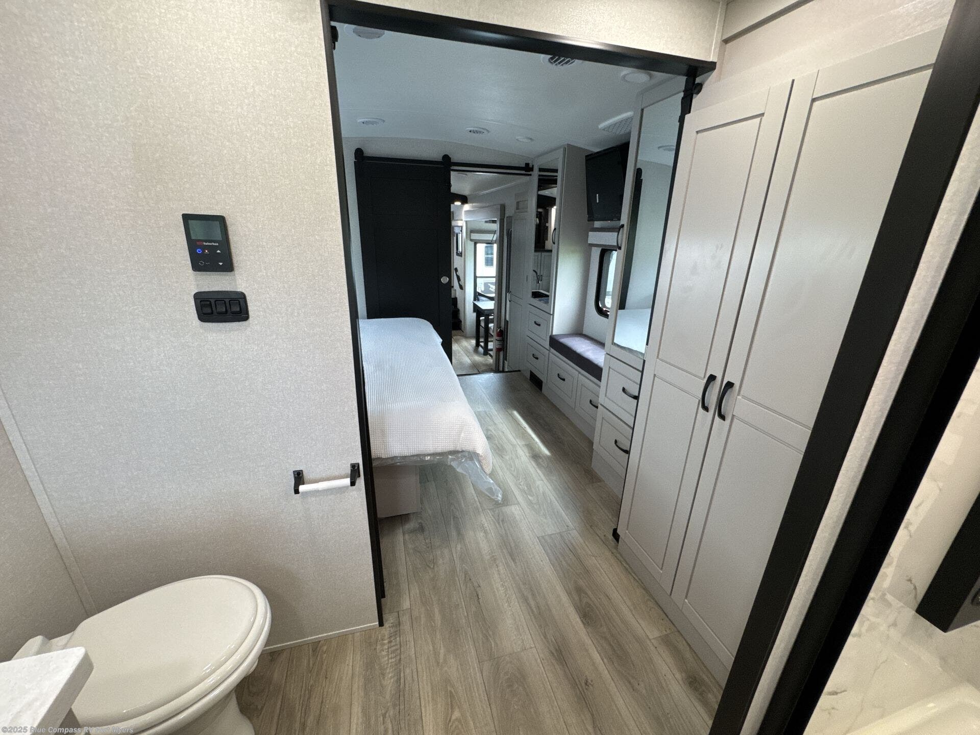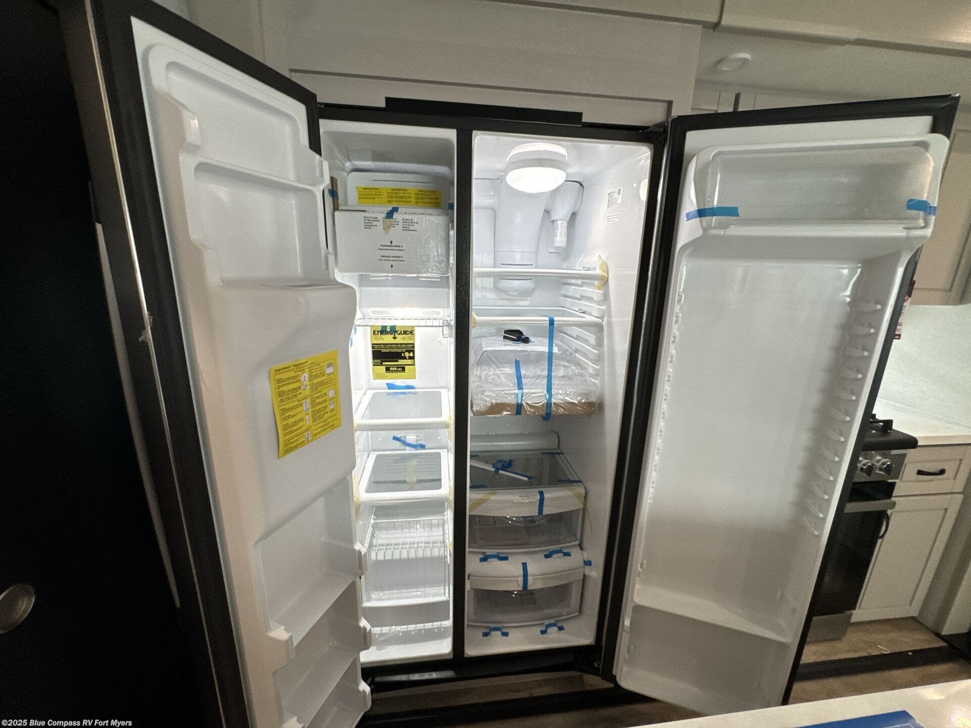 Entertainment can be found throughout this fifth wheel from the front living area with a 50" Smart LED HDTV with fully digital HDMI output and home entertainment system with subwoofer including a fireplace below that you can enjoy while relaxing on theater seats and two tri-fold sofas, a 32" TV in the middle kitchen and there is a bedroom 32" TV. You might even like to add the tailgate TV option along the exterior. Back inside the kitchen, the cook will love the center island, the pantry, the residential refrigerator, and the roll-top dinette. The half bath is a few steps away as an added convenience. The master bedroom includes a king bed slide, a bench, two wardrobes and a sliding door into the bathroom which offers two sinks, a space prepped for a washer/dryer option, and a walk-in shower. And don't forget about the exterior features such as the outside kitchen for more choices when making meals, the storage for your outdoor gear and chairs, and two awnings with integrated LED lighting.