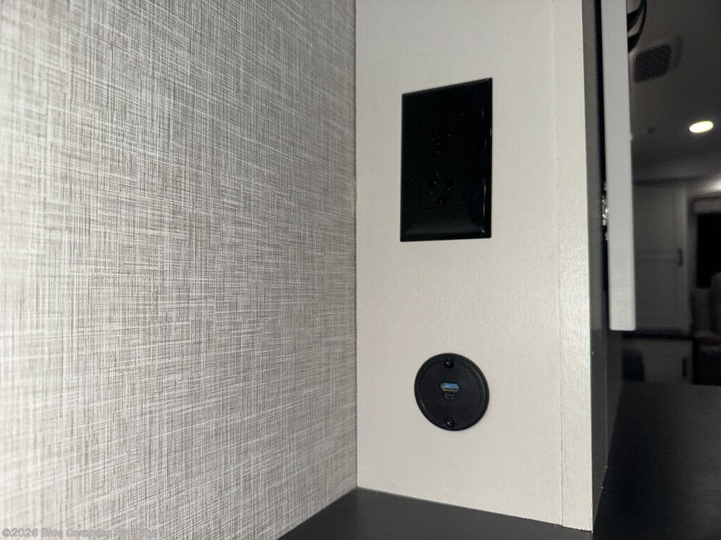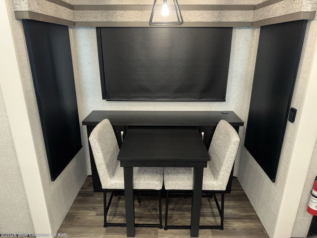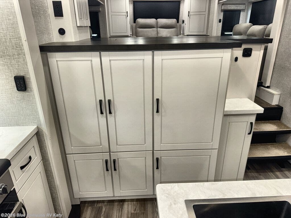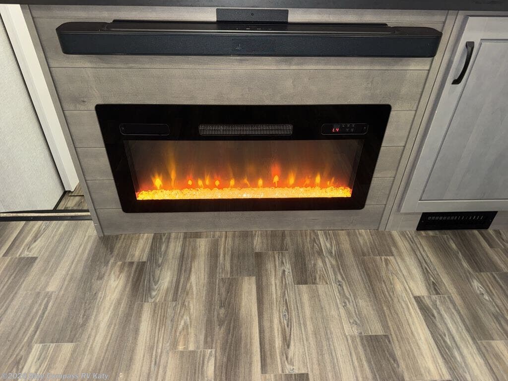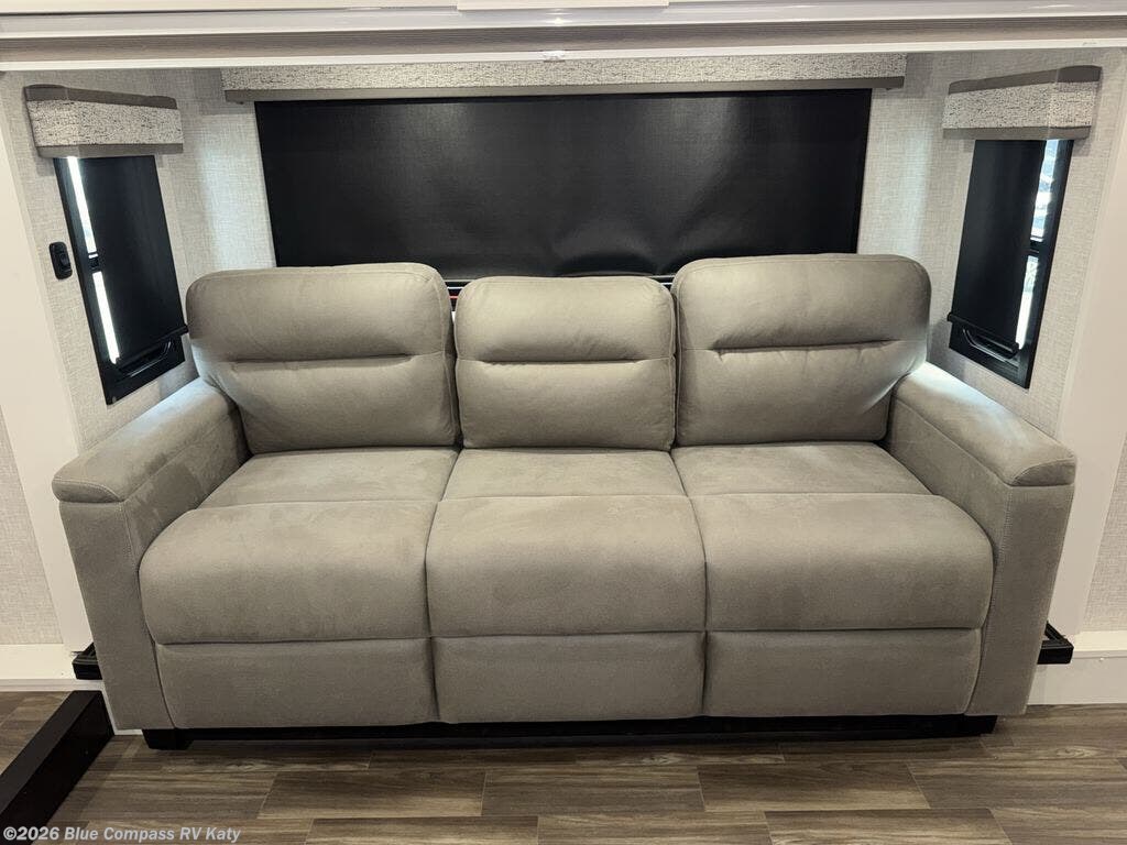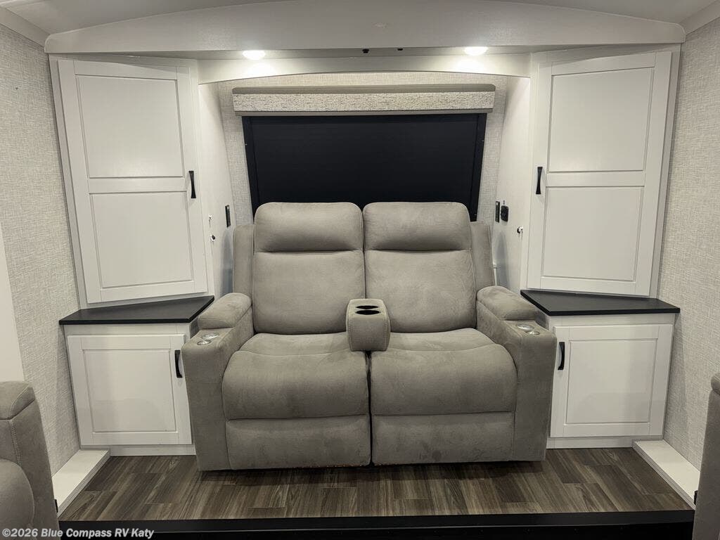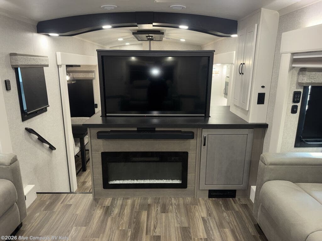 Entertainment can be found throughout this fifth wheel from the front living area with a 50" Smart LED HDTV with fully digital HDMI output and home entertainment system with subwoofer including a fireplace below that you can enjoy while relaxing on theater seats and two tri-fold sofas, a 32" TV in the middle kitchen and there is a bedroom 32" TV. You might even like to add the tailgate TV option along the exterior. Back inside the kitchen, the cook will love the center island, the pantry, the residential refrigerator, and the roll-top dinette. The half bath is a few steps away as an added convenience. The master bedroom includes a king bed slide, a bench, two wardrobes and a sliding door into the bathroom which offers two sinks, a space prepped for a washer/dryer option, and a walk-in shower. And don't forget about the exterior features such as the outside kitchen for more choices when making meals, the storage for your outdoor gear and chairs, and two awnings with integrated LED lighting.