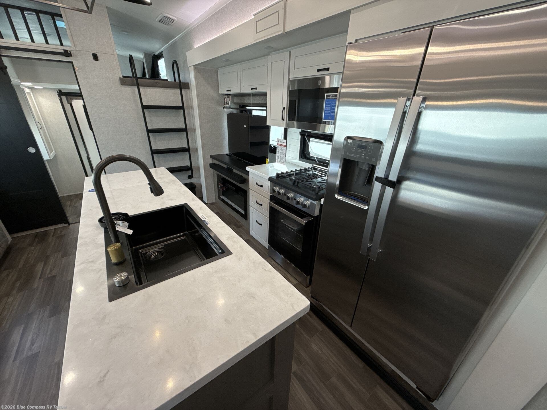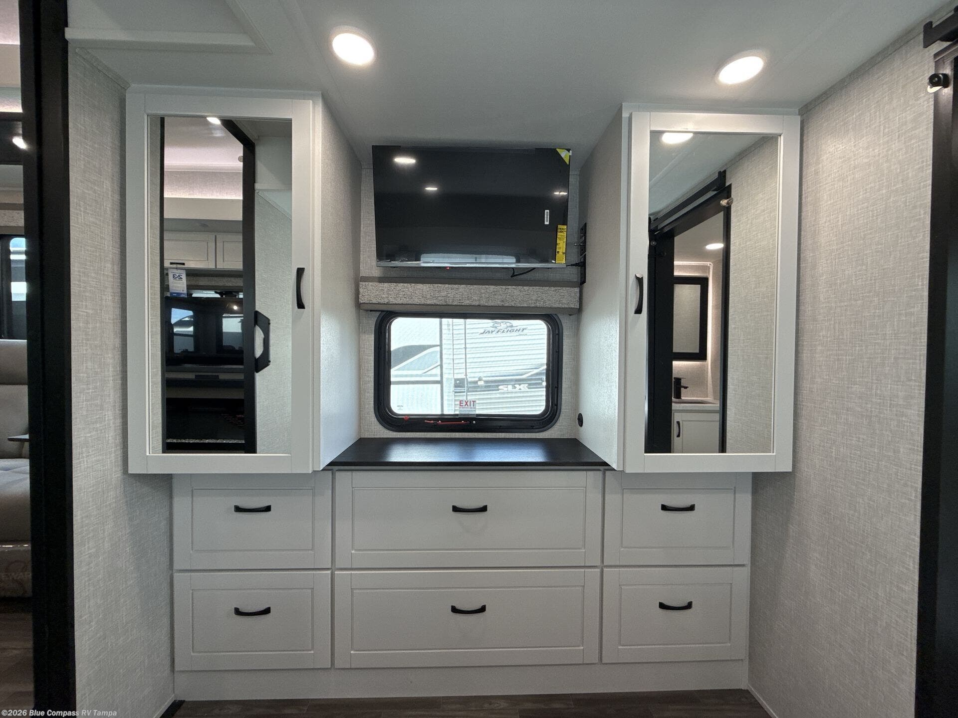 With two bedrooms plus a loft, there aren't many fifth wheels that can sleep as many people in as much comfort as this Jayco North Point! Up front is a private bedroom suite with a king bed and next to the bedroom is a full bathroom, while towards the rear you'll find a second bedroom with a queen bed. This bedroom also has an adjacent bathroom, conveniently all the way to the rear so it has its own entry door to the outside. There's also a loft with three bed mats which will be perfect for kids. In the center of it all you'll find a great living space, with a fully equipped kitchen and plenty of room for everyone to hang out. Relax in the theater seats across from the entertainment center, which features a 50" Smart LED HDTV and a fireplace for cozy evenings.
