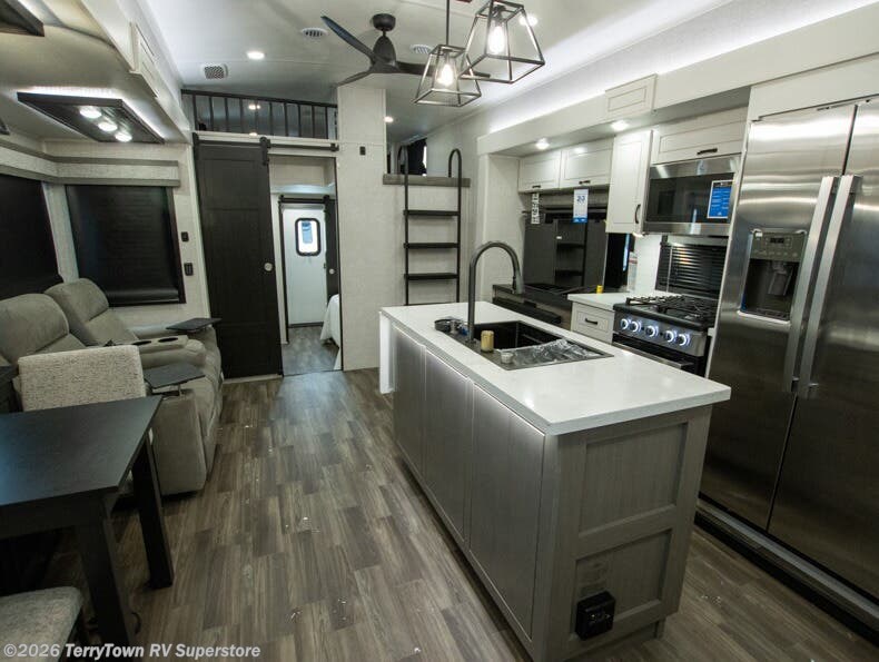 With two bedrooms plus a loft, there aren't many fifth wheels that can sleep as many people in as much comfort as this Jayco North Point! Up front is a private bedroom suite with a king bed and next to the bedroom is a full bathroom, while towards the rear you'll find a second bedroom with a queen bed. This bedroom also has an adjacent bathroom, conveniently all the way to the rear so it has its own entry door to the outside. There's also a loft with three bed mats which will be perfect for kids. In the center of it all you'll find a great living space, with a fully equipped kitchen and plenty of room for everyone to hang out. Relax in the theater seats across from the entertainment center, which features a 50" Smart LED HDTV and a fireplace for cozy evenings.