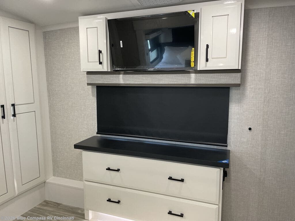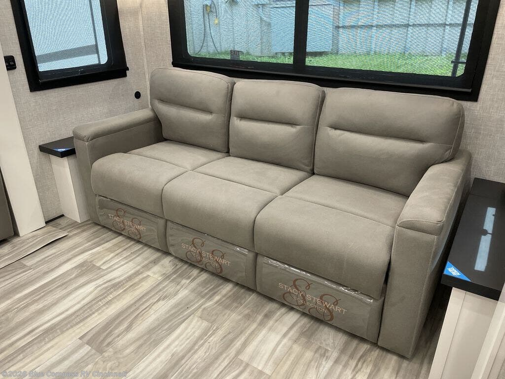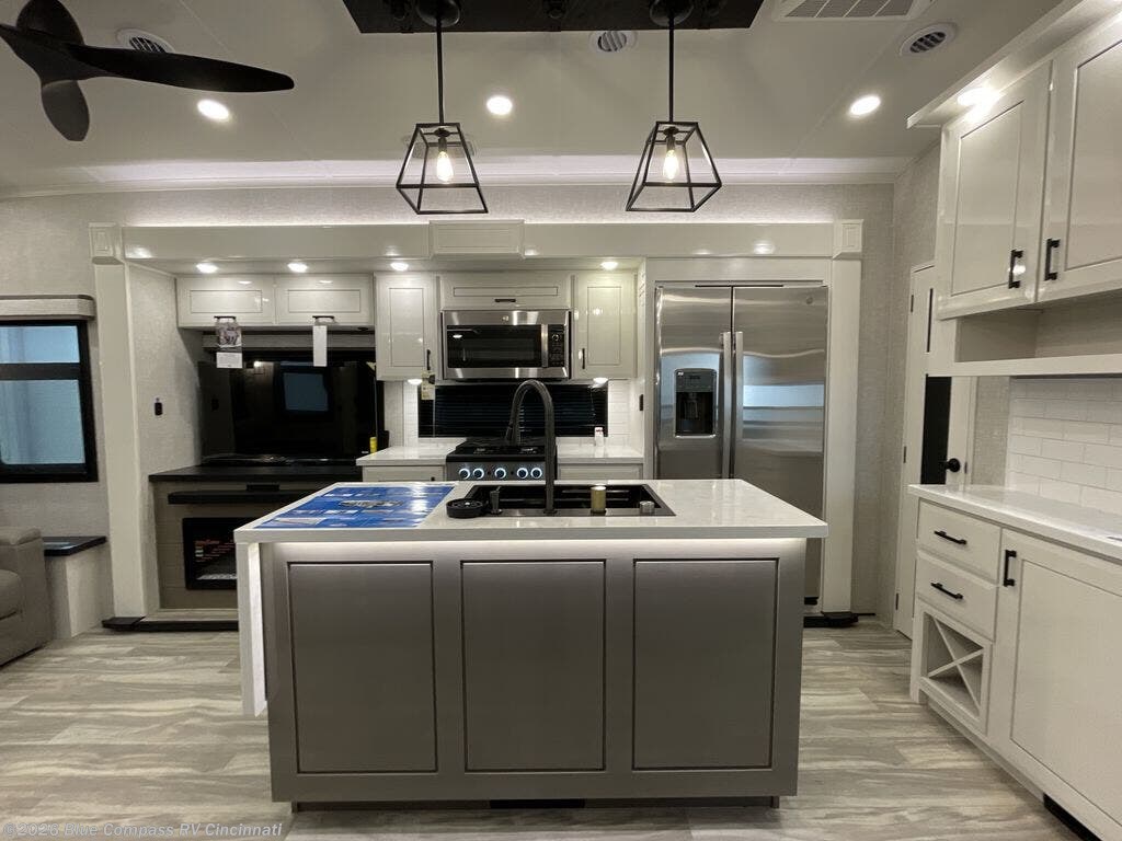 Trips to the lake are made comfortable in this triple slide out fifth wheel. Once you arrive at the campground, set up the two power awnings with LED lights, and there is an exterior TV for the big game. Head inside to relax on the theater seats directly across from the TV and fireplace, or play a game at the roll-top dinette. The chef of your group will love this kitchen with its residential refrigerator, kitchen island, and pantry, plus additional storage for canned goods or paper products. The full bath will allow you to stay clean throughout your trip, and you'll find a residential style backsplash in the bath, plus a walk-in shower. Nothing says luxury like your own king bed slide out in the front bedroom, a large front closet with hamper and drawers for wrinkle-free clothes, and a flip-up dresser featuring a 32" TV!