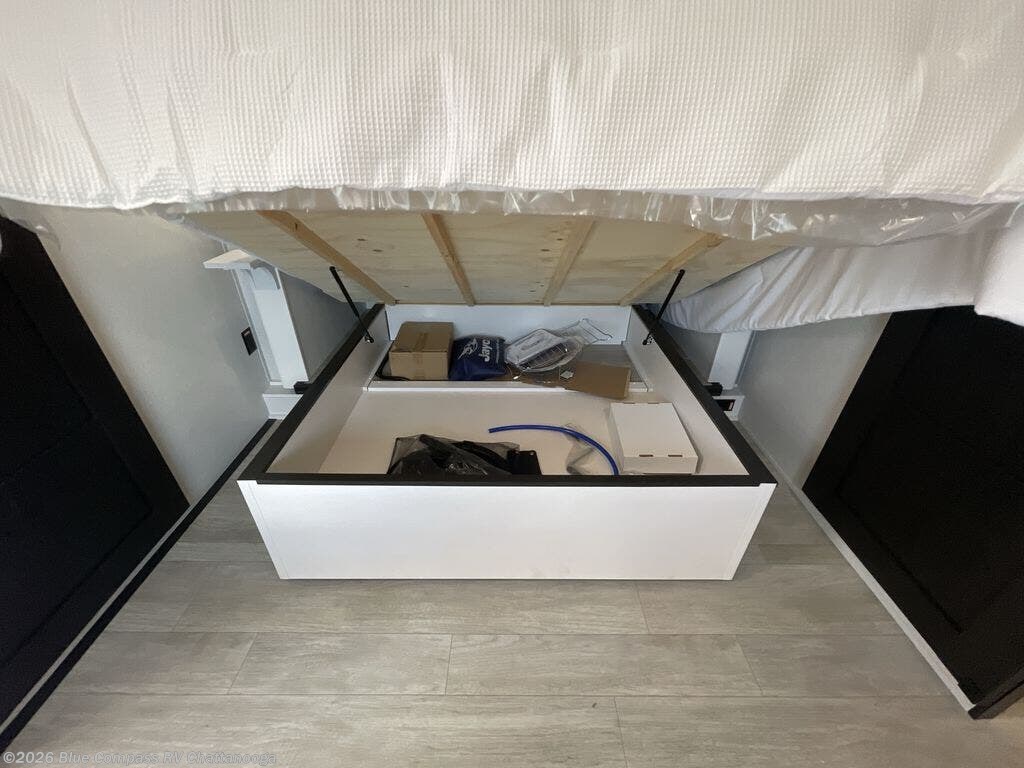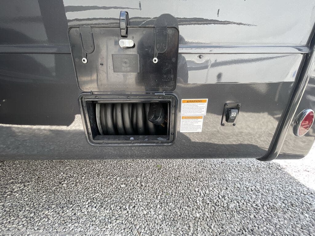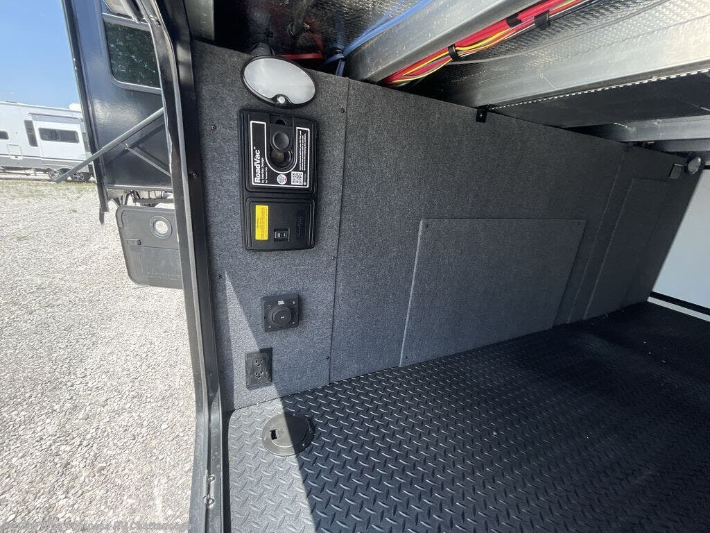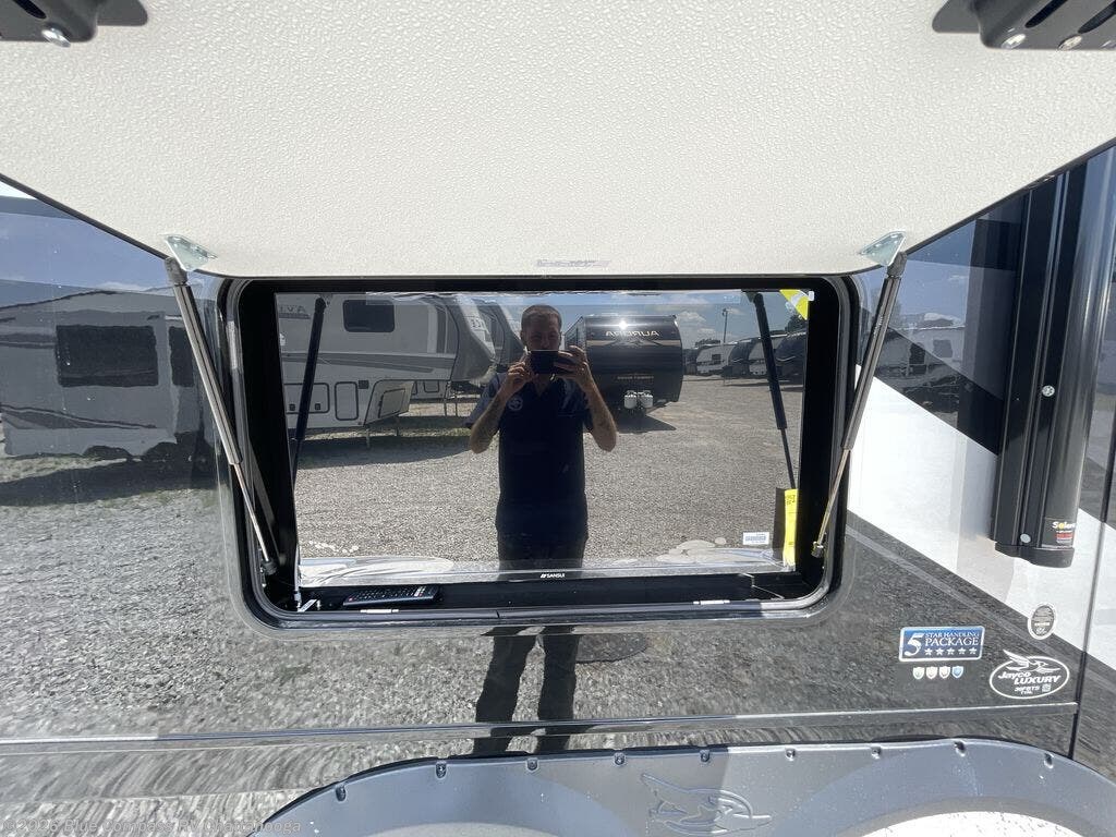 You can't go wrong with this fifth wheel that can sleep four! You will love how much space you have in the main living area thanks to the dual opposing slides, and there is a kitchen island here with a pull-out extension for added prep space. The convenient half bath is right off of the kitchen for quick restroom breaks, and you'll find a shoe garage and a wardrobe just as you enter the unit to keep the RV tidy. Head to the master bedroom for a rest on the king bed slide out, or you may want to watch a show on the 32" bedroom TV. The front master bath may be your favorite feature of this unit. Here, you'll find dual bath sinks, a walk-in shower with a seat, plus a spacious walk-in closet for your clothes. And don't overlook the exterior with its two power awnings, 32" exterior TV, and a Jayport with LP quick connect for your outdoor grill.