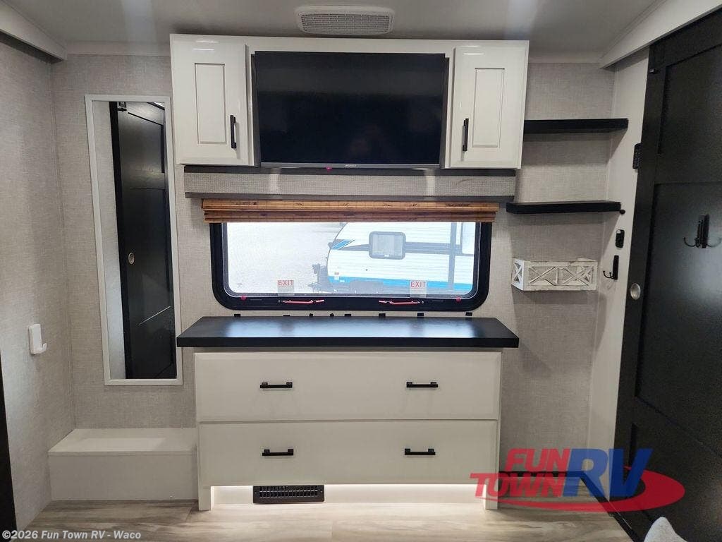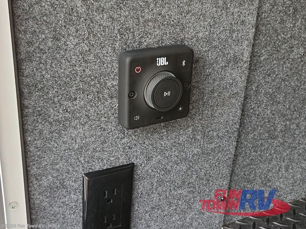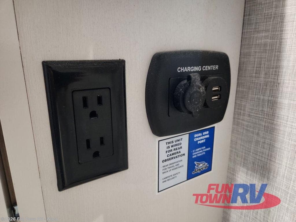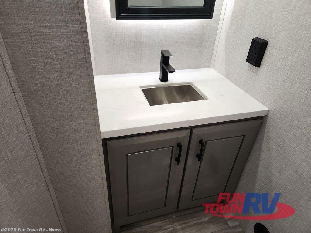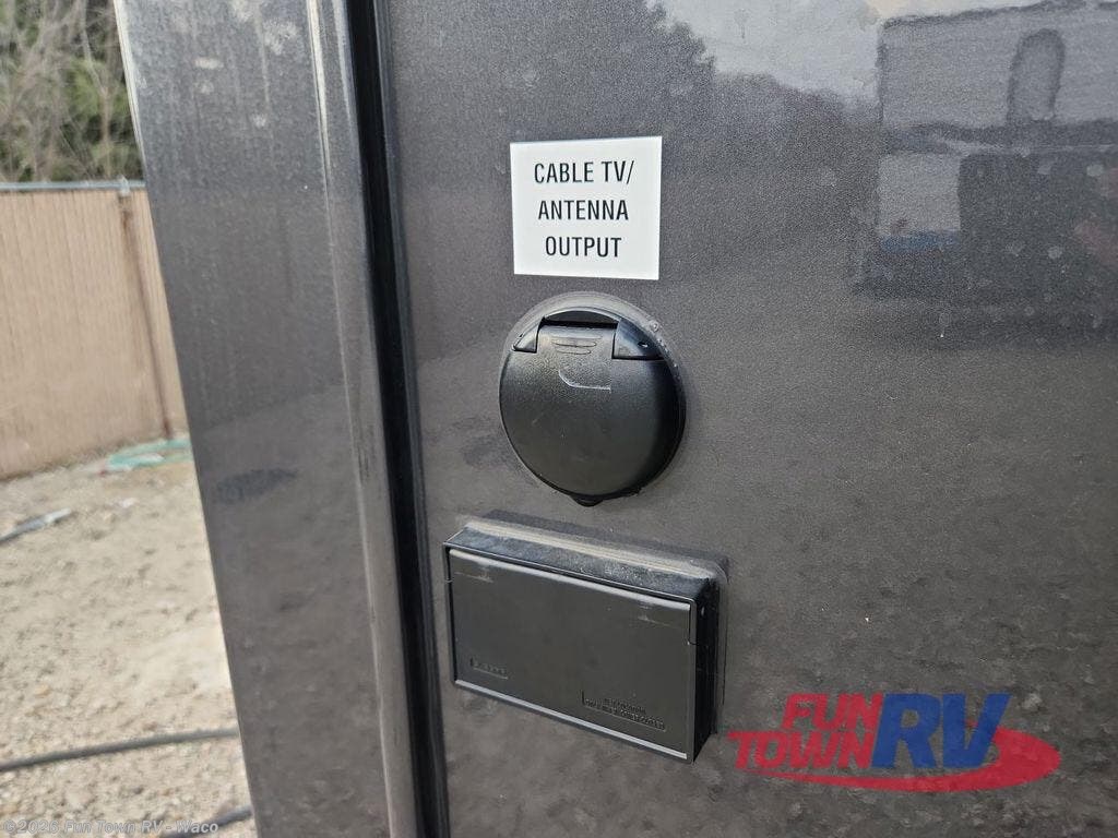 You can't go wrong with this fifth wheel that can sleep four! You will love how much space you have in the main living area thanks to the dual opposing slides, and there is a kitchen island here with a pull-out extension for added prep space. The convenient half bath is right off of the kitchen for quick restroom breaks, and you'll find a shoe garage and a wardrobe just as you enter the unit to keep the RV tidy. Head to the master bedroom for a rest on the king bed slide out, or you may want to watch a show on the 32" bedroom TV. The front master bath may be your favorite feature of this unit. Here, you'll find dual bath sinks, a walk-in shower with a seat, plus a spacious walk-in closet for your clothes. And don't overlook the exterior with its two power awnings, 32" exterior TV, and a Jayport with LP quick connect for your outdoor grill.
