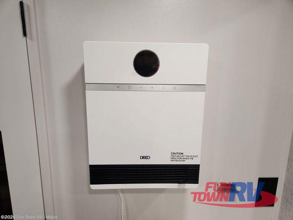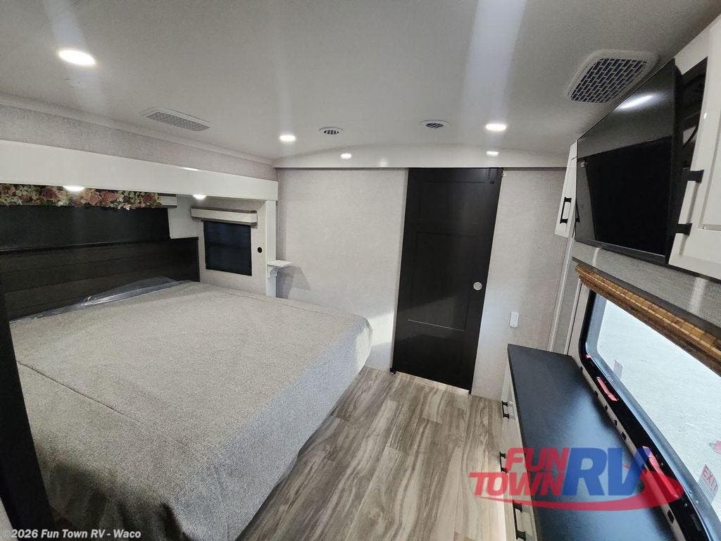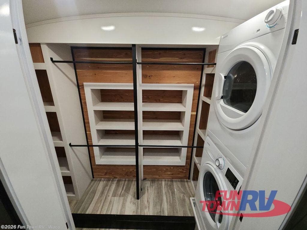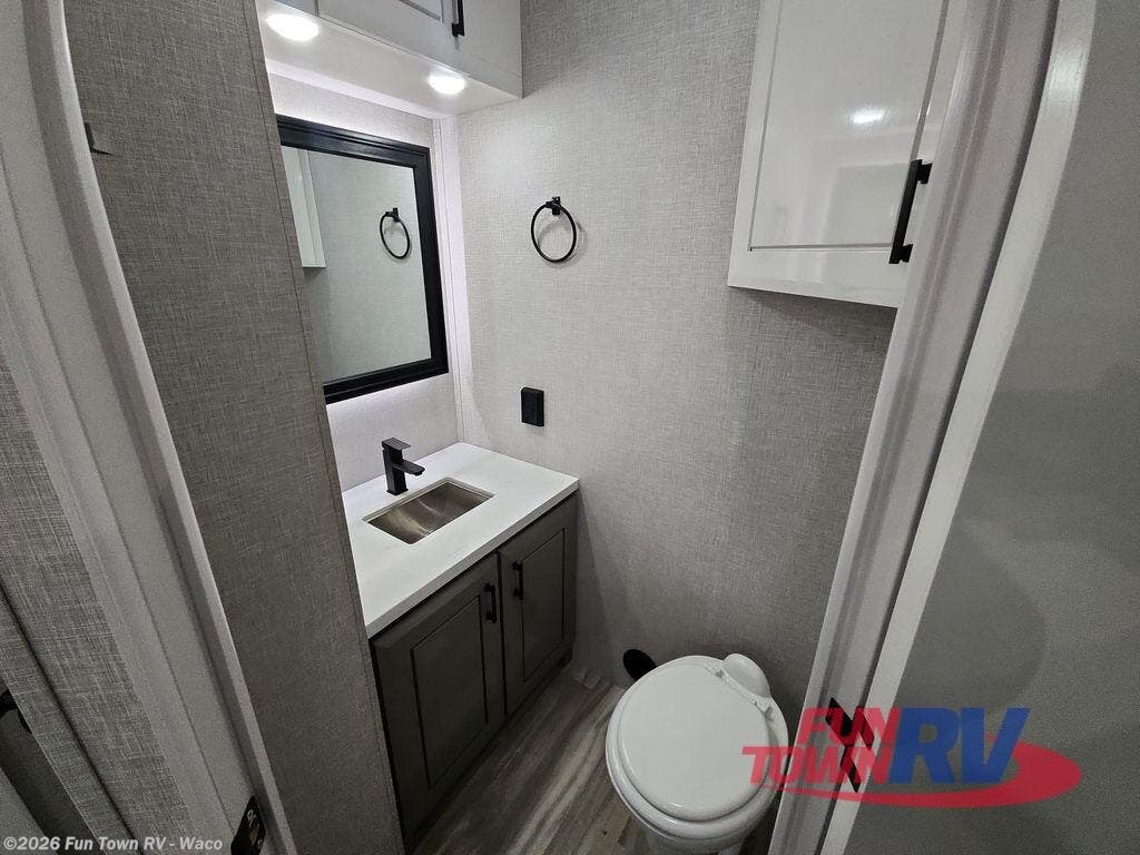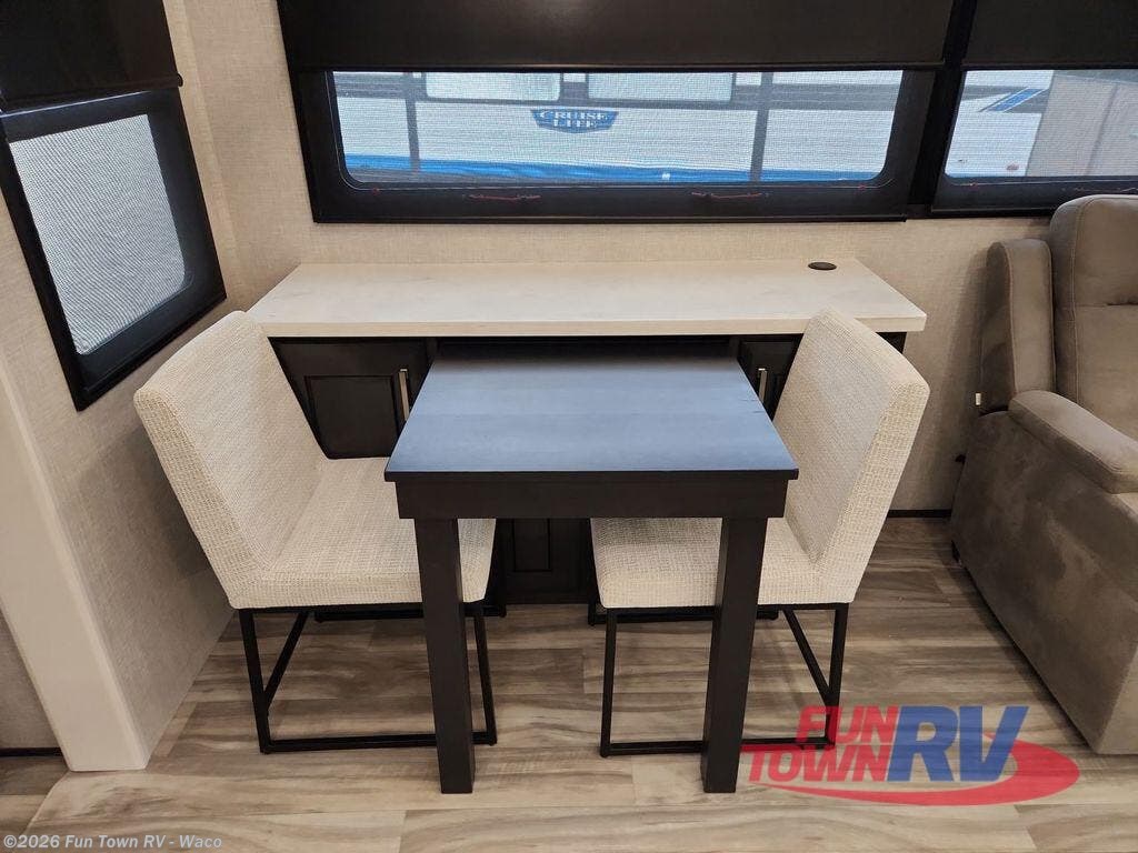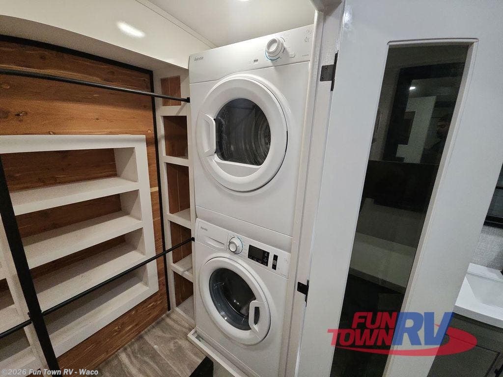 You can't go wrong with this fifth wheel that can sleep four! You will love how much space you have in the main living area thanks to the dual opposing slides, and there is a kitchen island here with a pull-out extension for added prep space. The convenient half bath is right off of the kitchen for quick restroom breaks, and you'll find a shoe garage and a wardrobe just as you enter the unit to keep the RV tidy. Head to the master bedroom for a rest on the king bed slide out, or you may want to watch a show on the 32" bedroom TV. The front master bath may be your favorite feature of this unit. Here, you'll find dual bath sinks, a walk-in shower with a seat, plus a spacious walk-in closet for your clothes. And don't overlook the exterior with its two power awnings, 32" exterior TV, and a Jayport with LP quick connect for your outdoor grill.