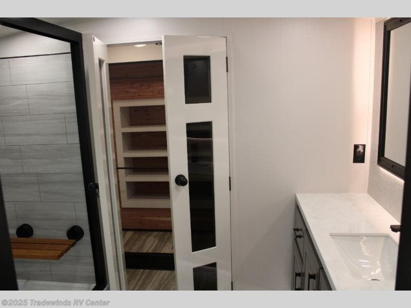 Triples slides, a desk/coffee bar, fireplace, and a huge master bath in front all indicate the kind of vacation you will experience in this Pinnacle Fifth Wheel! As you enter, a convenient half bath is located straight ahead. Slightly to your left, a nice seating area for gathering with family or friends to relax and watch TV, enjoy the fireplace while reading a book or watching a movie, and the dining table with chairs. The dinette slide also houses a 21 cu. ft. residential refrigerator and pantry. The rear kitchen features a u-shaped counter, all the appliances you need to cook like at home, even a pull-out butcher block space for chopping up your veggies. Back through and up the steps to your right in front, the master bedroom will make you feel like royalty with its king bed, plus luxurious full rear bath. A huge vanity with dual bath sinks will allow you both to get ready at the same time, plus there is a walk-in shower with a seat for added convenience. Speaking of walk-in, you will also love the spacious walk-in closet that includes washer/dryer prep.